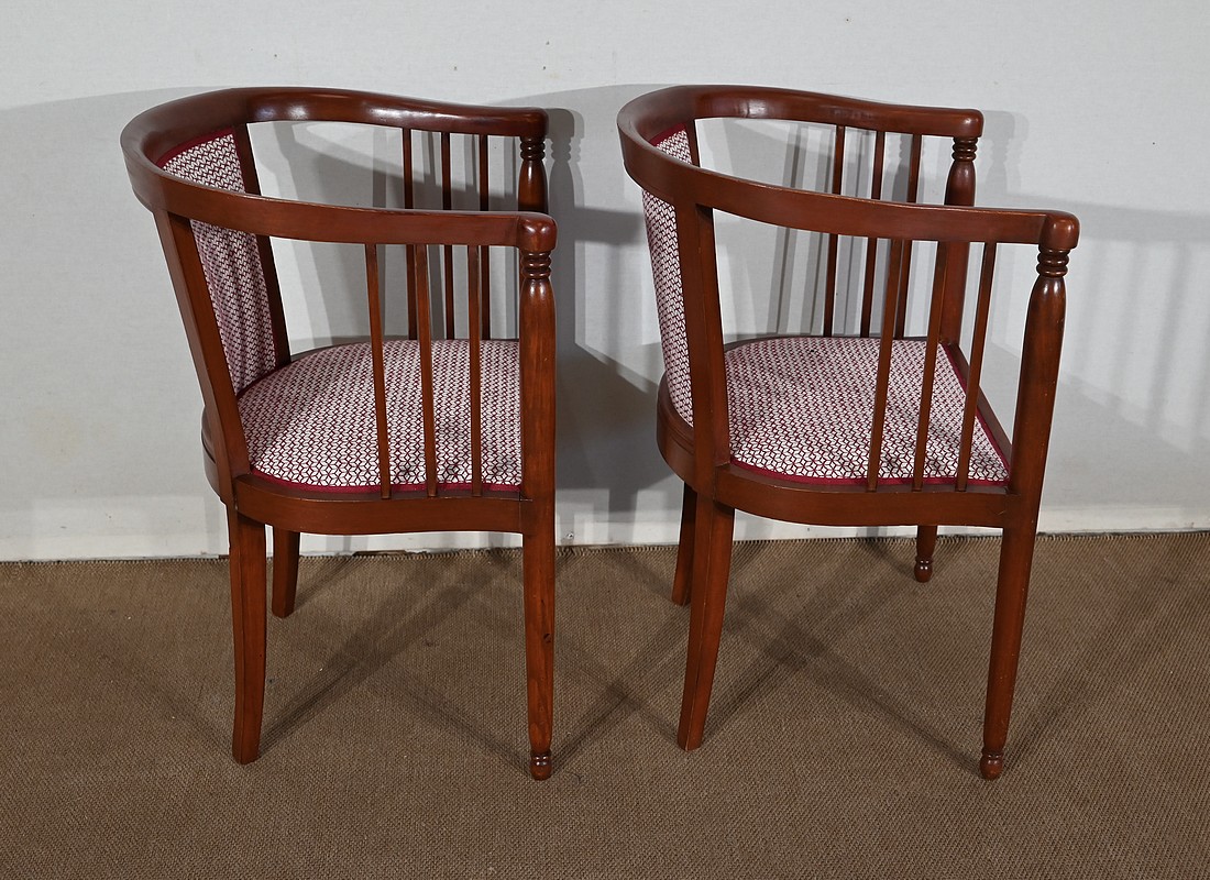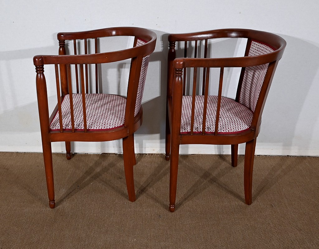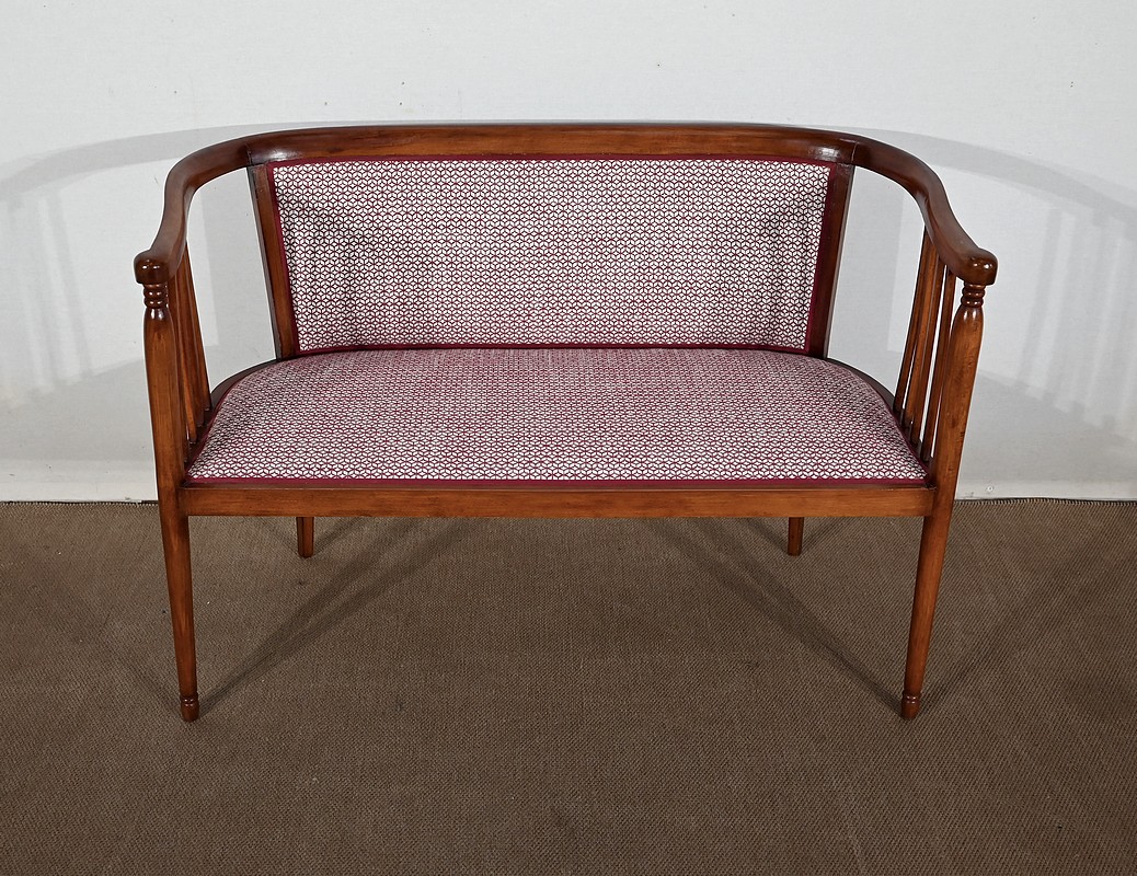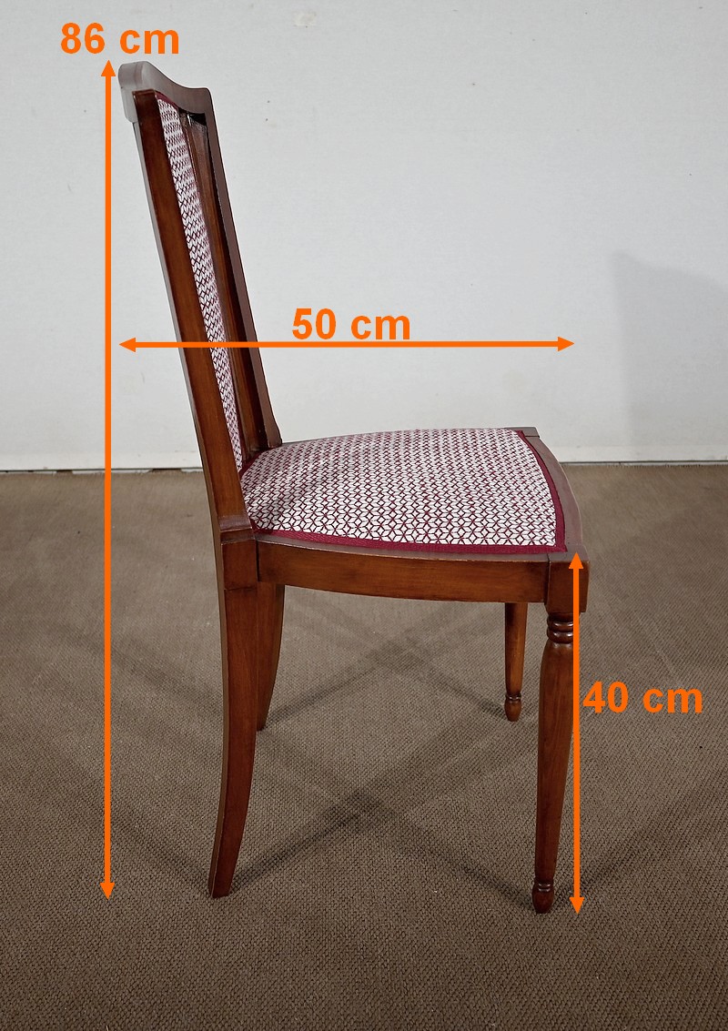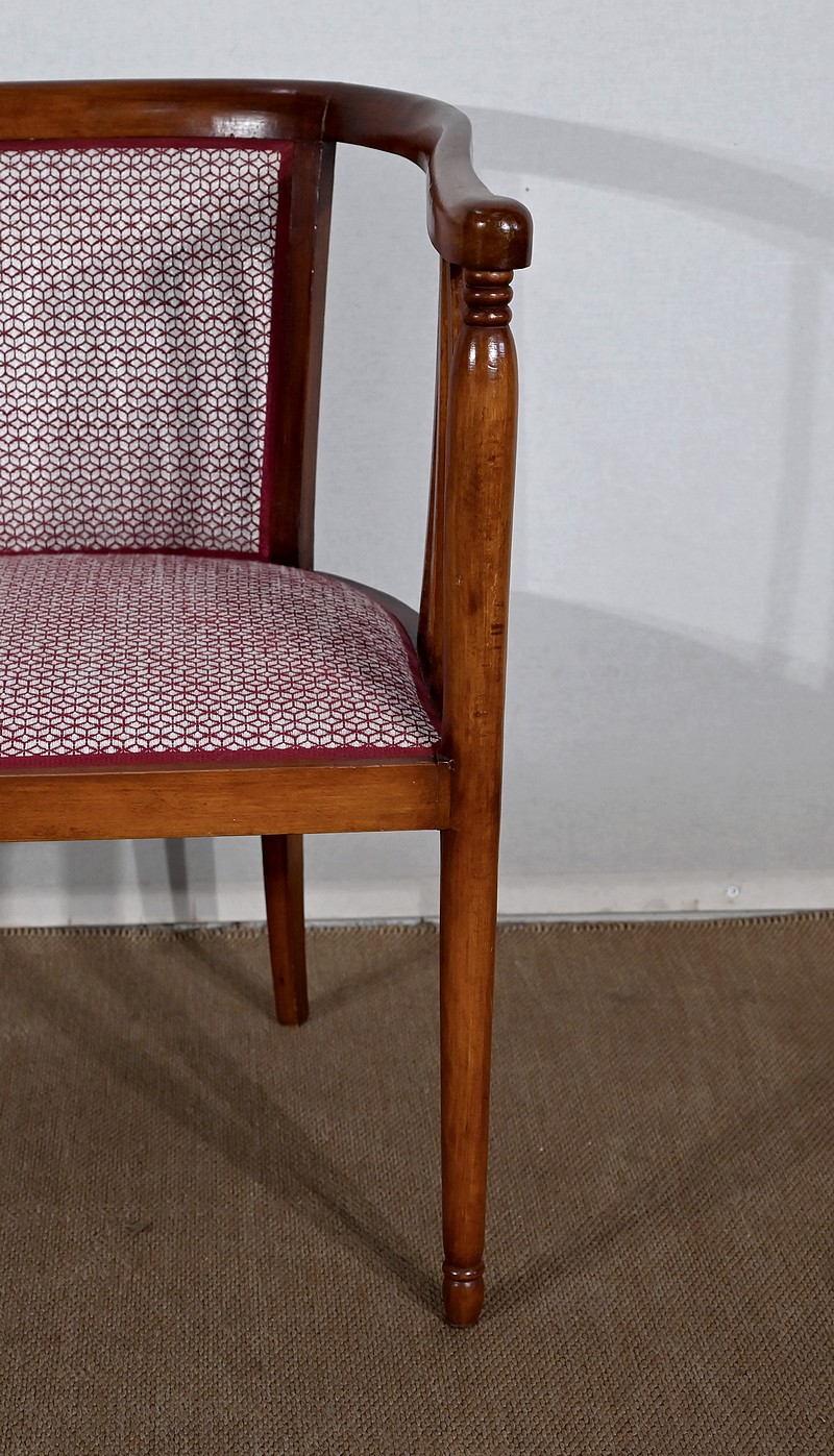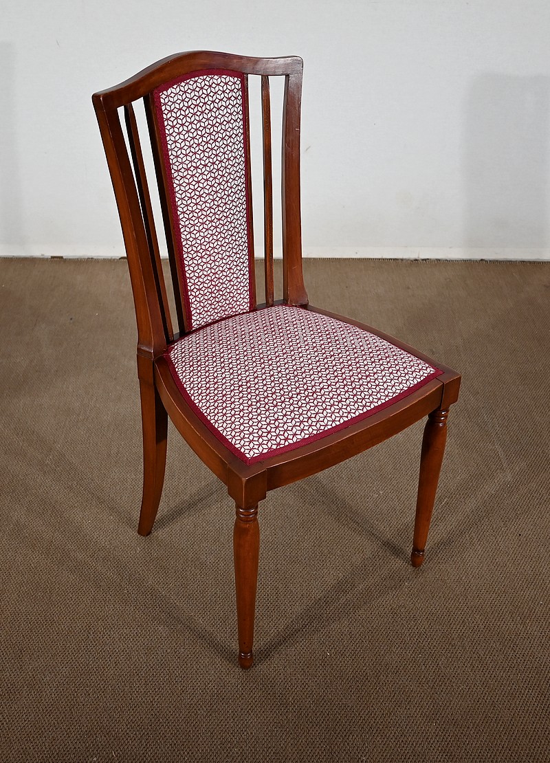 Les dossiers, par leur forme, ainsi que les assises, sont confortables. Chacun des cinq sièges de cet ensemble a bénéficié d’une restauration complète. La tapisserie refaite, avec sangles et crin, est munie d’un tissu aux motifs géométriques blancs et bordeaux, et d’un galon plat.
