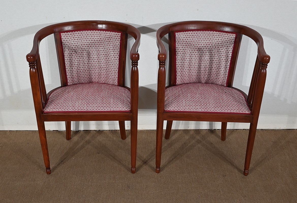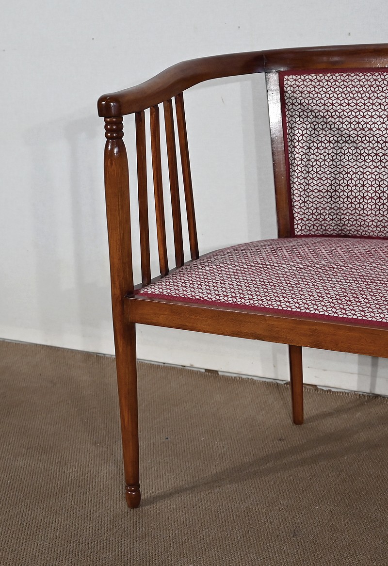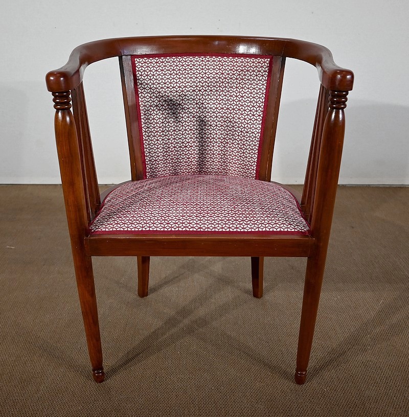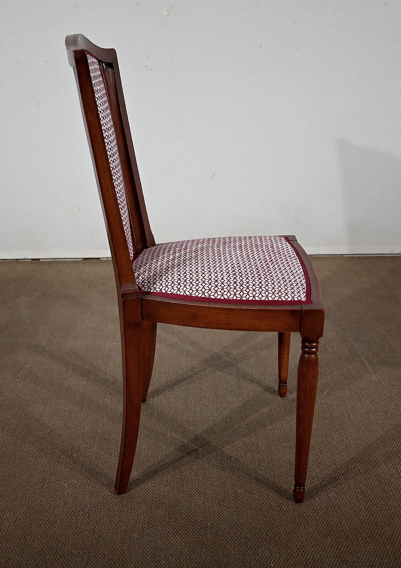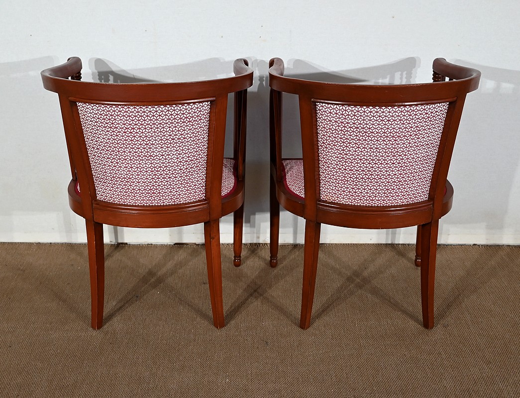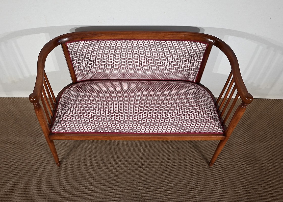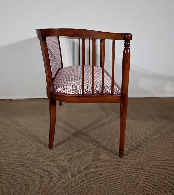Les dossiers, par leur forme, ainsi que les assises, sont confortables. Chacun des cinq sièges de cet ensemble a bénéficié d’une restauration complète. La tapisserie refaite, avec sangles et crin, est munie d’un tissu aux motifs géométriques blancs et bordeaux, et d’un galon plat.