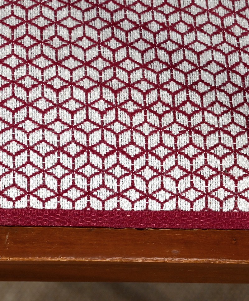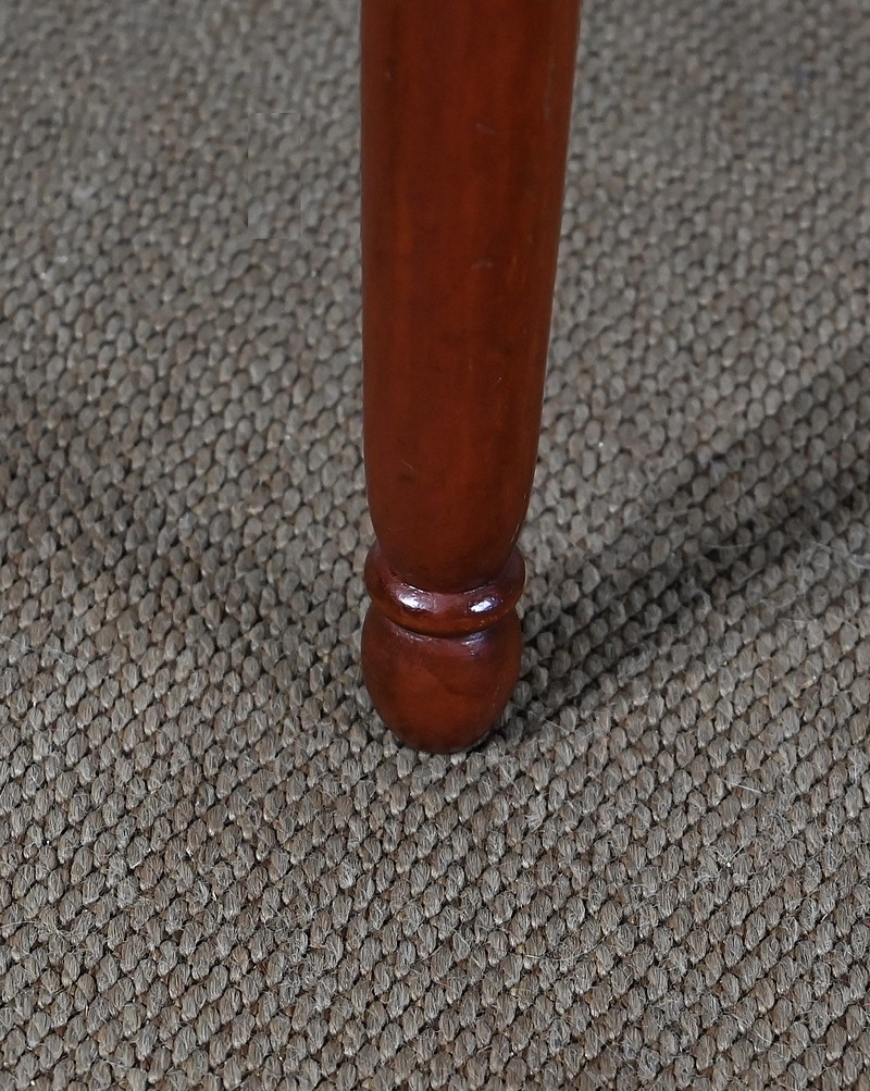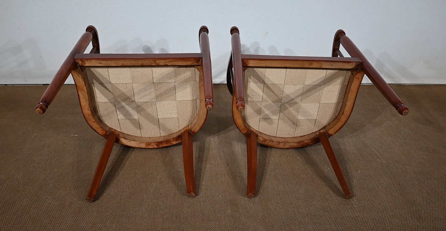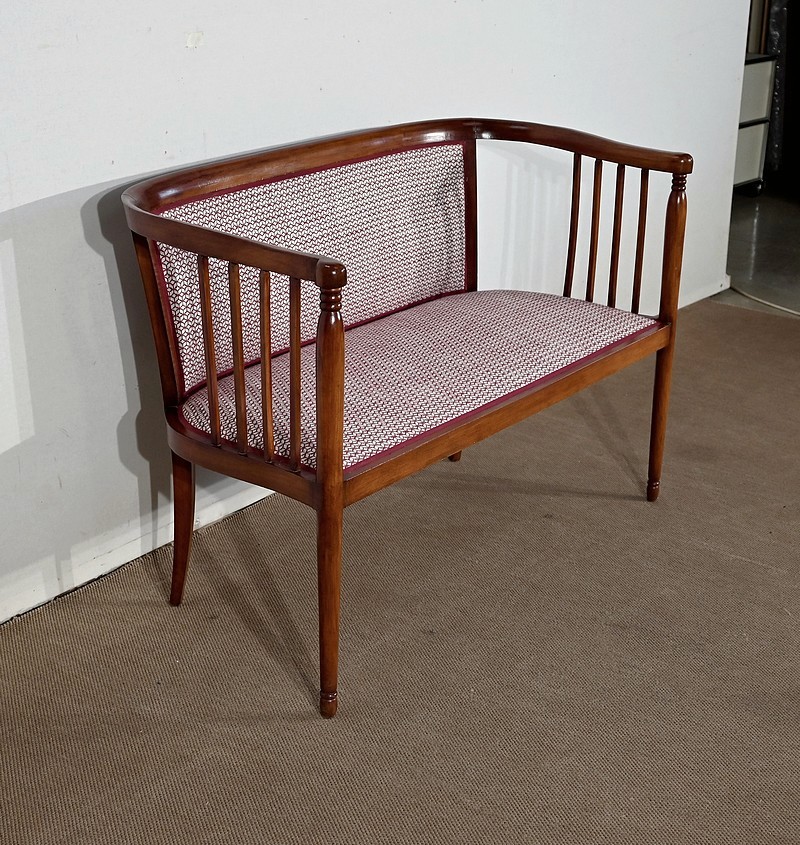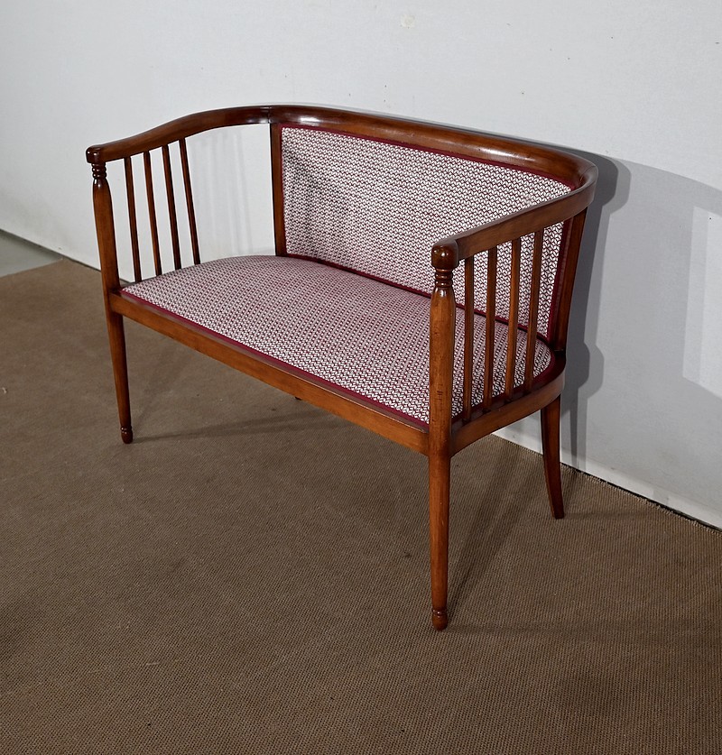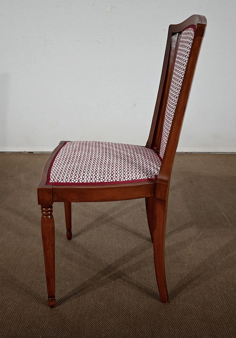 Les dossiers, par leur forme, ainsi que les assises, sont confortables. Chacun des cinq sièges de cet ensemble a bénéficié d’une restauration complète. La tapisserie refaite, avec sangles et crin, est munie d’un tissu aux motifs géométriques blancs et bordeaux, et d’un galon plat.