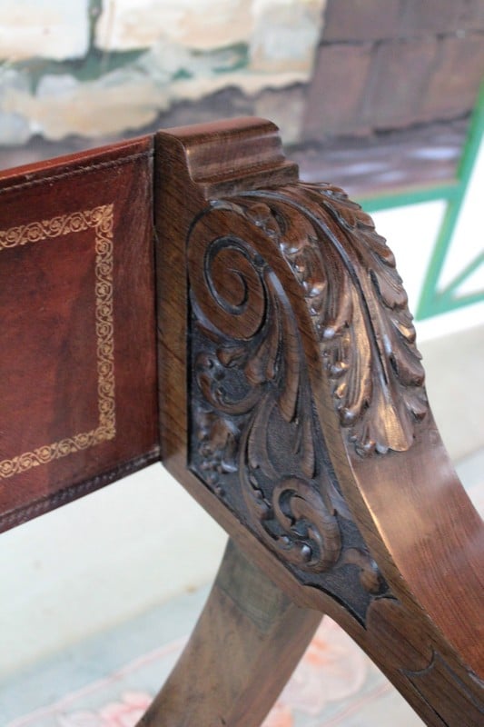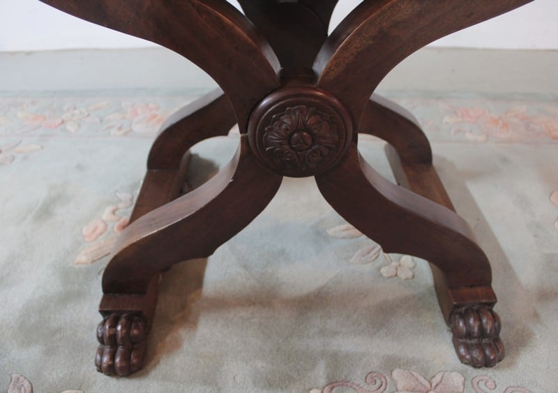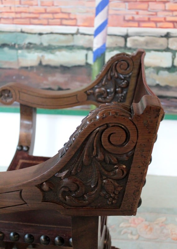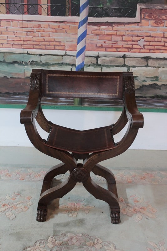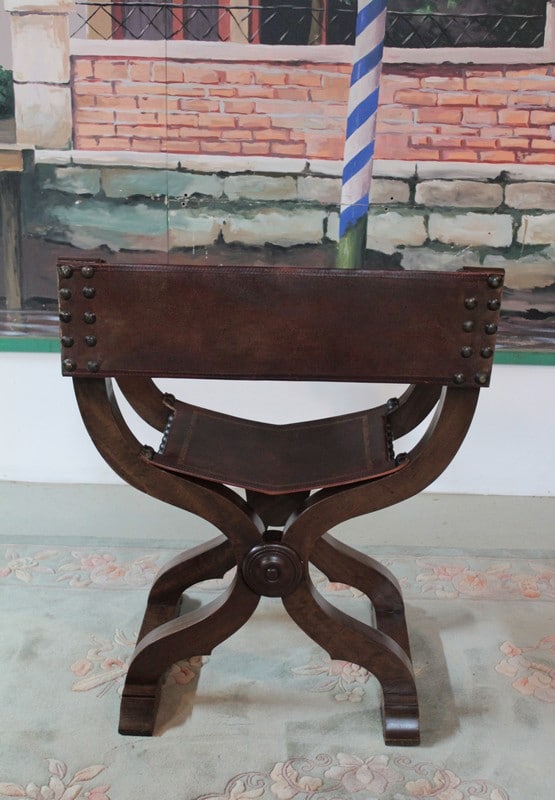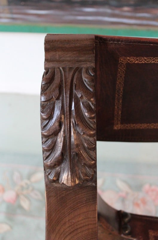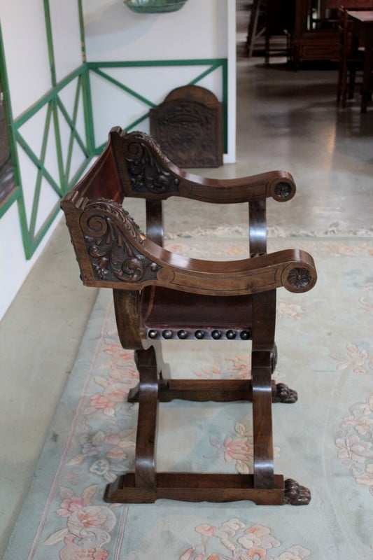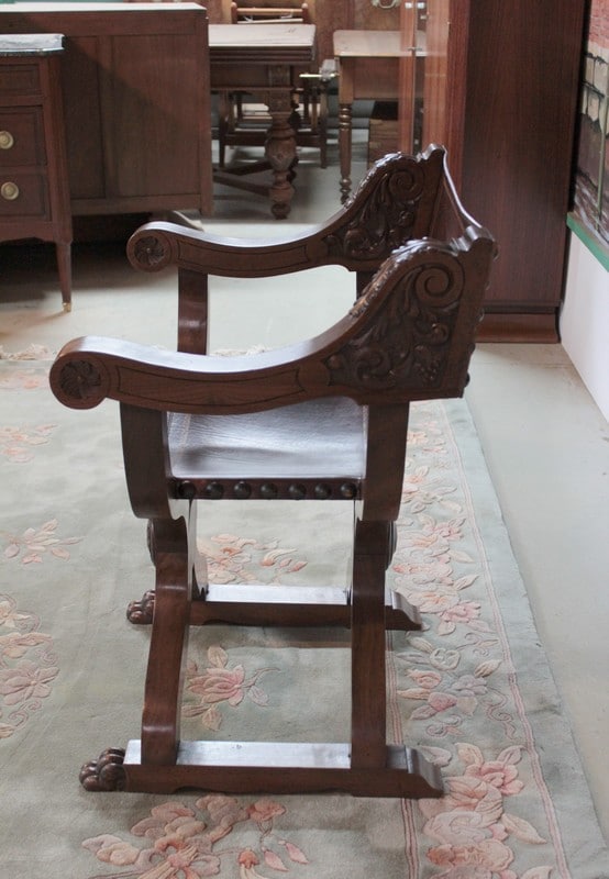 Fauteuil ‘Curule’ en noyer dans le goût Renaissance. Assise et dossier en cuir épais. Piètement articulé en x se terminant par des griffes.