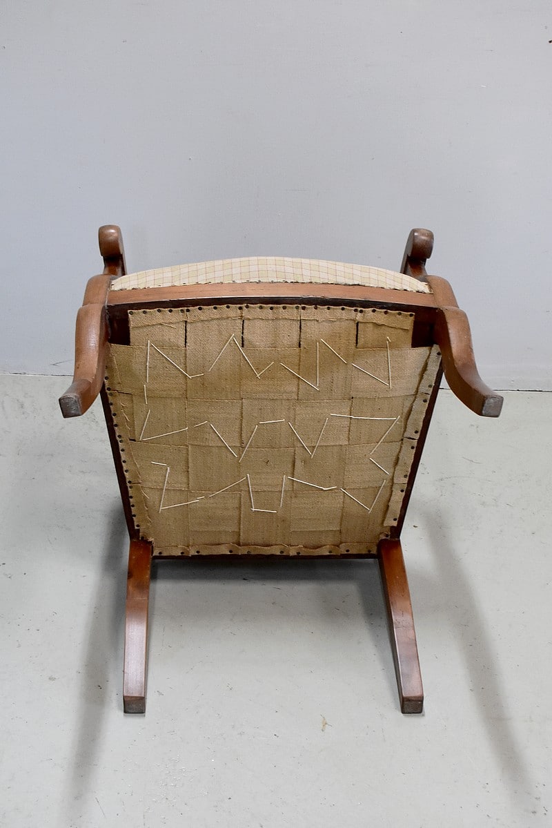 Le dossier et l’assise à fût équerré sont entièrement refaits à l’ancienne dont l’assise est à ressors, crin animal et sangles. Ils sont recouverts d’un tissu d’apprêt permettant à l’acheteur le choix du tissu final.