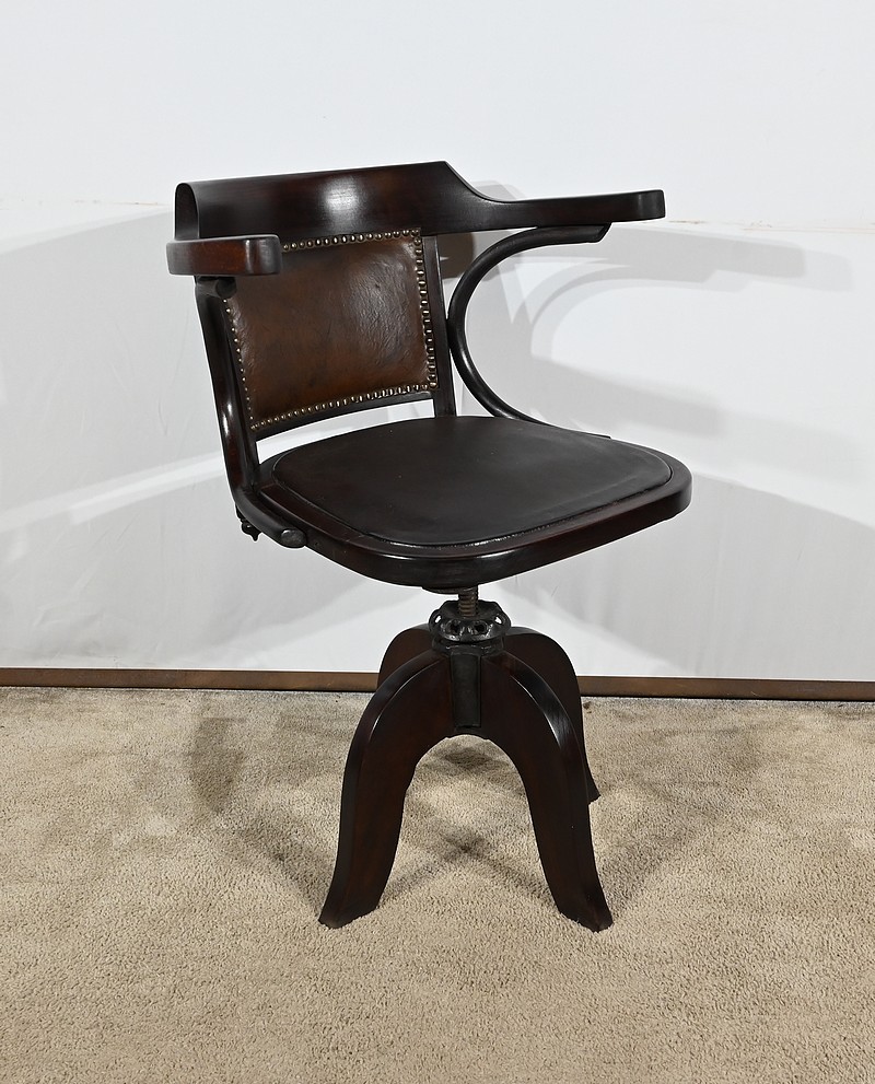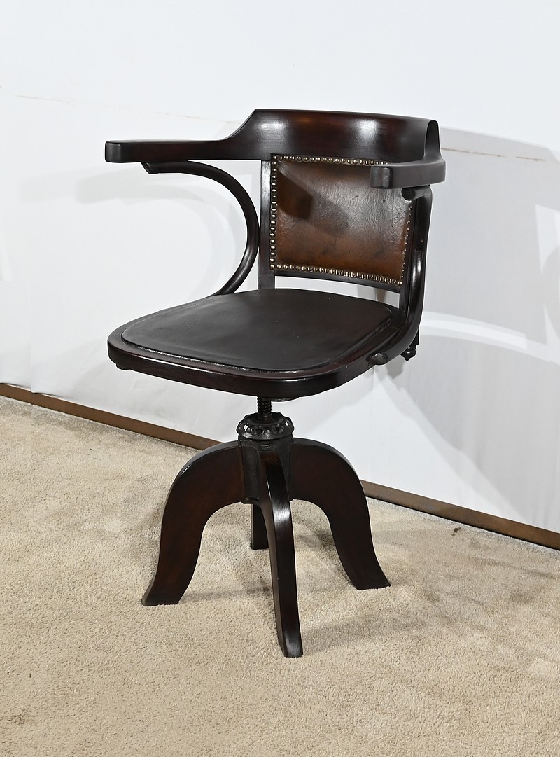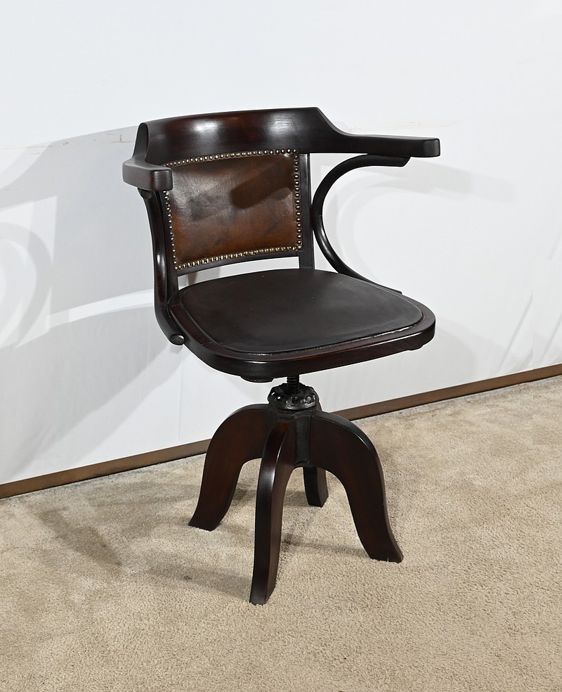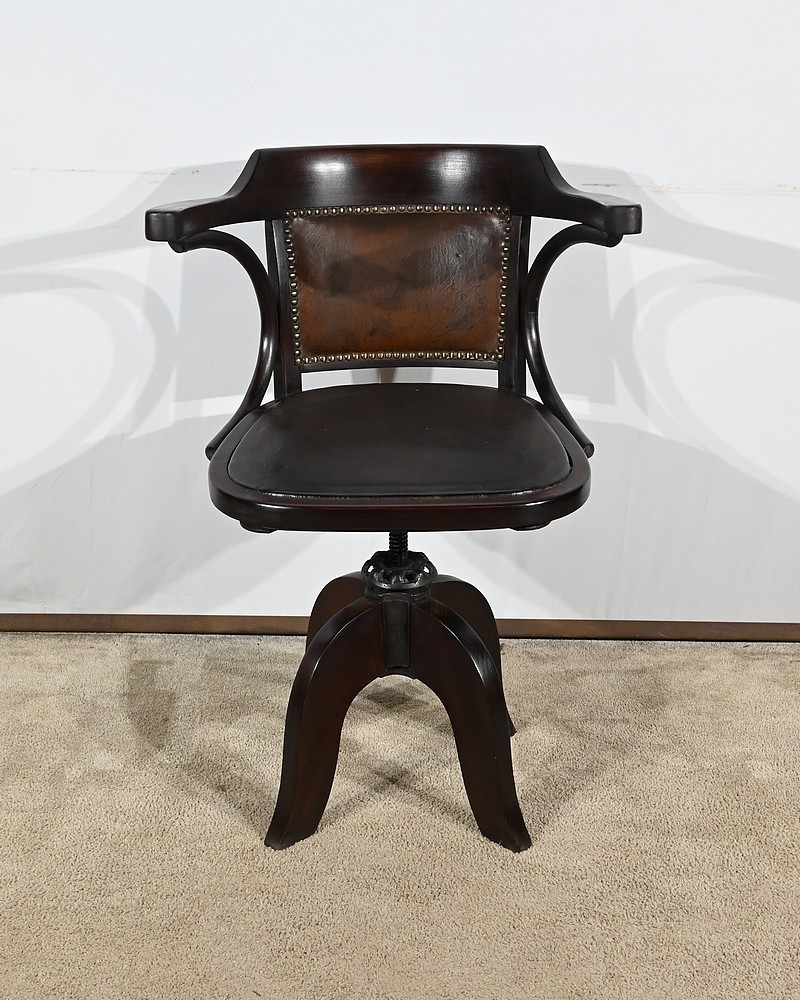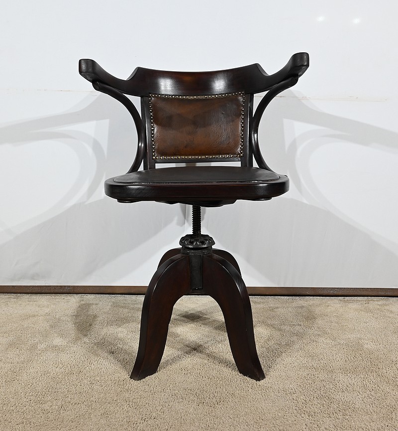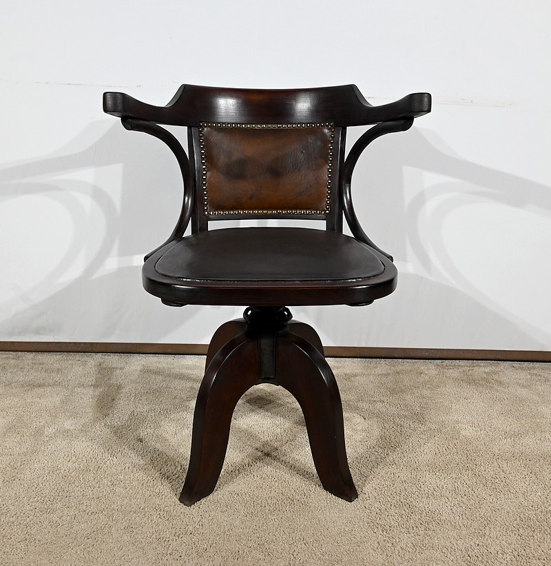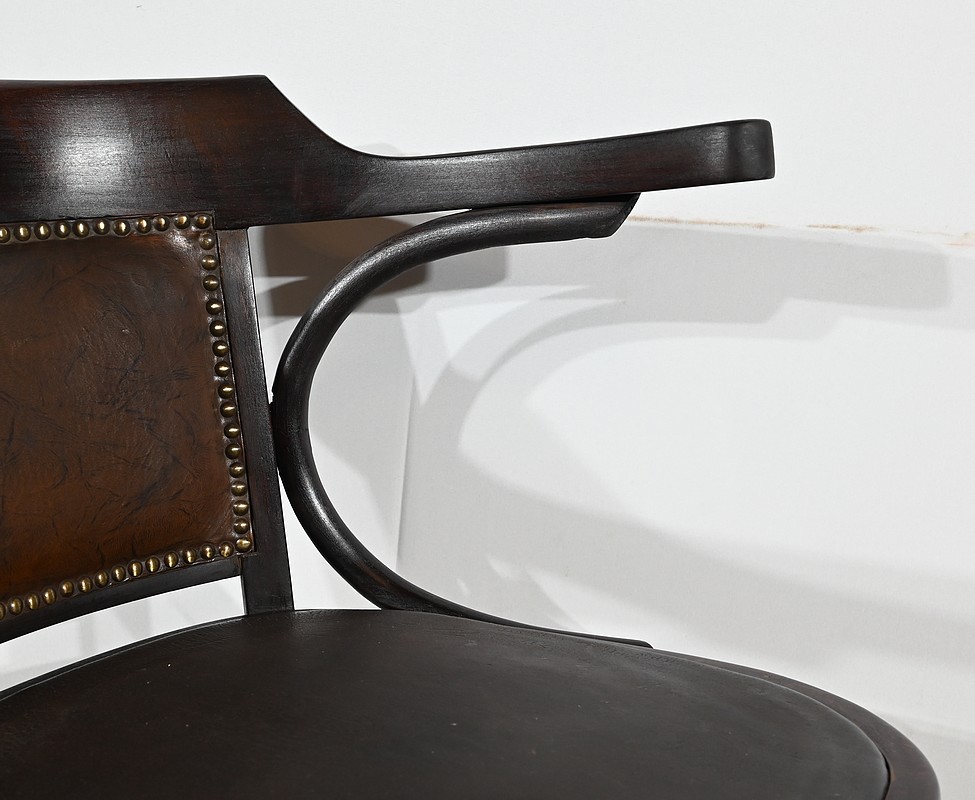 Fauteuil pivotant en hêtre teinté inspiré du modèle n°164 de Baumann. Datant des années 1940, ce fauteuil possède une assise à encadrement, foncée d’un cuir de vache épais de couleur noire. Le dossier enveloppant possède des accoudoirs courbés rejoignant l’encadrement de l’assise. Le dos est garni d’un cuir marron plus clair et clouté. Ce siège est doté d’un piétement quadripode. Les quatre pieds mouvementés sont réunis par un élément de fer maintenant un système à vis, coulissant, permettant à ce fauteuil pivotant d’être réglable en hauteur.