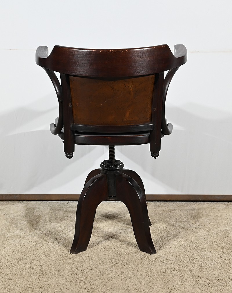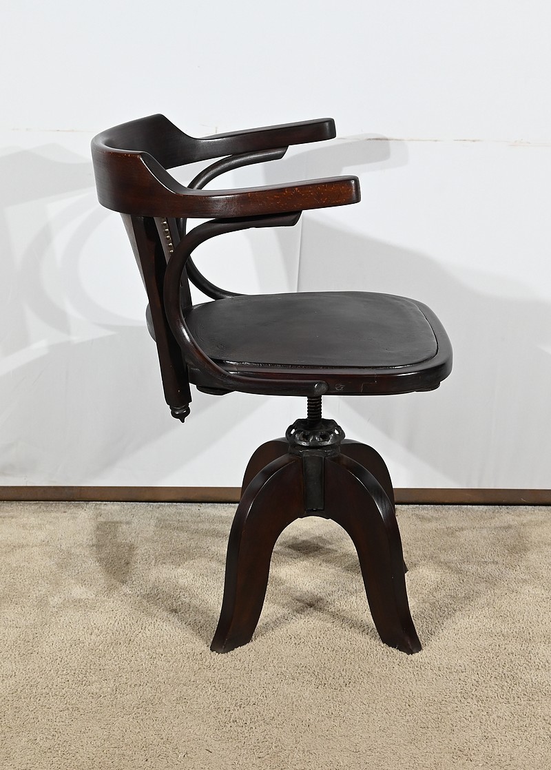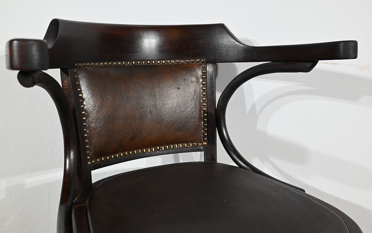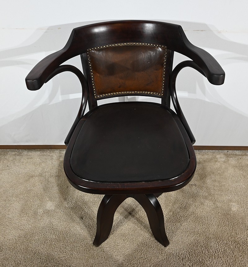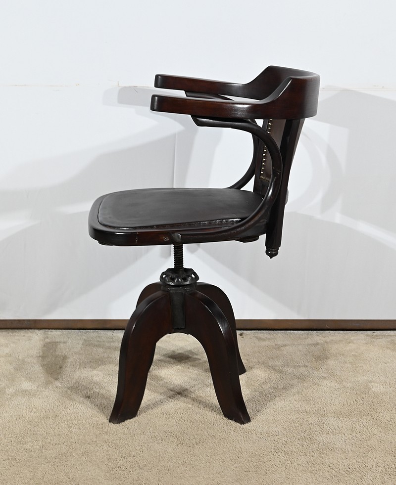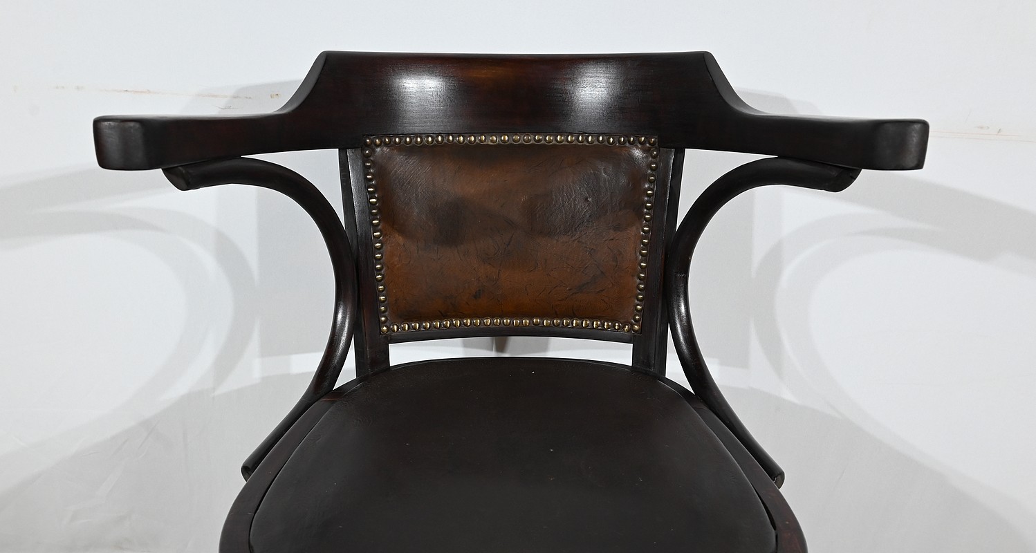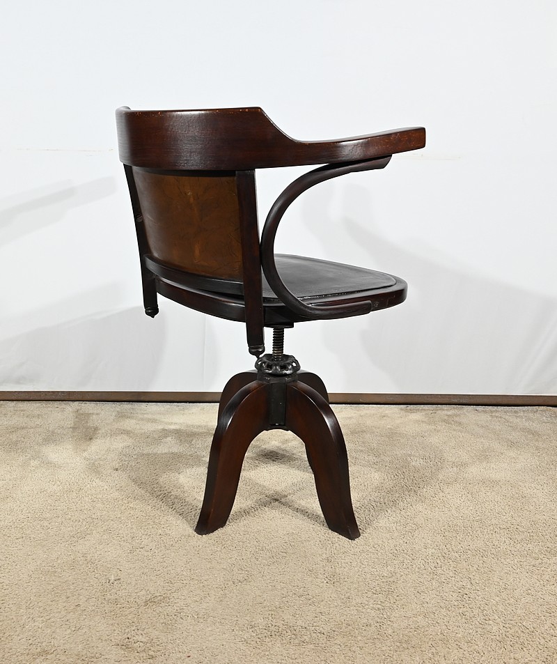 Fauteuil pivotant en hêtre teinté inspiré du modèle n°164 de Baumann. Datant des années 1940, ce fauteuil possède une assise à encadrement, foncée d’un cuir de vache épais de couleur noire. Le dossier enveloppant possède des accoudoirs courbés rejoignant l’encadrement de l’assise. Le dos est garni d’un cuir marron plus clair et clouté. Ce siège est doté d’un piétement quadripode. Les quatre pieds mouvementés sont réunis par un élément de fer maintenant un système à vis, coulissant, permettant à ce fauteuil pivotant d’être réglable en hauteur.