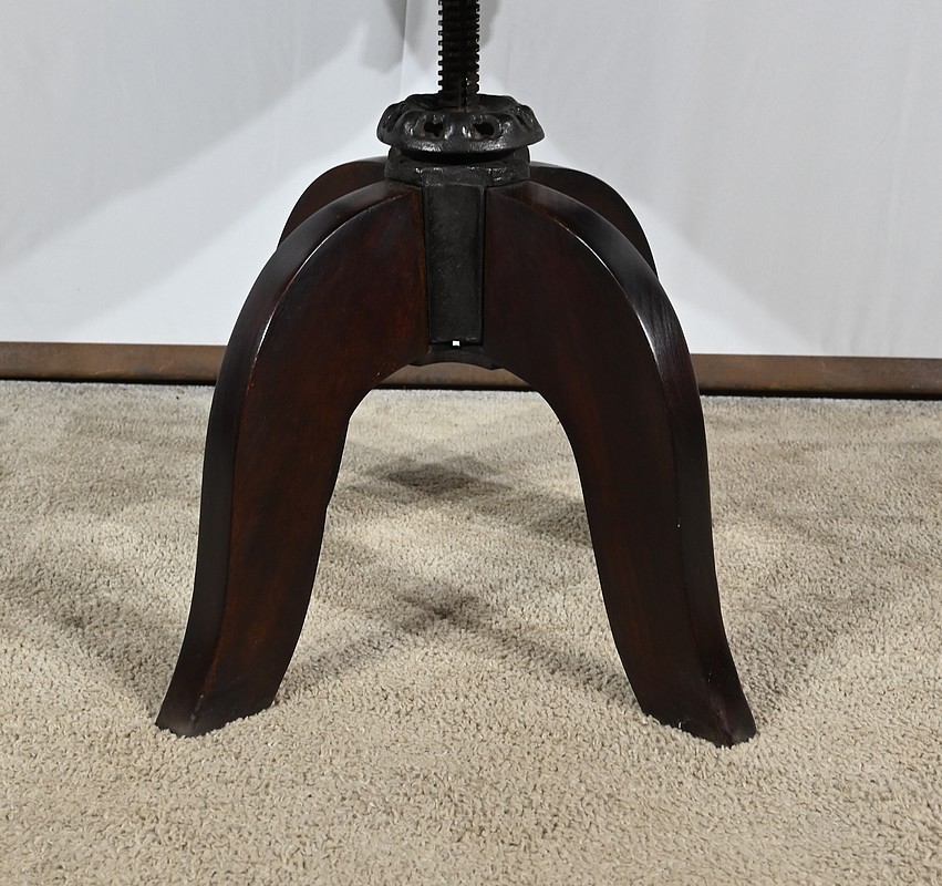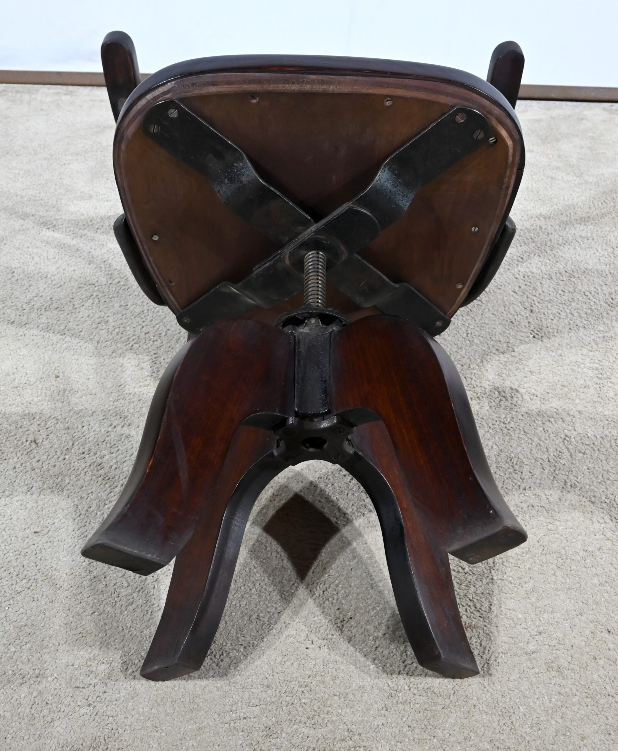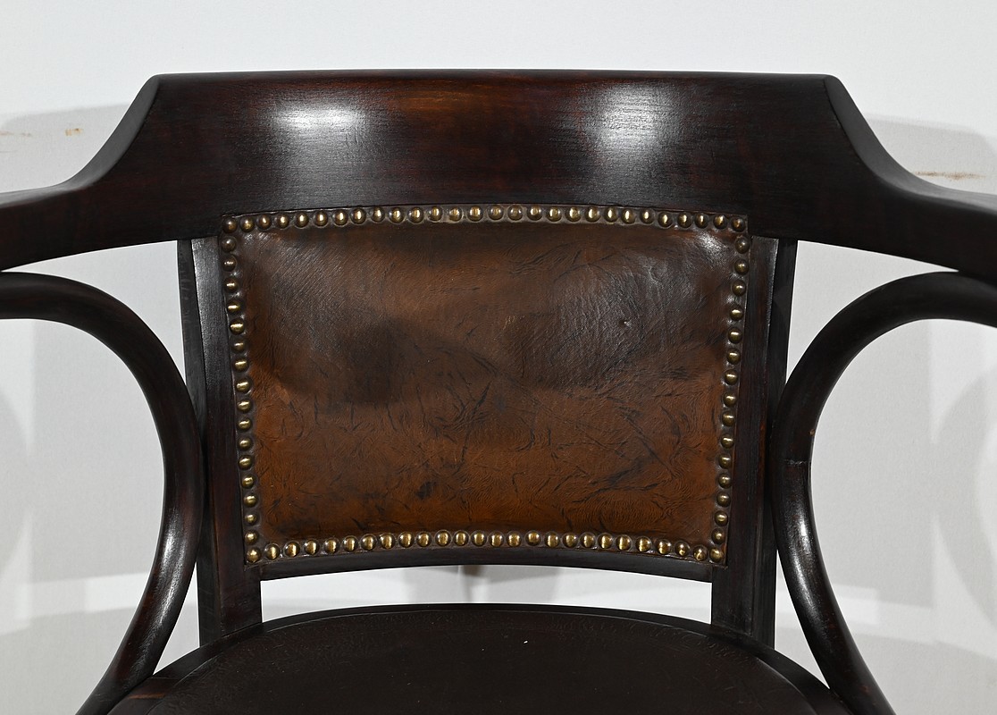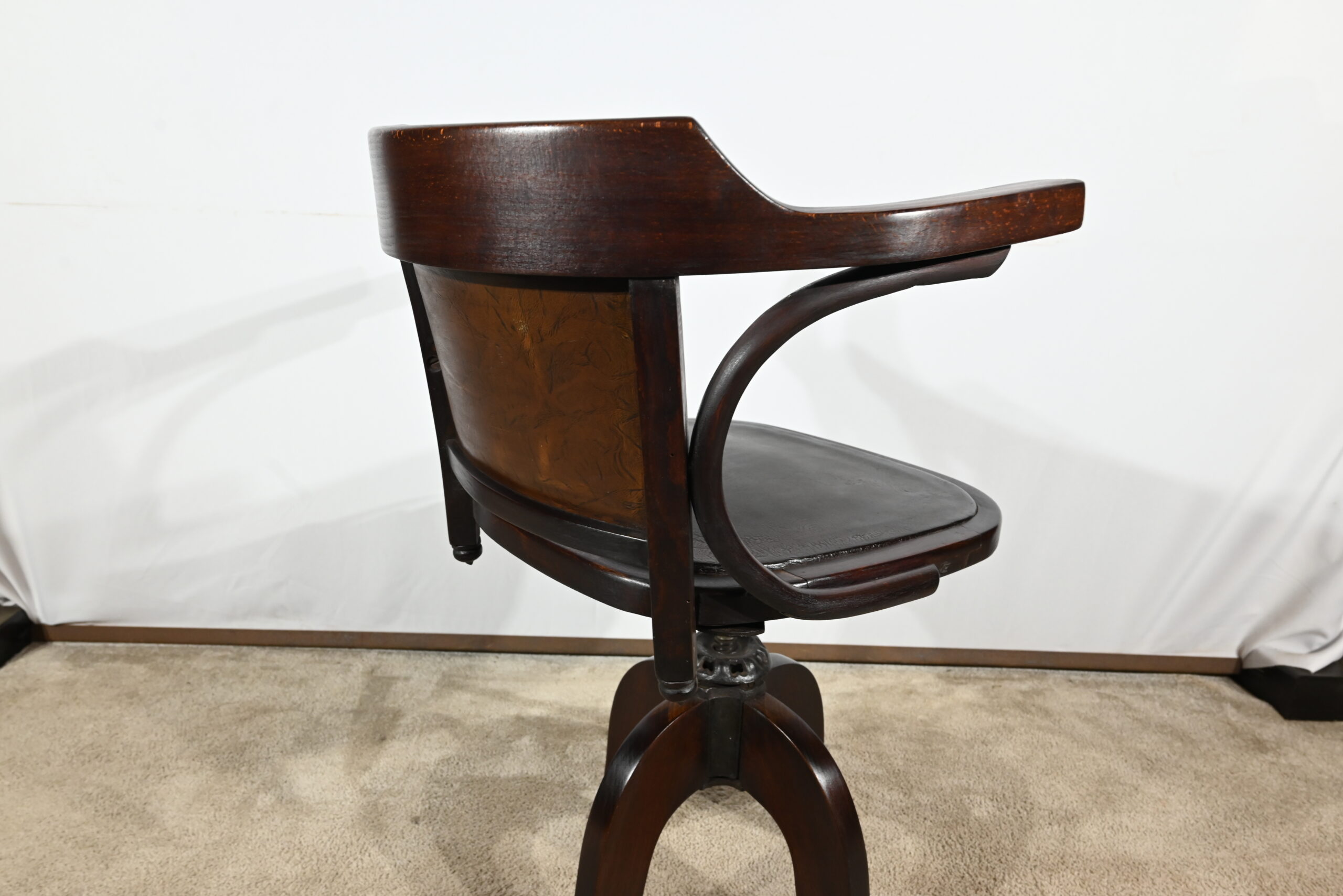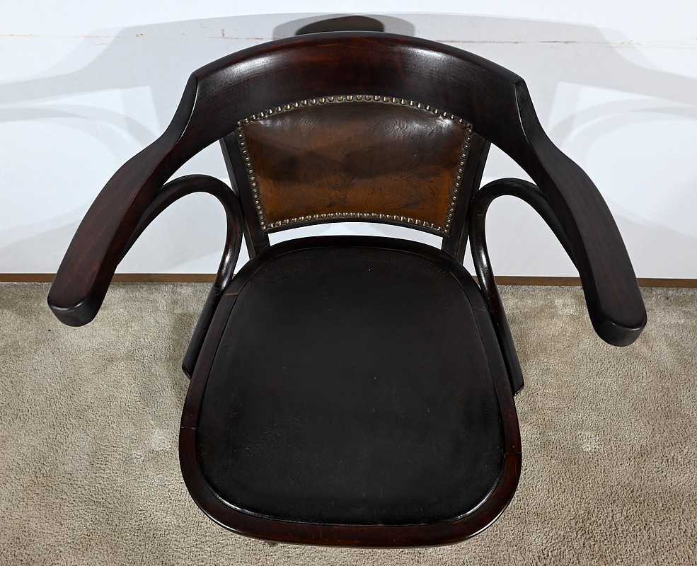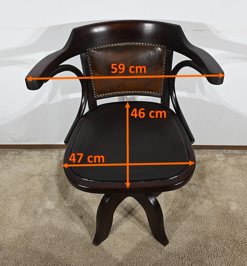 Fauteuil pivotant en hêtre teinté inspiré du modèle n°164 de Baumann. Datant des années 1940, ce fauteuil possède une assise à encadrement, foncée d’un cuir de vache épais de couleur noire. Le dossier enveloppant possède des accoudoirs courbés rejoignant l’encadrement de l’assise. Le dos est garni d’un cuir marron plus clair et clouté. Ce siège est doté d’un piétement quadripode. Les quatre pieds mouvementés sont réunis par un élément de fer maintenant un système à vis, coulissant, permettant à ce fauteuil pivotant d’être réglable en hauteur.