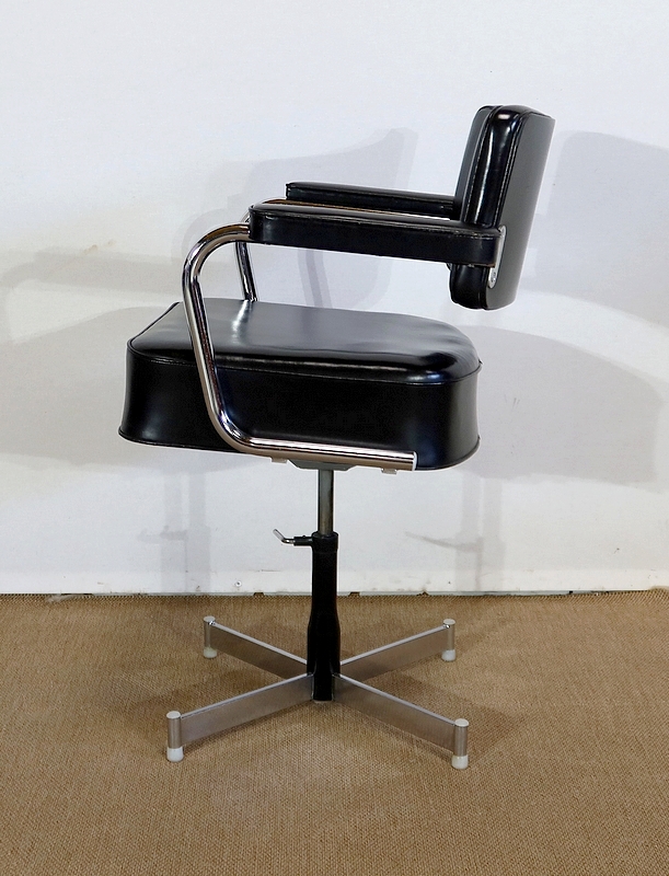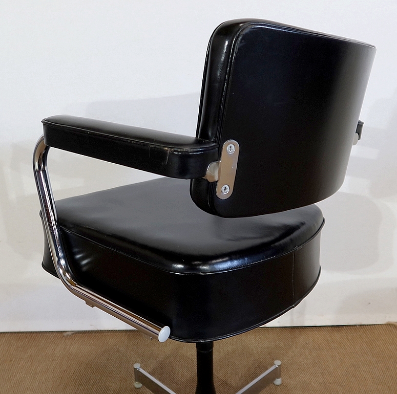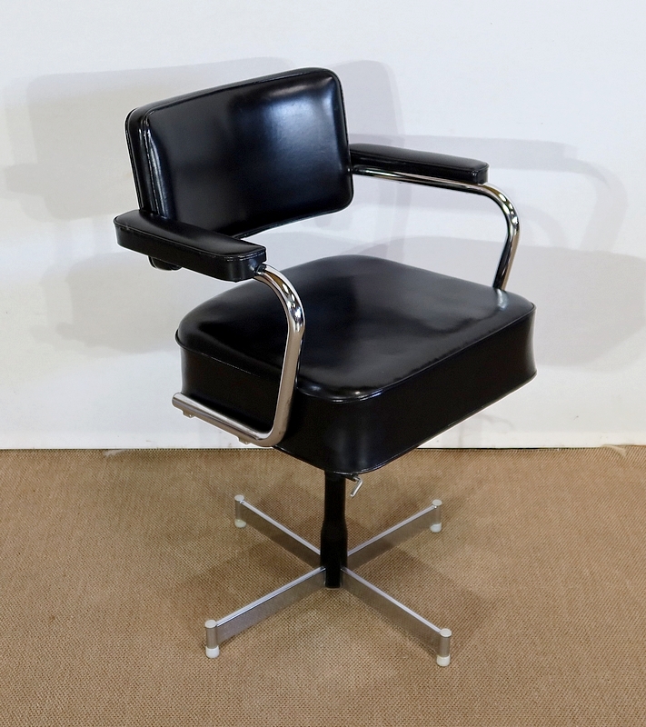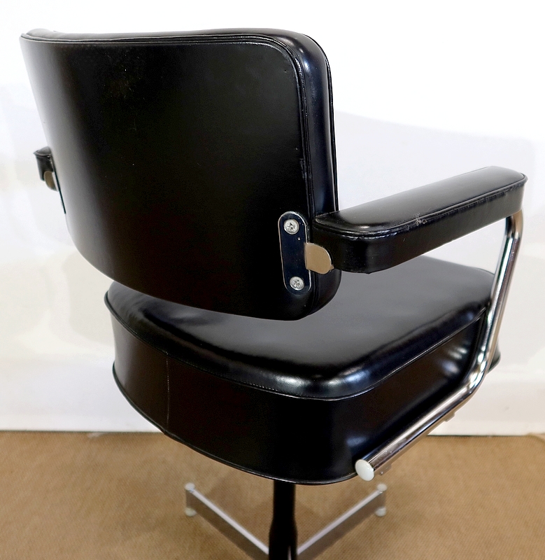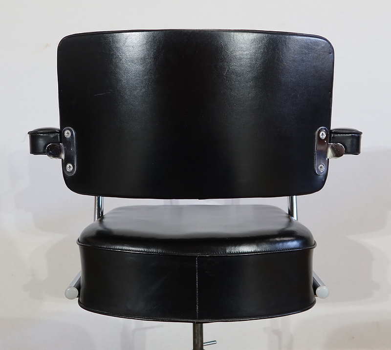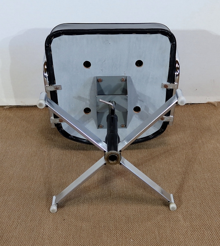 Ce siège en parfait état repose sur un piétement quadripode en étoile en métal chromé d’où part un fût en acier noir avec une manette pour régler le fauteuil en hauteur.