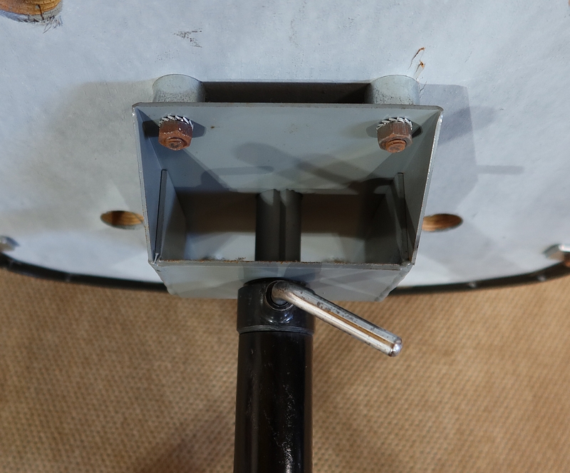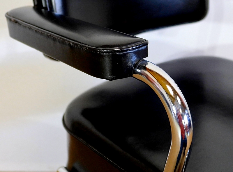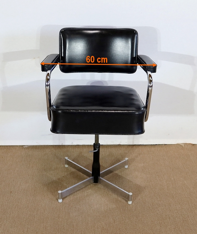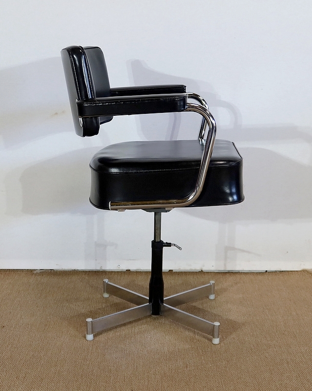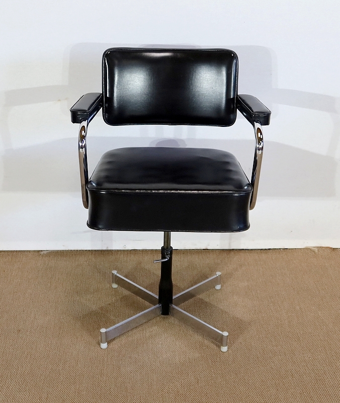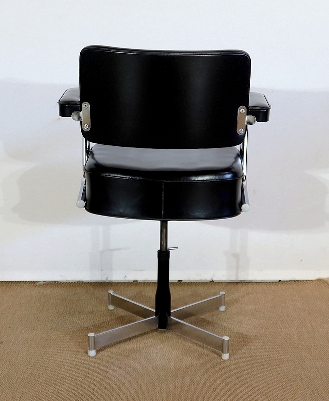 Ce siège en parfait état repose sur un piétement quadripode en étoile en métal chromé d’où part un fût en acier noir avec une manette pour régler le fauteuil en hauteur.