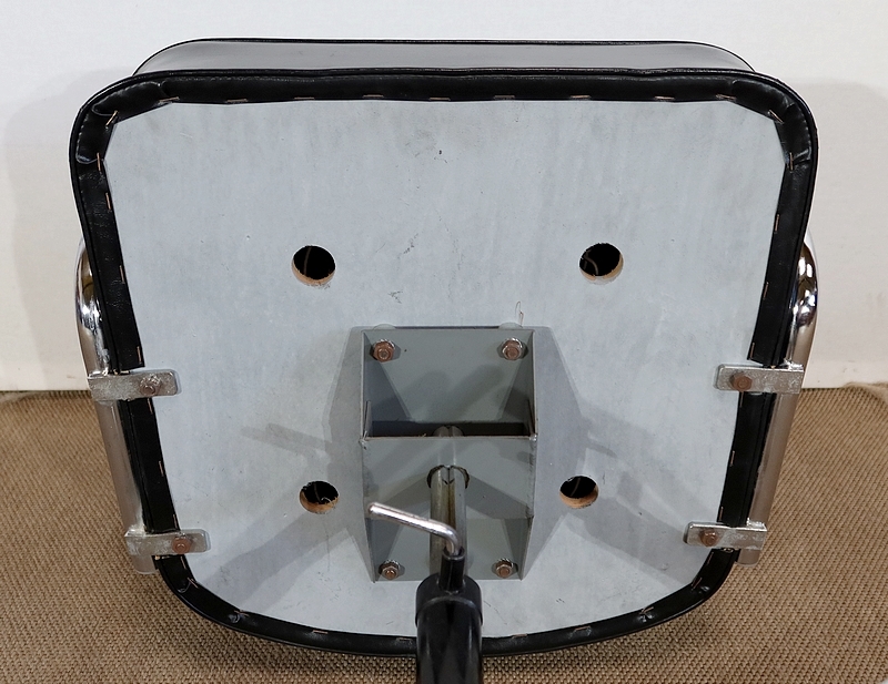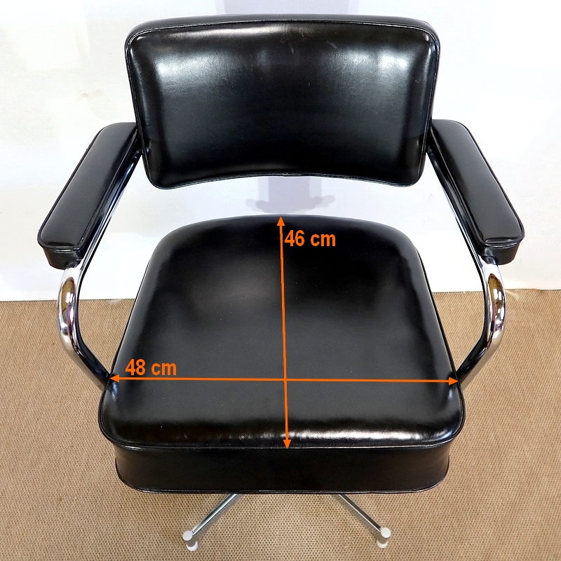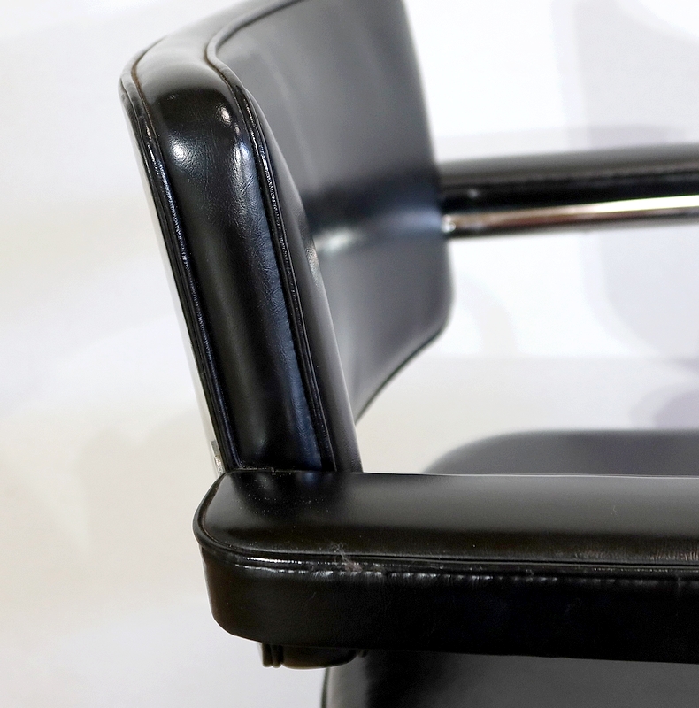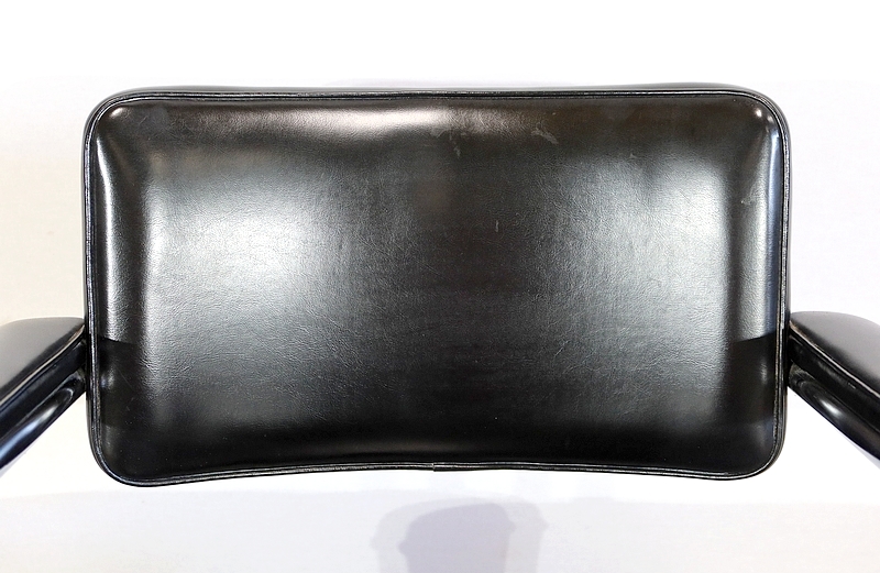 L’assise confortable est accompagnée de deux bras en métal chromé rejoignant le dossier en suspension légèrement incurvé. L’ensemble est habillé d’un simili cuir noir en parfait état.