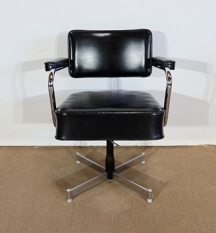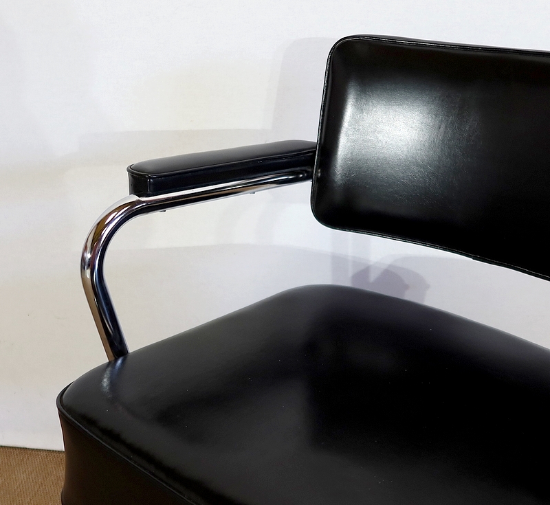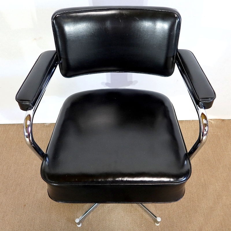 Fauteuil en simili cuir noir et métal chromé des années 1960.