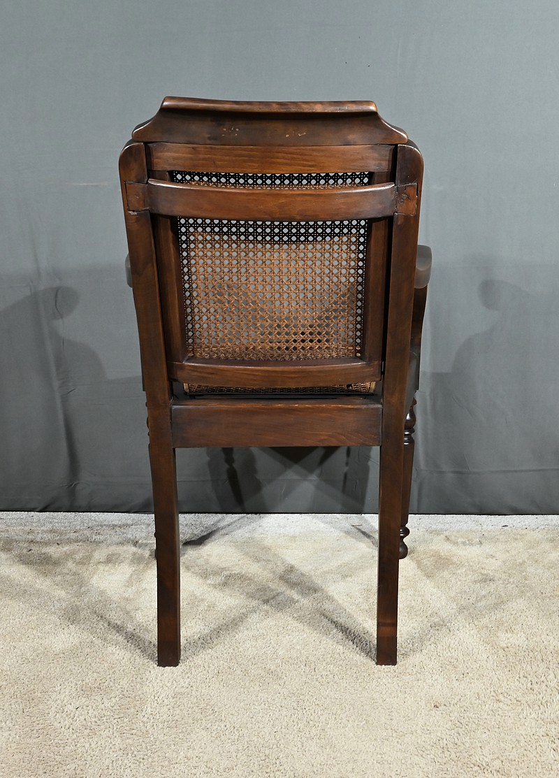 Fauteuil de coiffeur ou de barbier en hêtre teinté dans le goût Louis-Philippe se caractérisant par son dossier trapézoïdale réglable en hauteur.