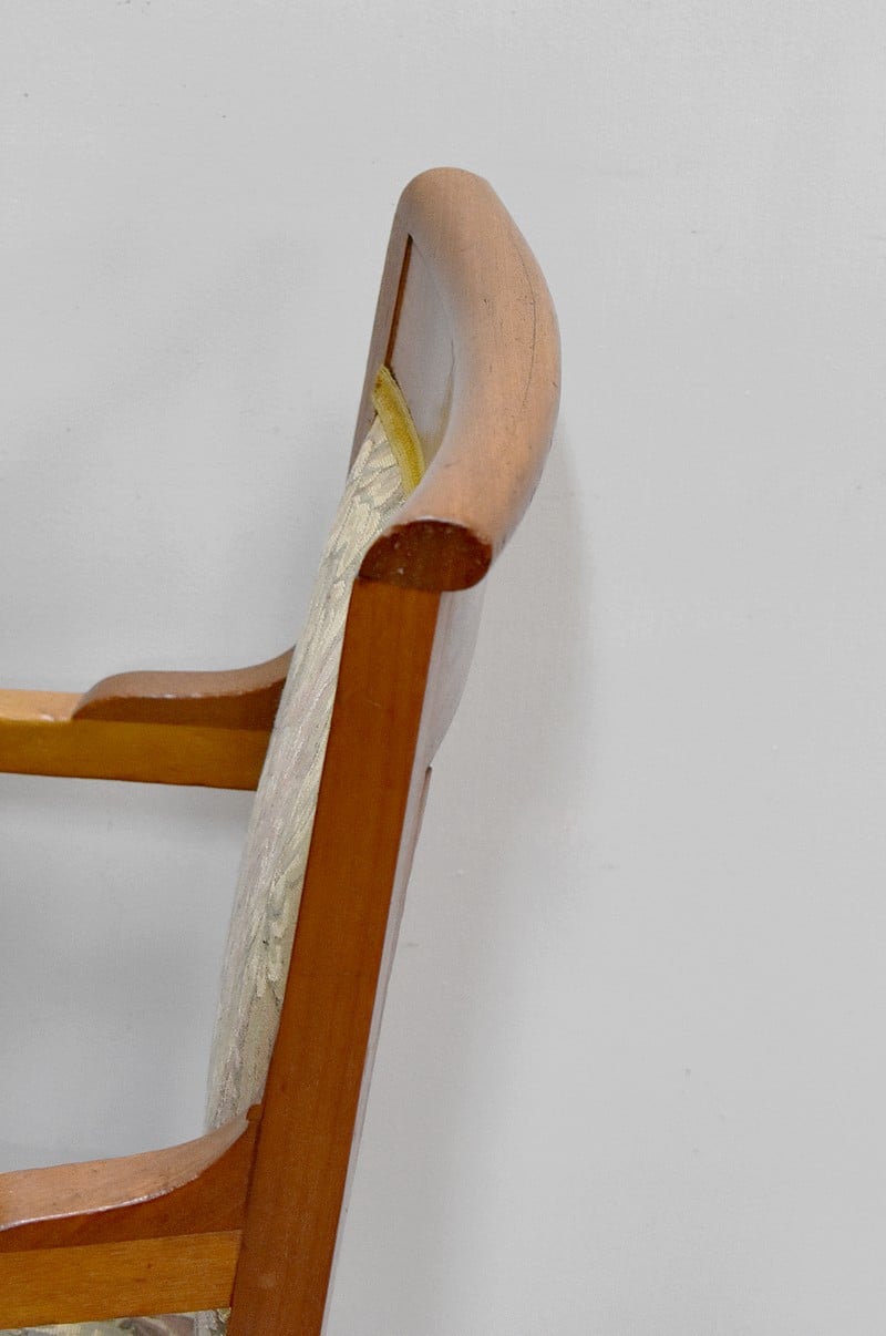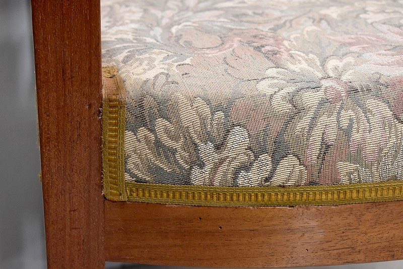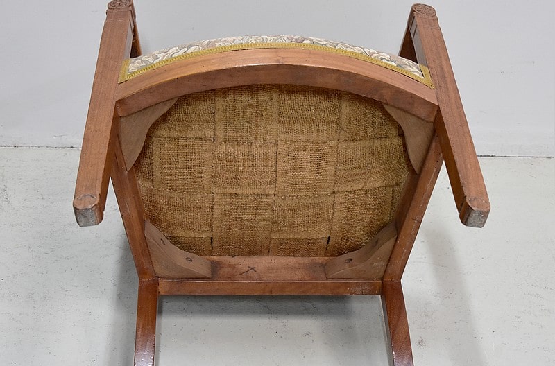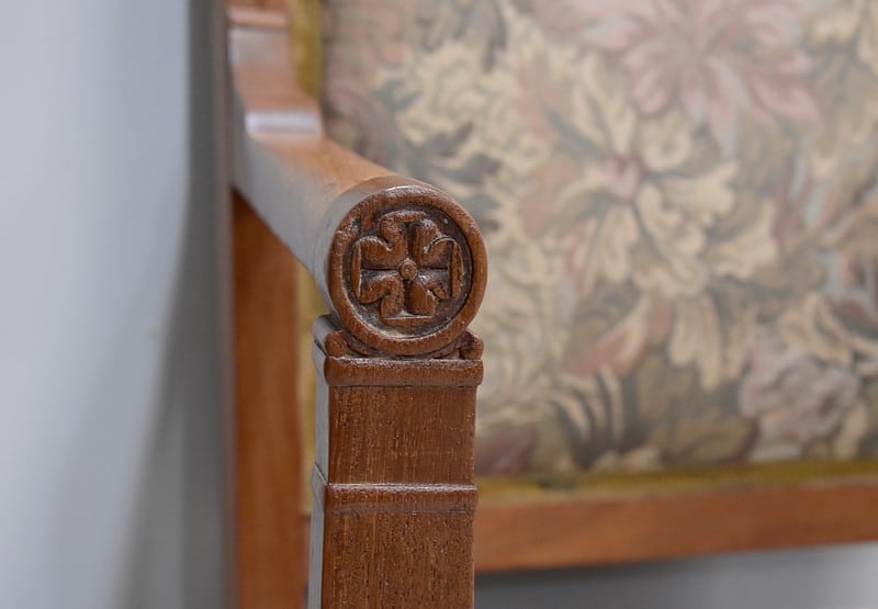 Les supports d’accotoirs sont ornés de rosaces. Il est recouvert d’une tapisserie à fleurs.