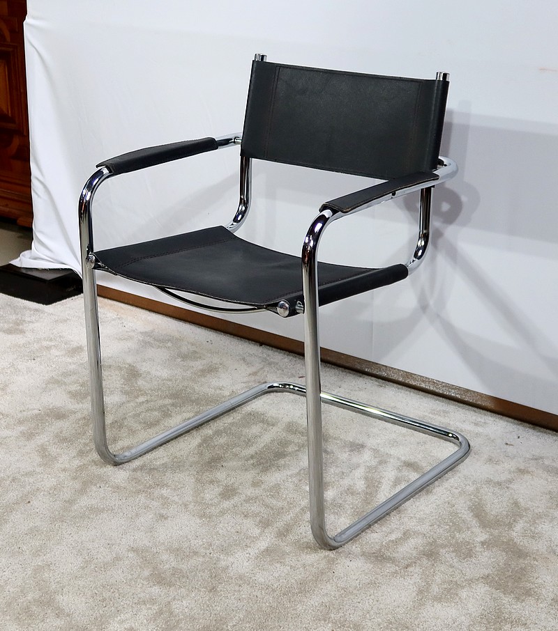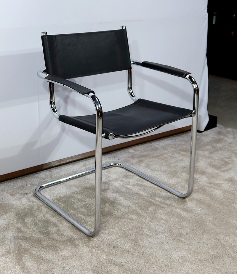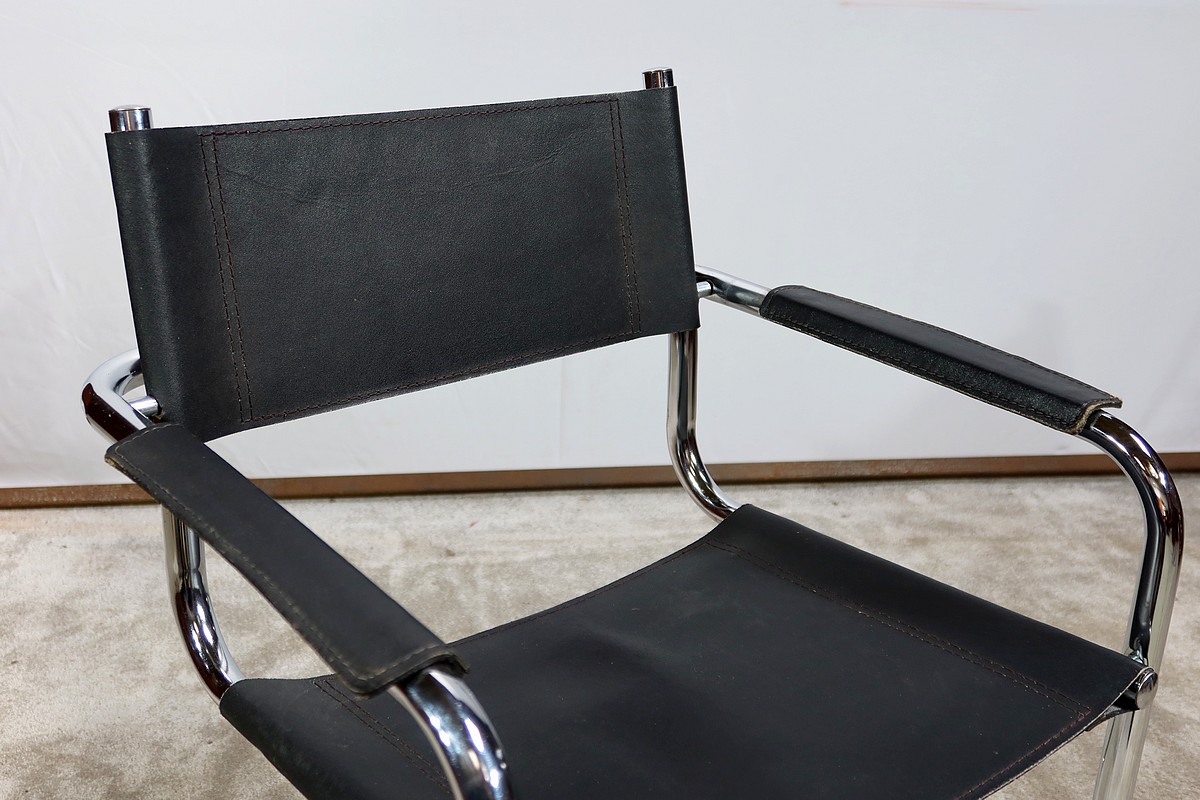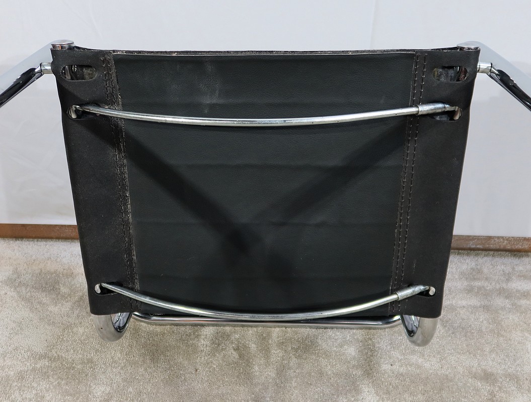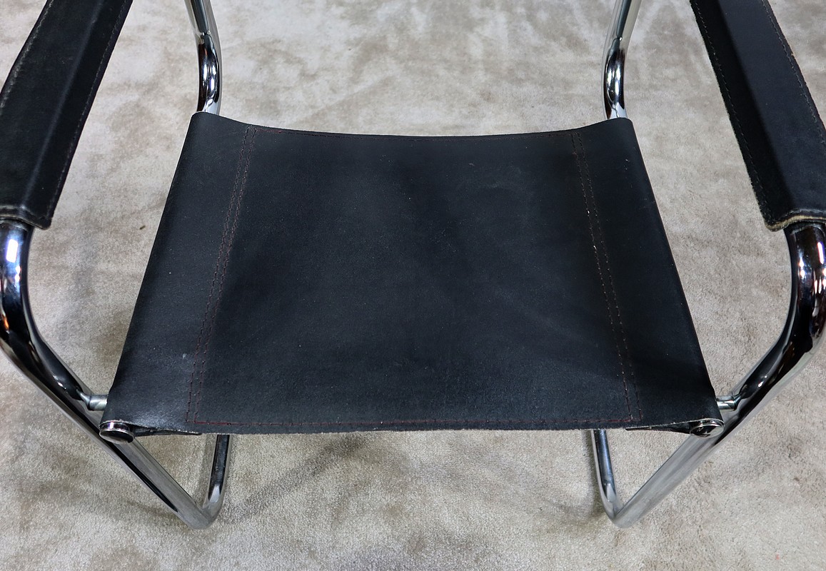 Fauteuil noir en cuir reprenant le modèle B34 de Marcel Breuer édité dans les années 1930.