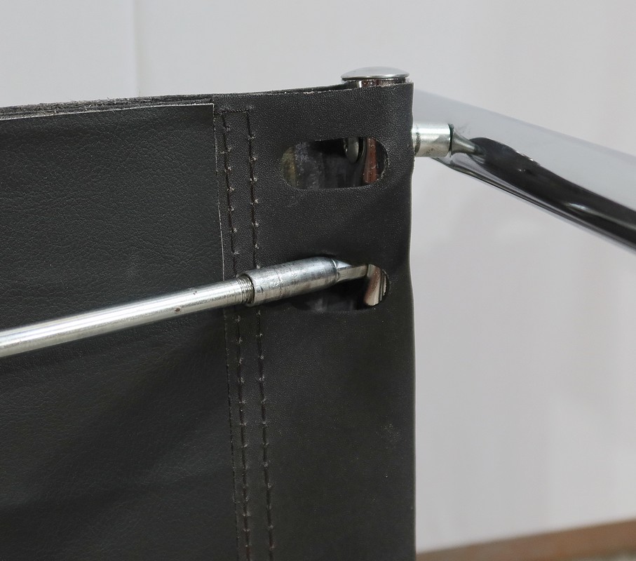 On soulignera la présence sous ces fauteuils de deux arceaux de métal à pas de vis. Ils permettent, de manière simple et rapide, de régler et d’ajuster la fermeté de l’assise.