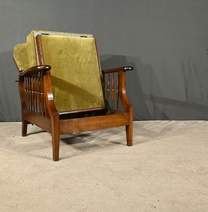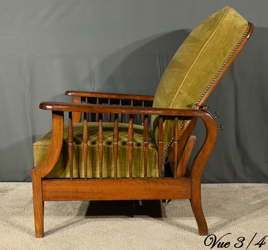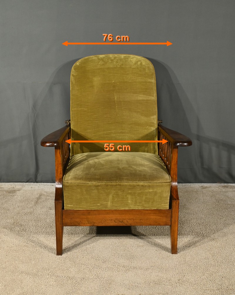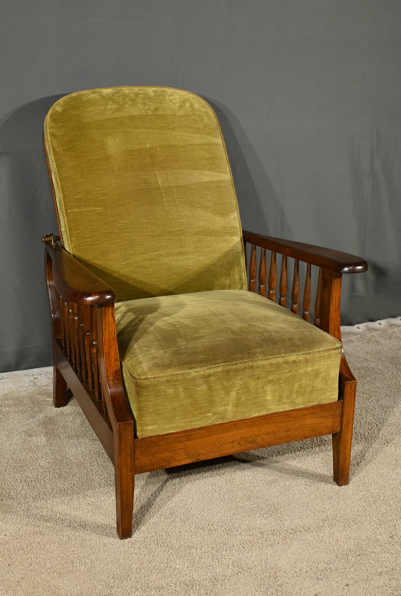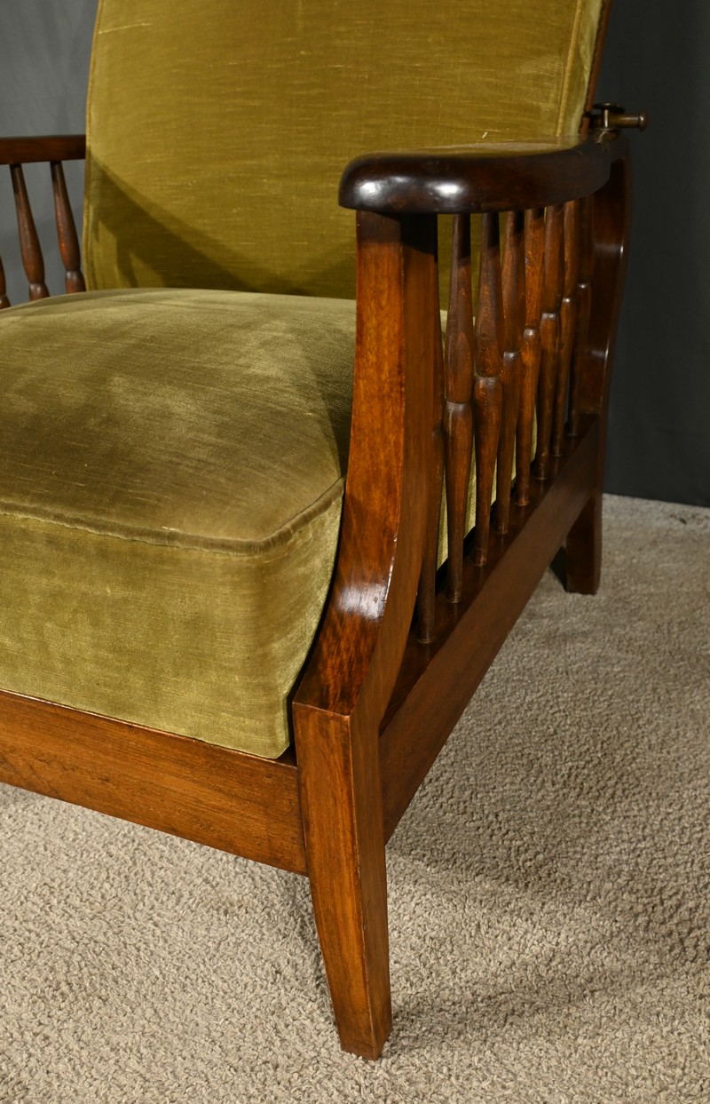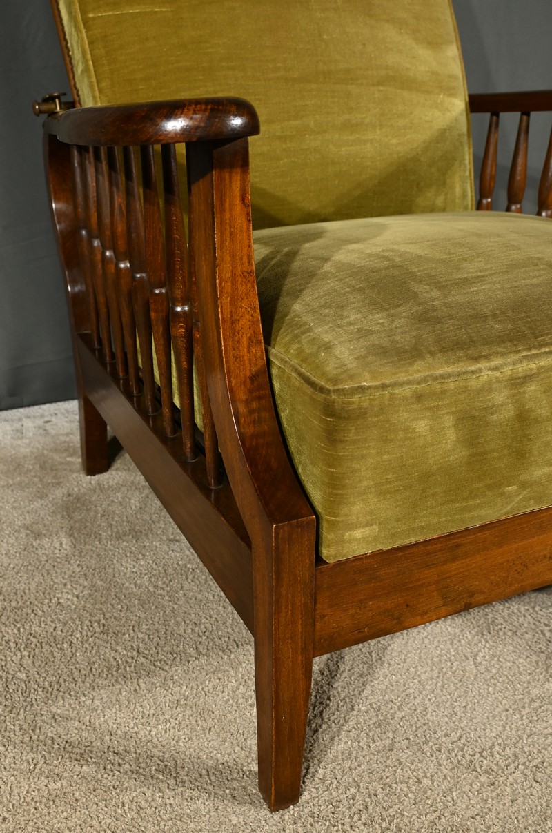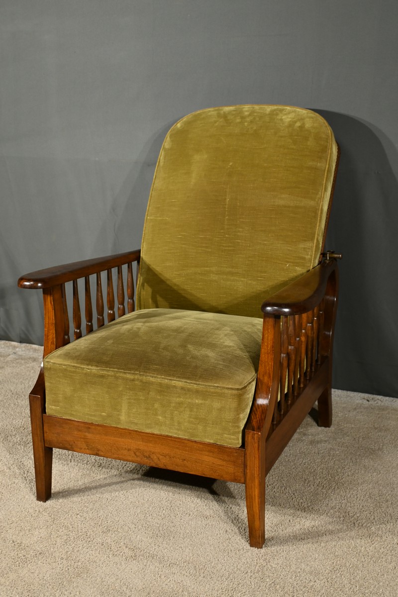 Le fauteuil Morris en hêtre teinté des années 1920 est une pièce emblématique de l’époque art & craft, originaire d’Angleterre.