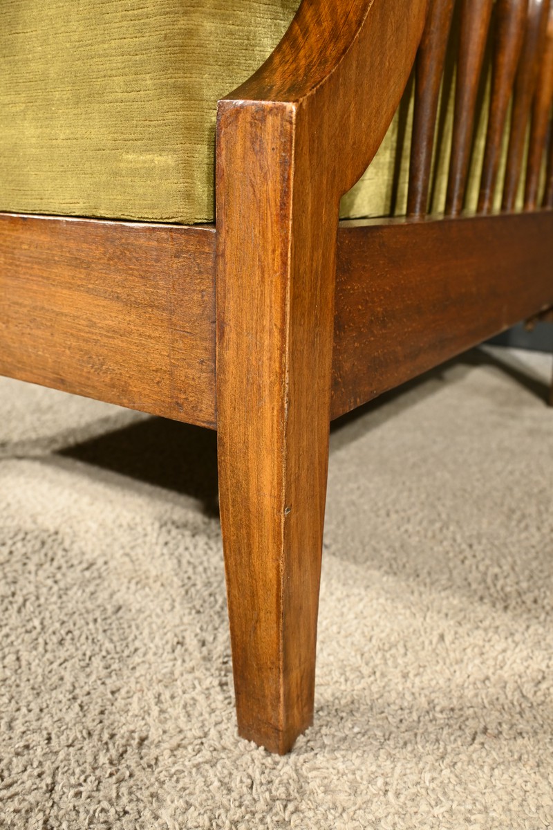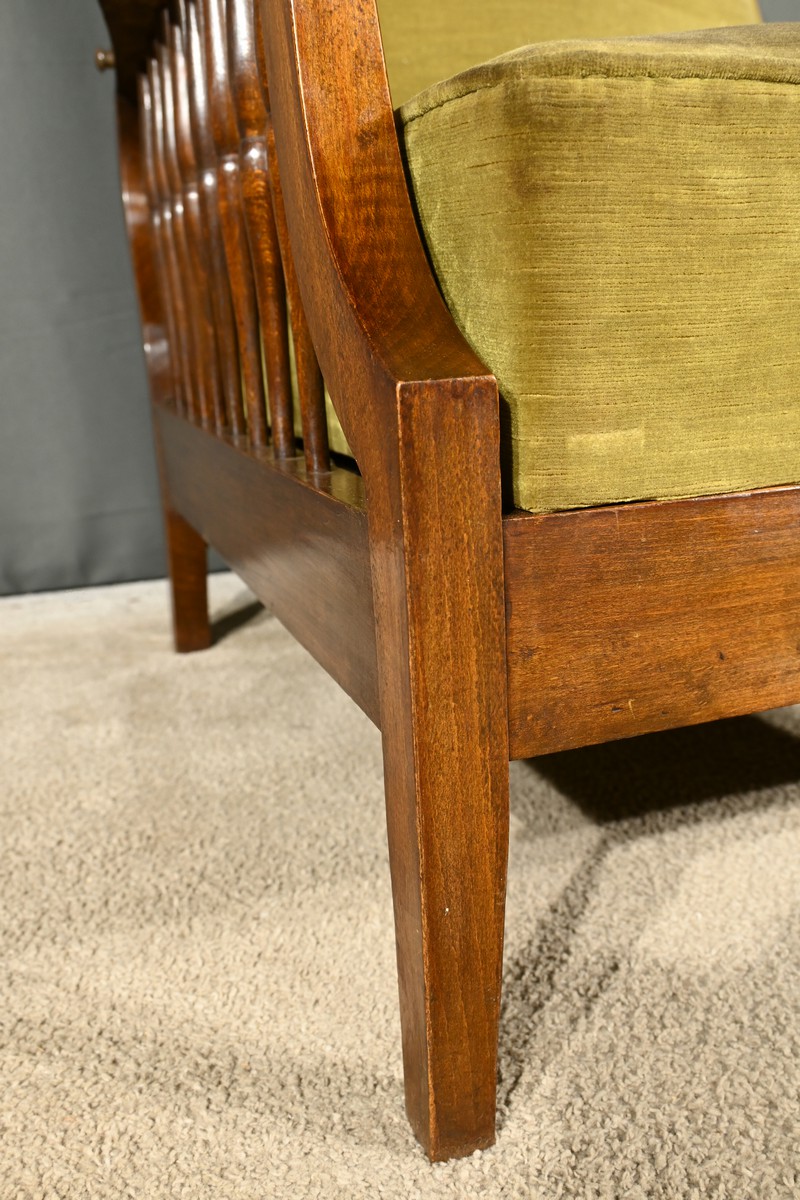 Les accotoirs plats sont finement barreaudés, ajoutant une touche de sophistication à l’ensemble.