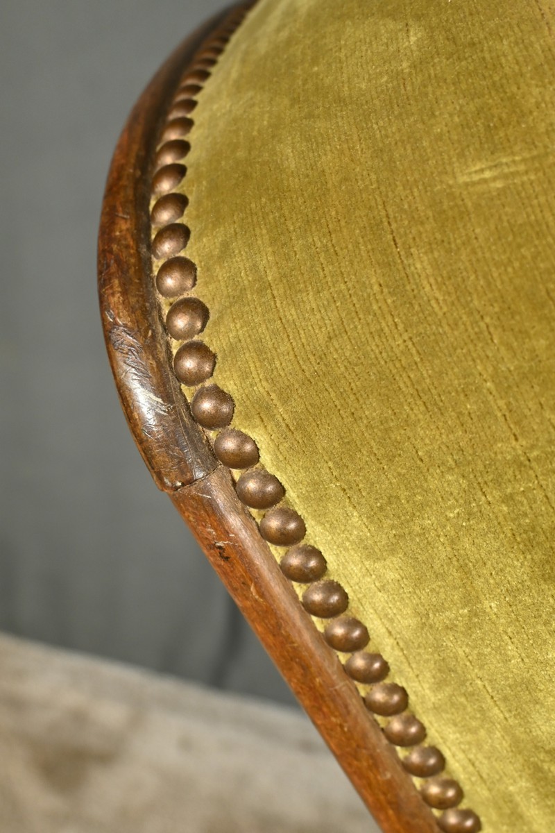 Habillé d’un tissu de velours de couleur amande, le fauteuil est également orné de clous décoratifs, soulignant son caractère luxueux et intemporel.