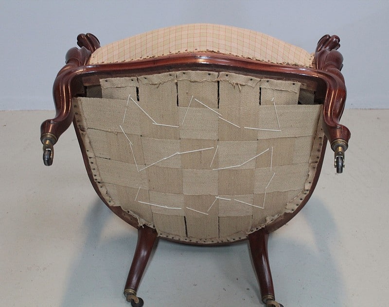 Le fût a été équerré et la tapisserie a été entièrement refaite, à l’ancienne, avec crins et ressorts sur sangles de jute. Il ne reste que le tissu final à poser.