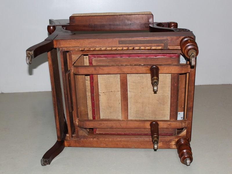 Un repose-pieds, recouvert d’un cuir rouge et soutenu par 2 petits pieds sur roulettes, se déplie à volonté et rentre dans son logement, dessous le siège.