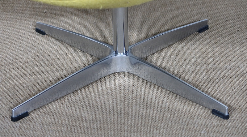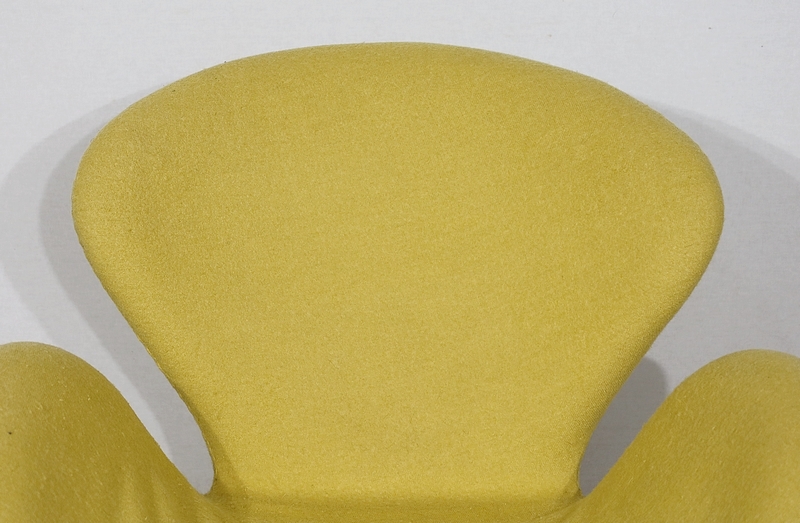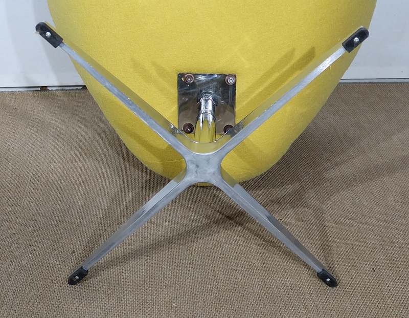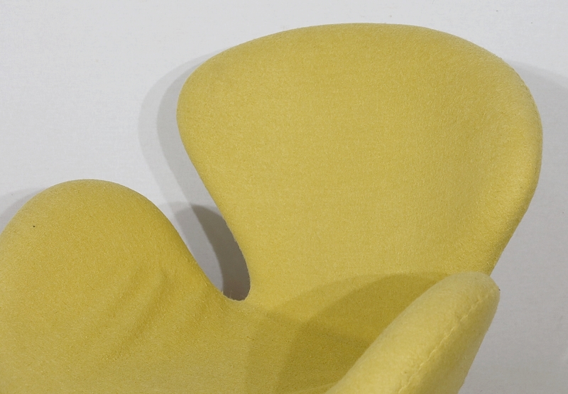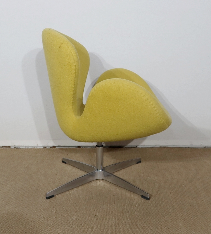 Elégant et fluide, ce fauteuil tournant est garni d’un lainage jaune canari soutenu par une coque au dossier incurvé à oreilles.