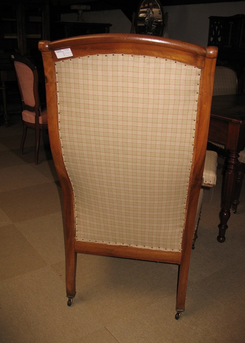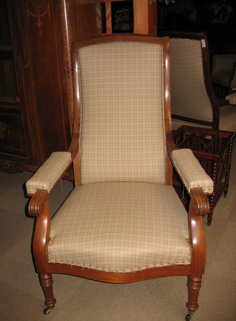 Fauteuil Voltaire en noyer d’époque Restauration (milieu XIXe). Ses accoudoirs sont à manchettes et il repose sur 4 pieds à roulettes. La tapisserie a été refaite à l’ancienne (avec crin et ressorts) et le fût a été consolidé et équerré.