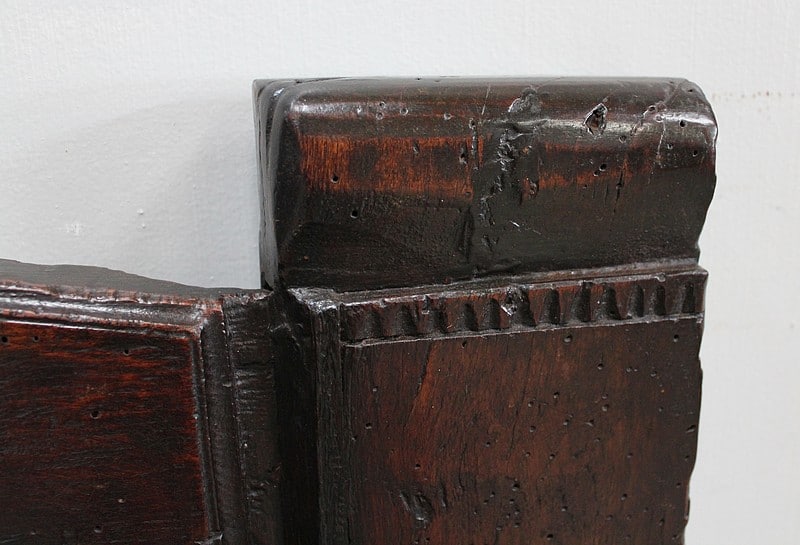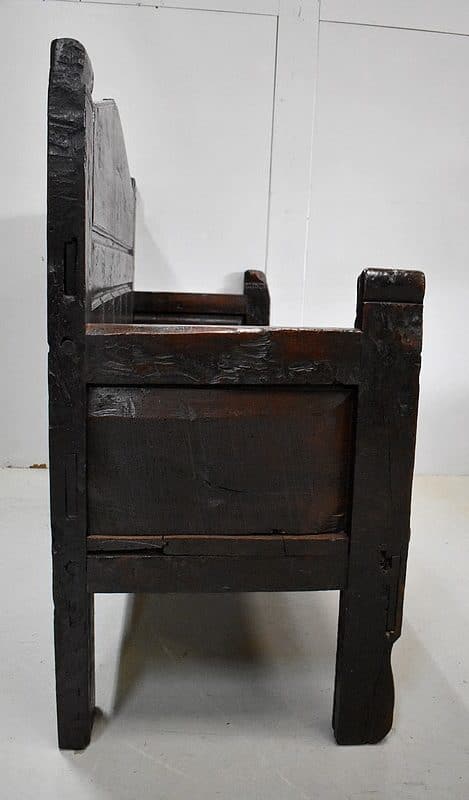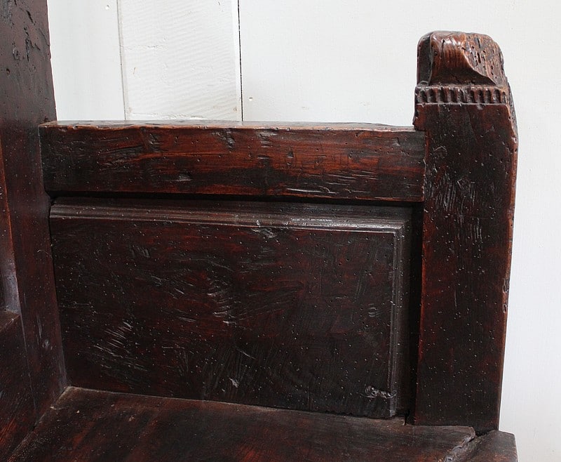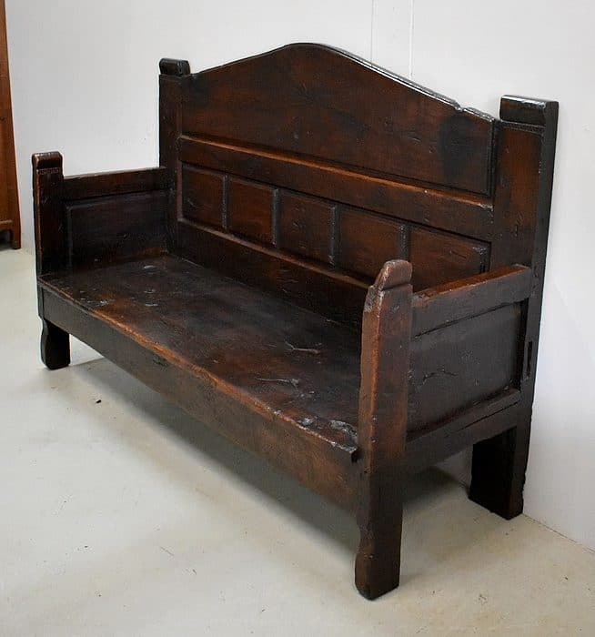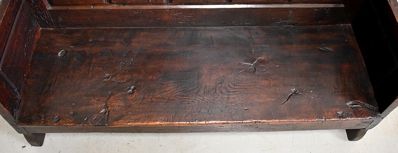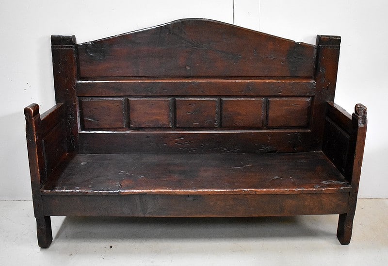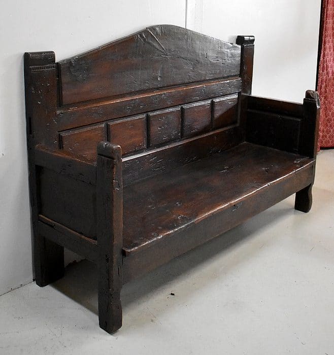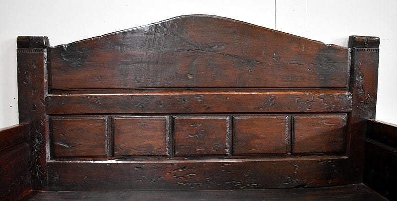 Grand Banc en Chêne massif, avec Haut Dosseret Mitré agrémenté d’une rangée de cinq panneaux Saillants aux pourtours légèrement Moulurés.