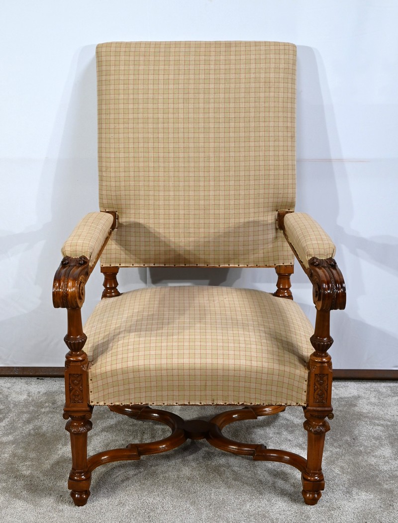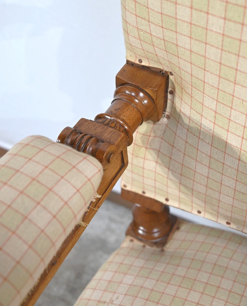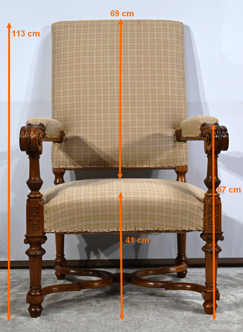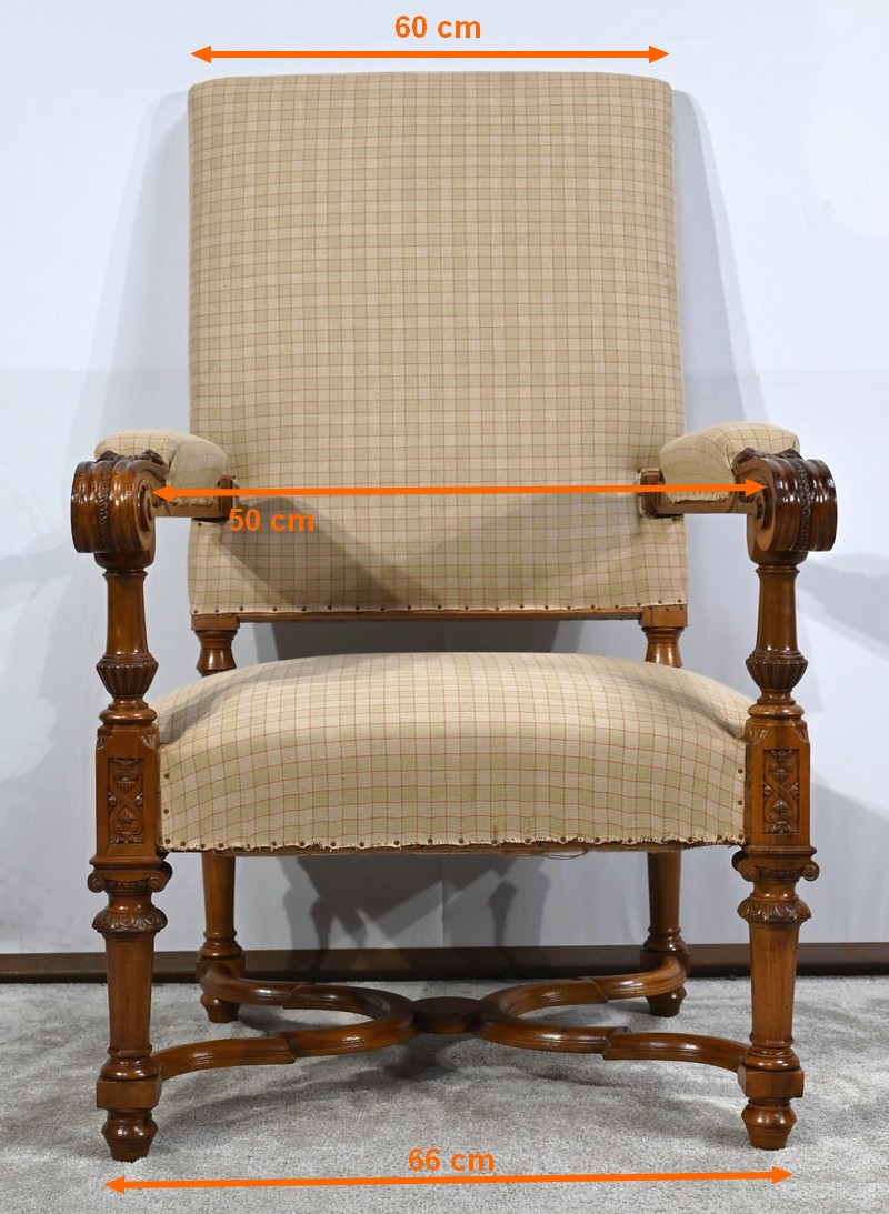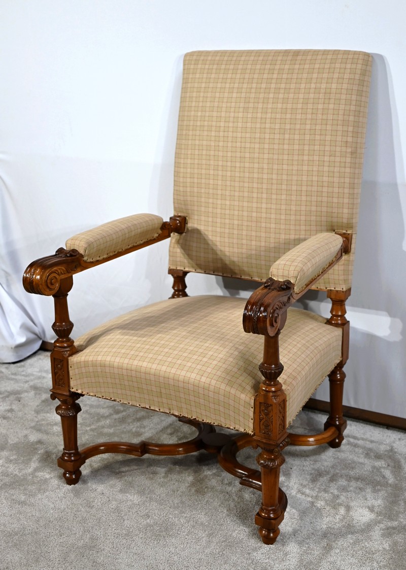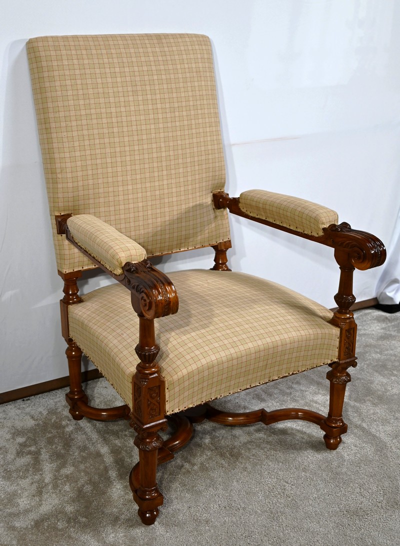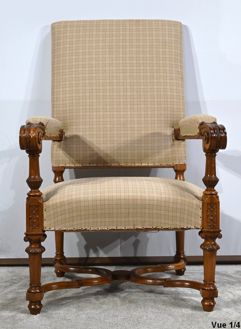 Important fauteuil en noyer de style Louis XVI recouvert d’un tissu d’après clouté sur l’assise, le dossier et les manchettes.