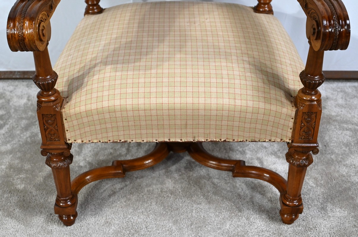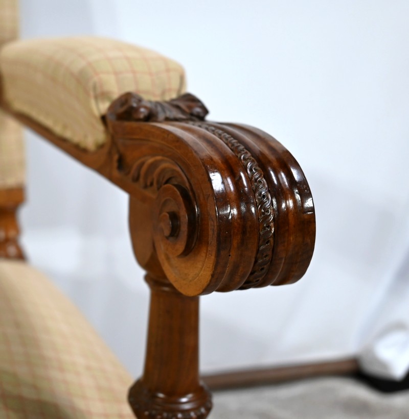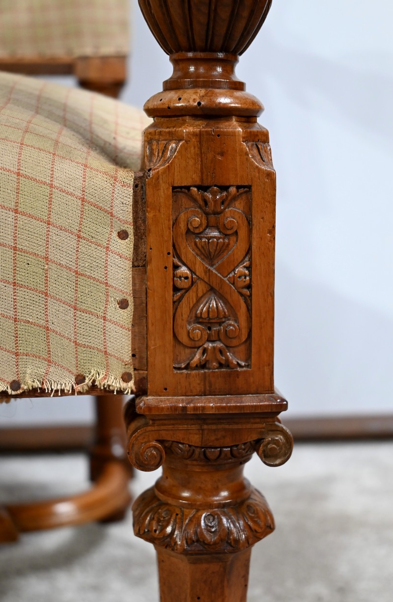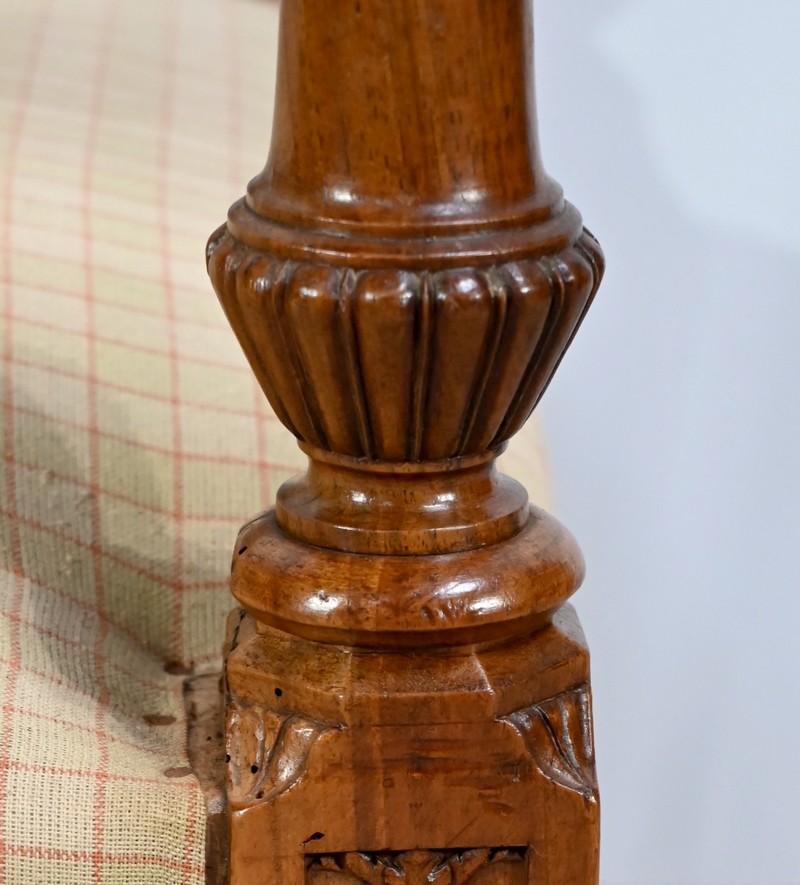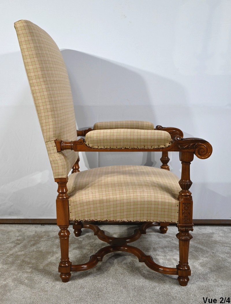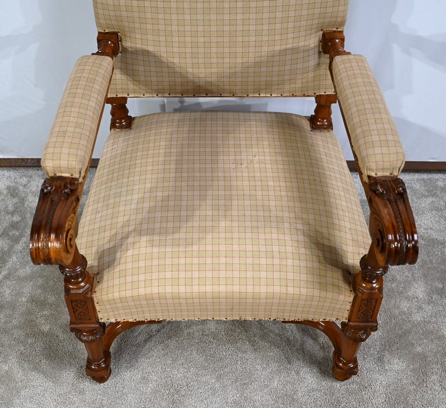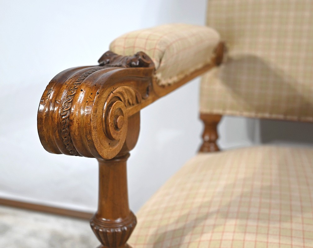 Important fauteuil en noyer de style Louis XVI recouvert d’un tissu d’après clouté sur l’assise, le dossier et les manchettes.