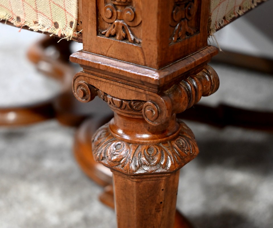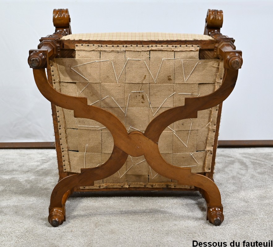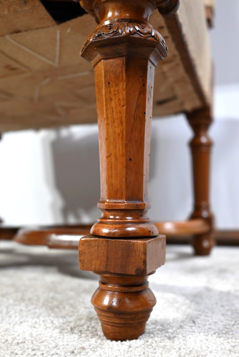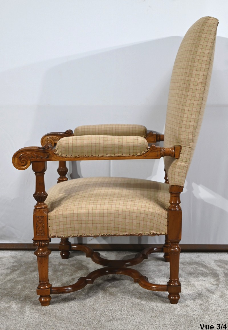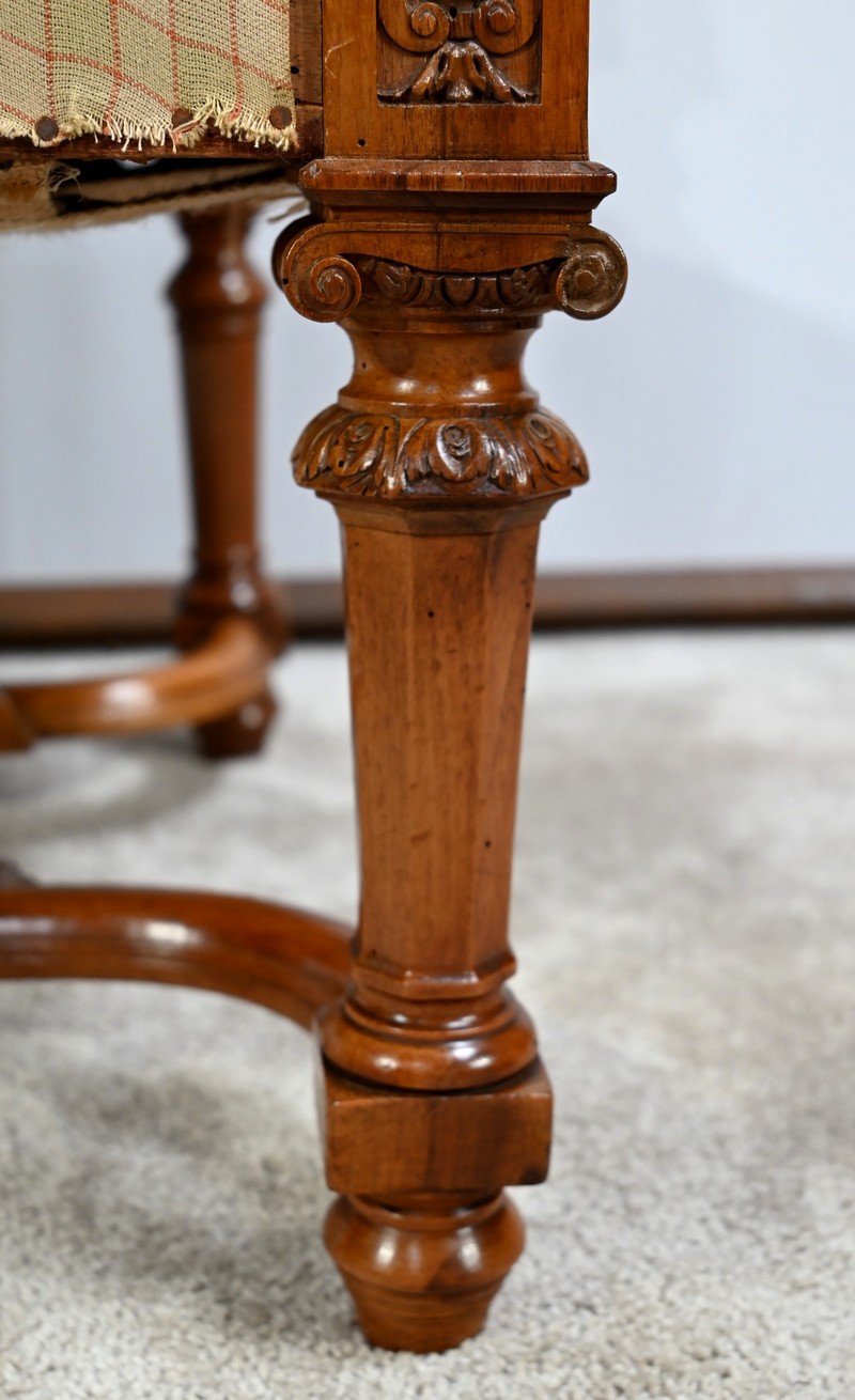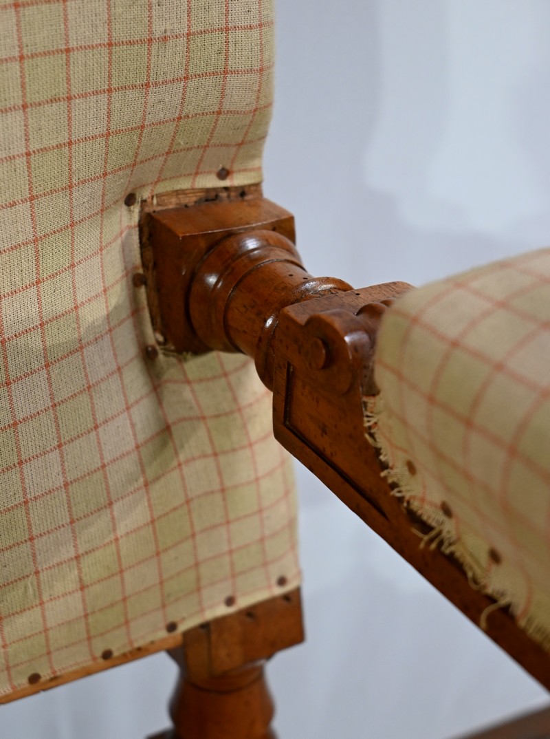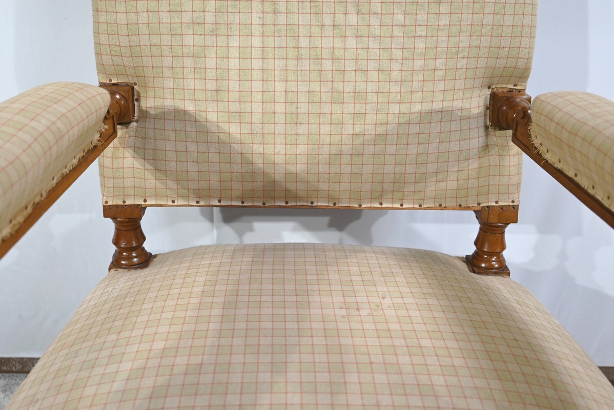 Important fauteuil en noyer de style Louis XVI recouvert d’un tissu d’après clouté sur l’assise, le dossier et les manchettes.