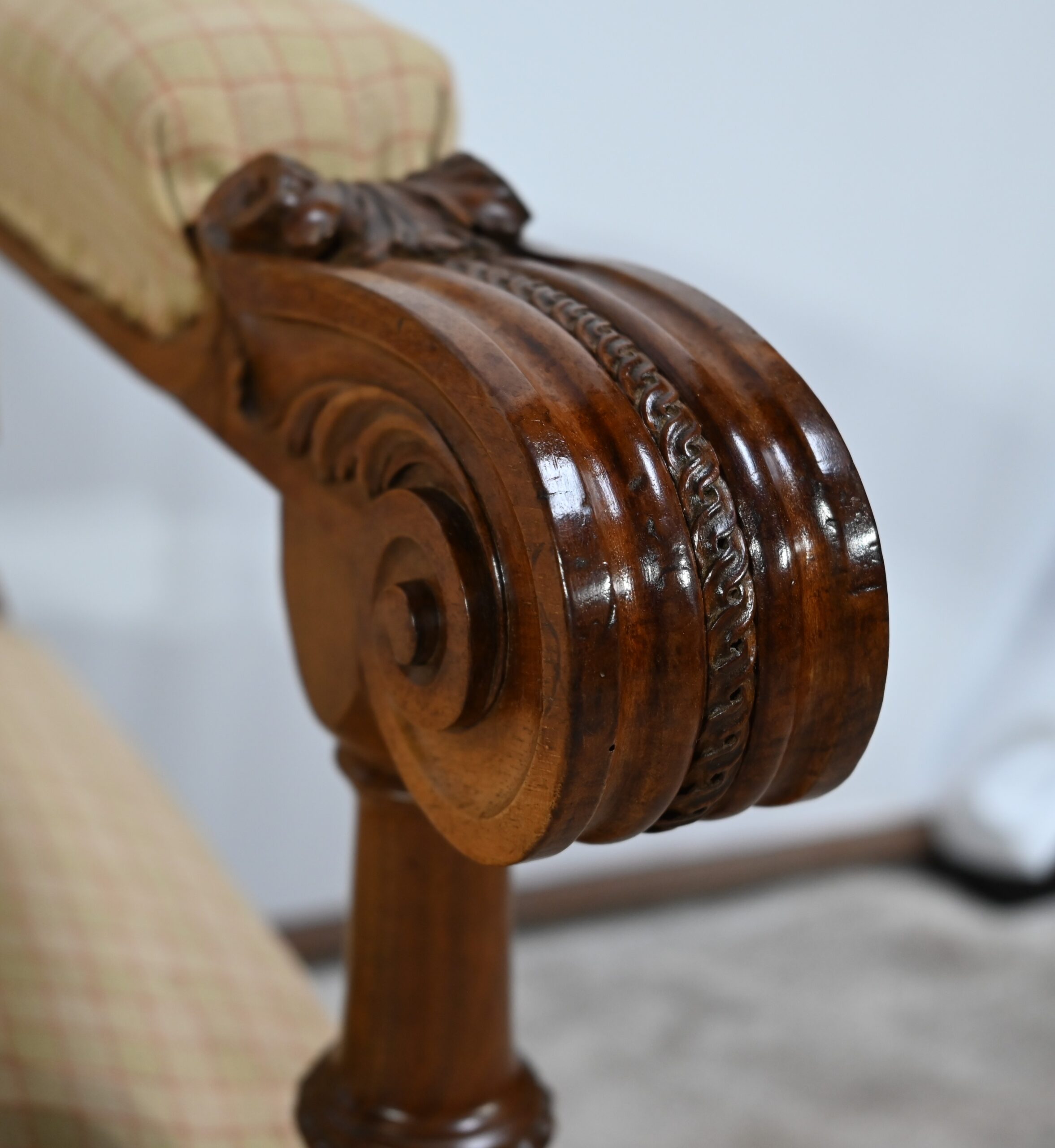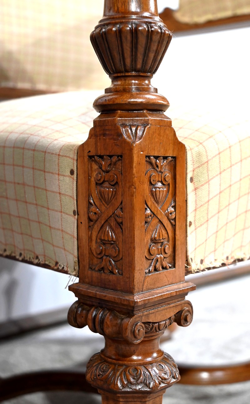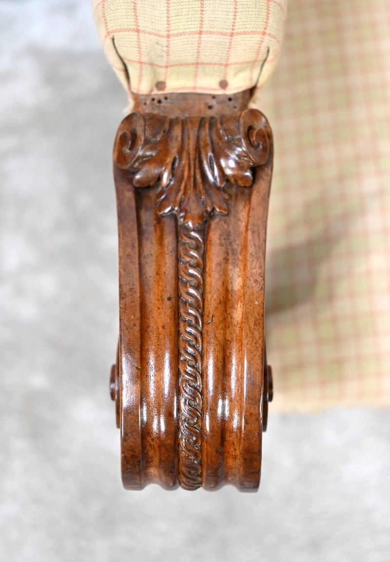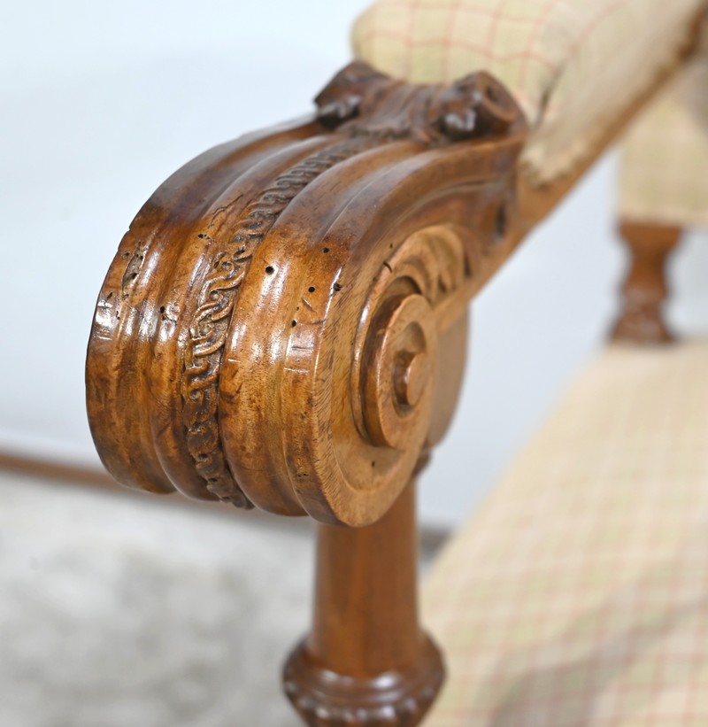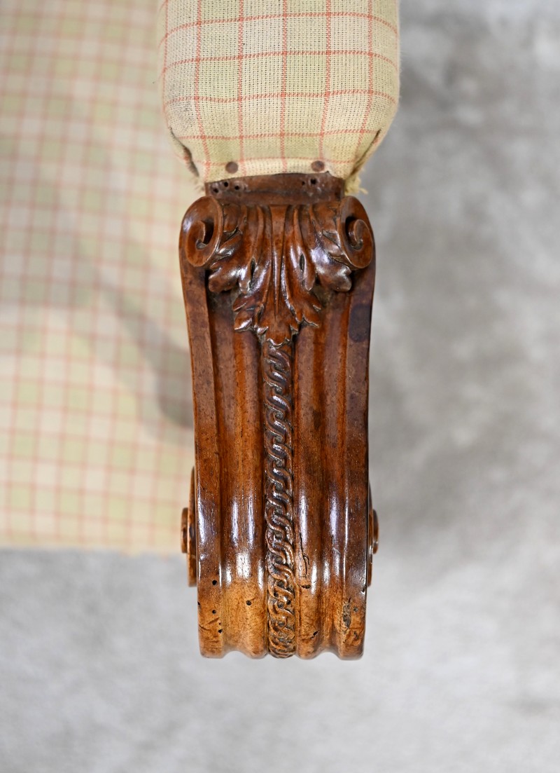 Les accotoirs, pourvus de manchettes, sont moulurés avec yeux en volute et supportés par des consoles en balustre.