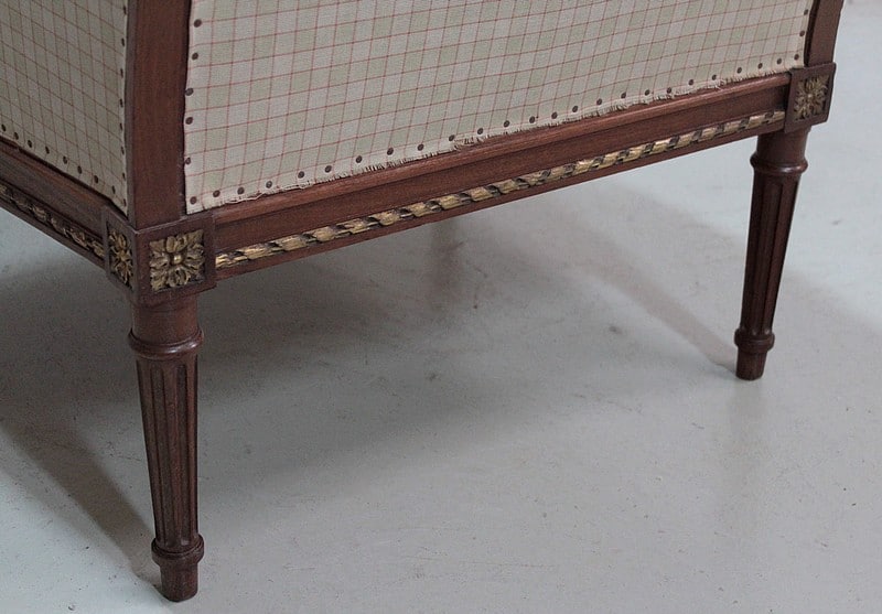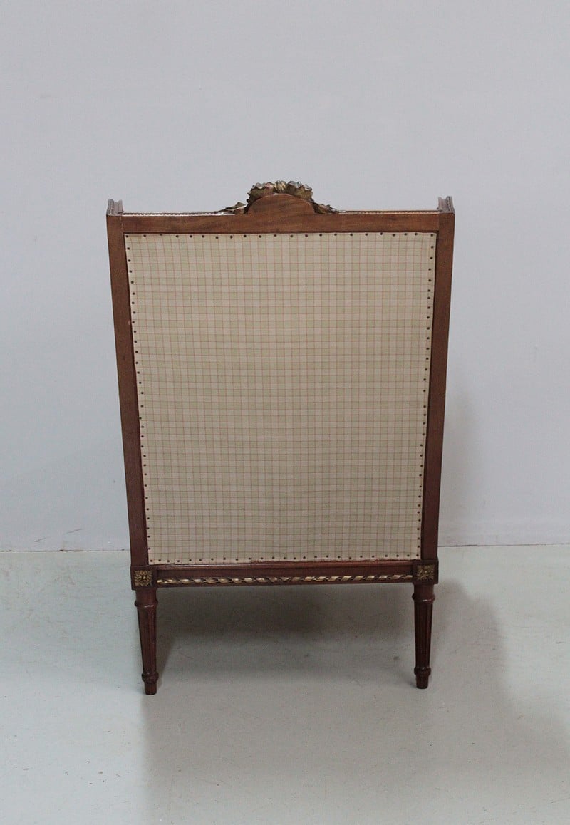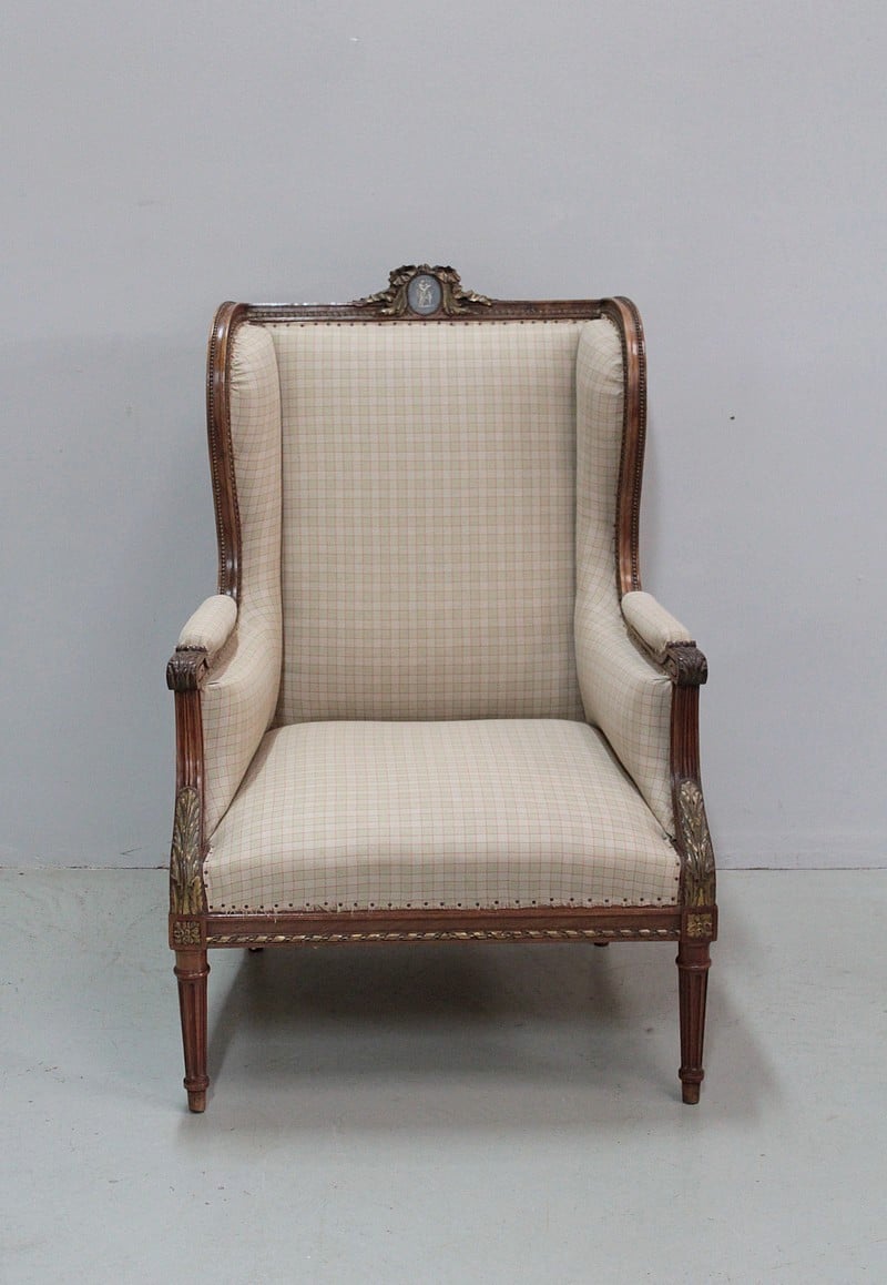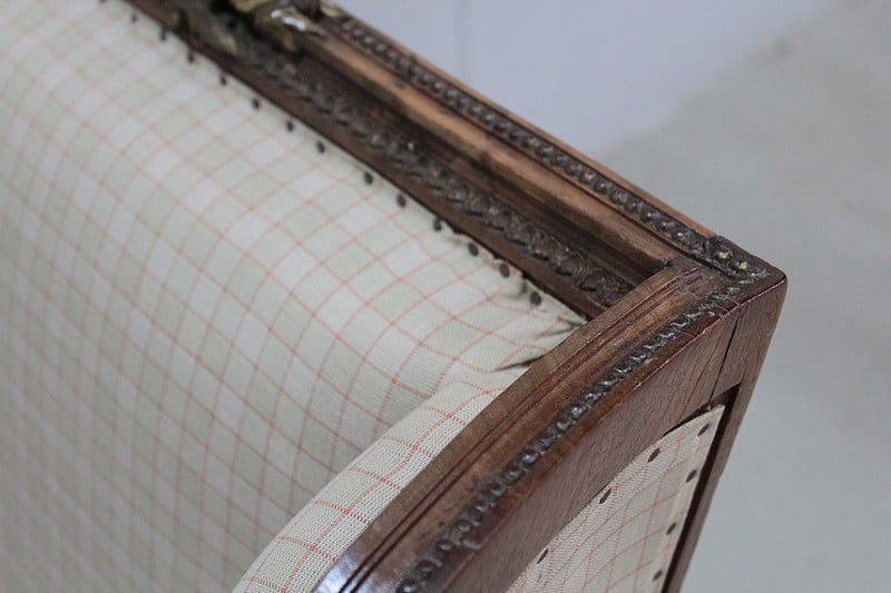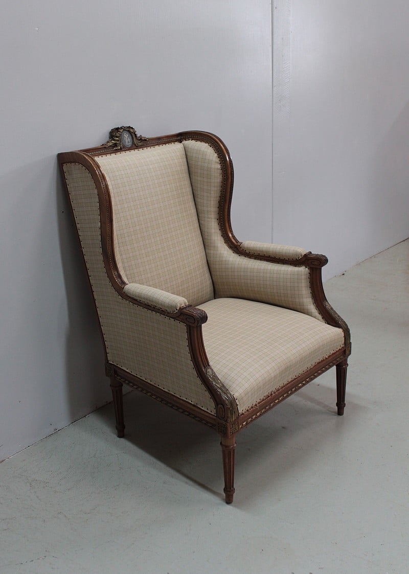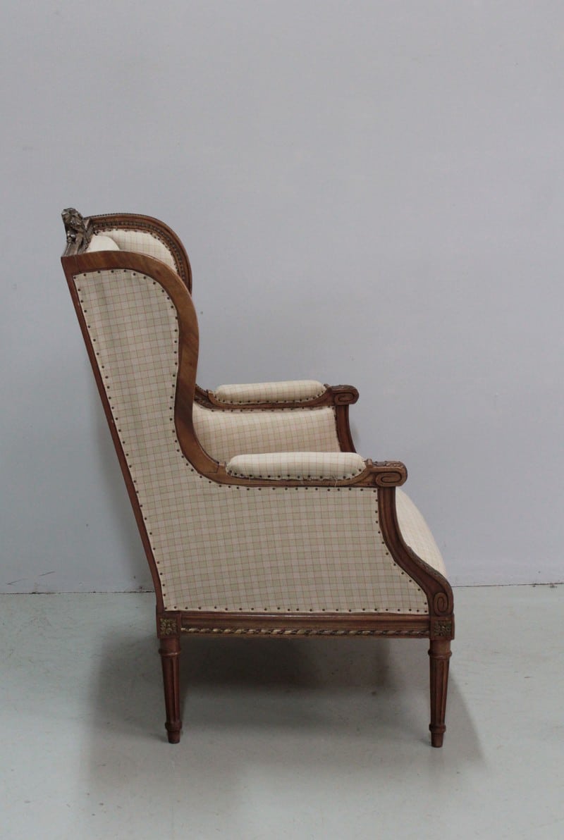 Large bergère à oreilles de style Louis XVI en Noyer ciré naturel.