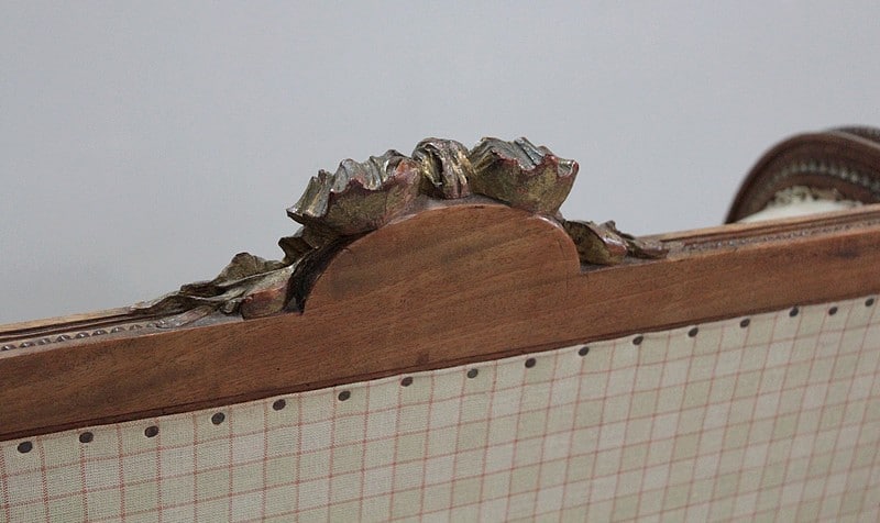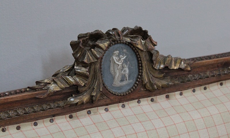 Elle arbore une décoration sur le haut du dossier sous forme de Camé entouré d’un nœud de ruban et de rinceaux.