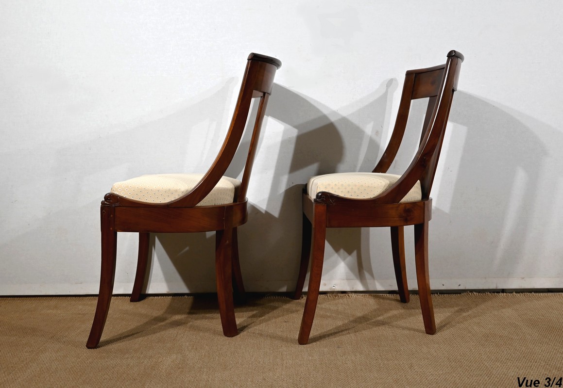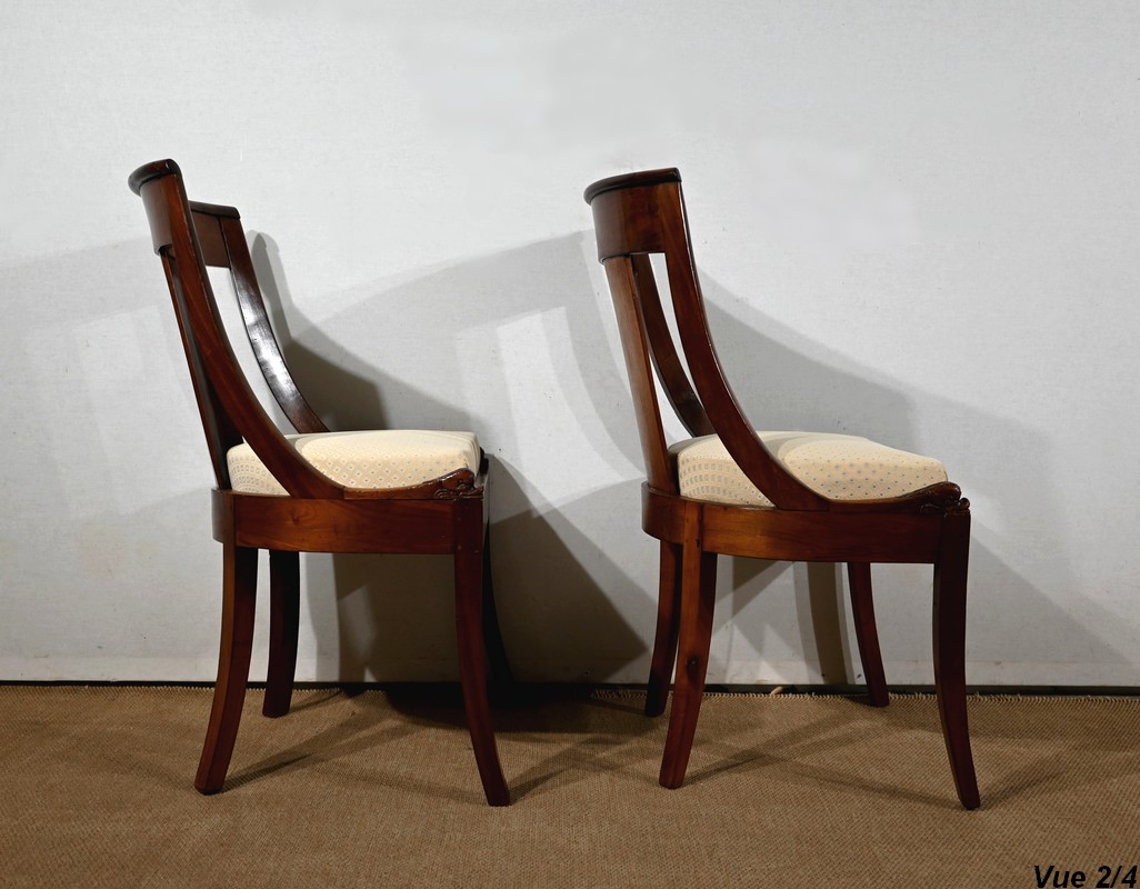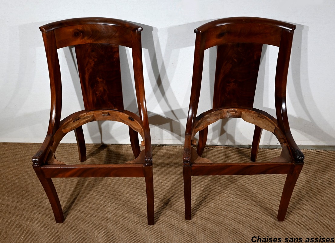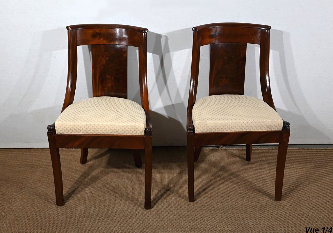 Paire de chaises gondole en acajou massif, à dossier ajouré et incurvé, composé d’un élément central rejoignant une traverse concave. Les montants latéraux en cintre rejoignent la ceinture, plaquée en façade, et se terminent par une sculpture de feuille d’acanthe enroulée.