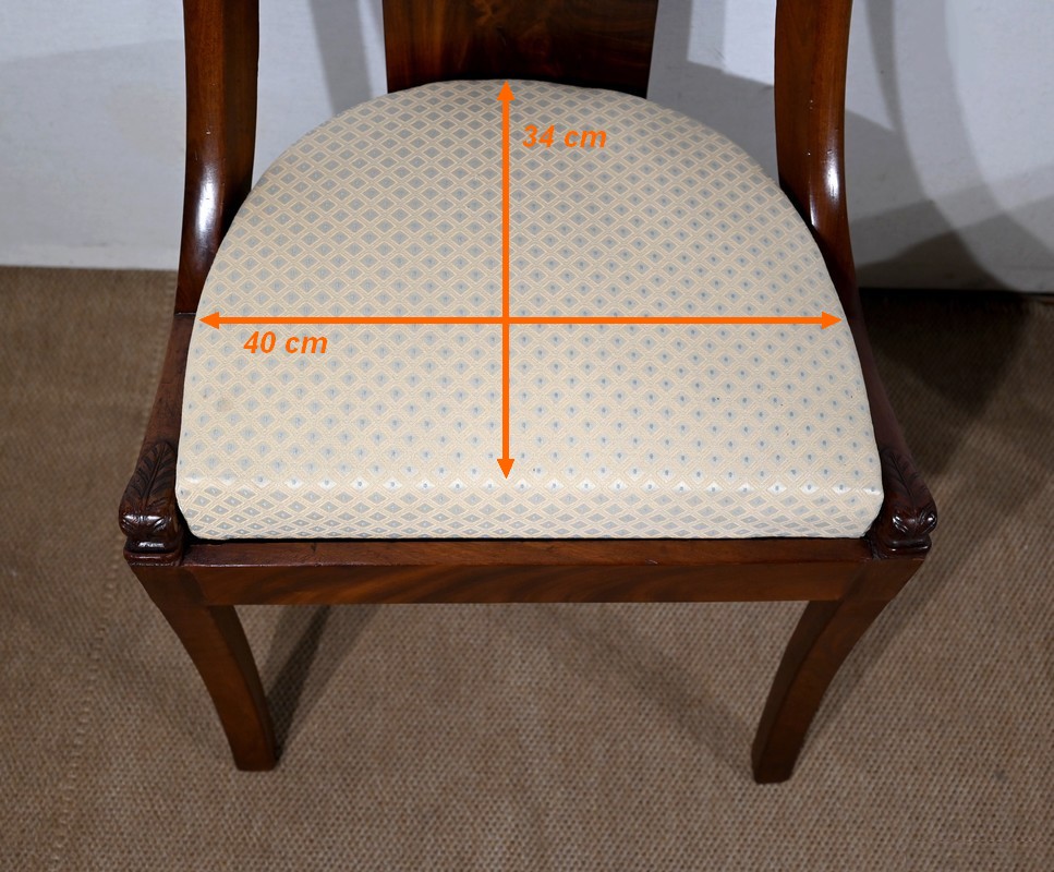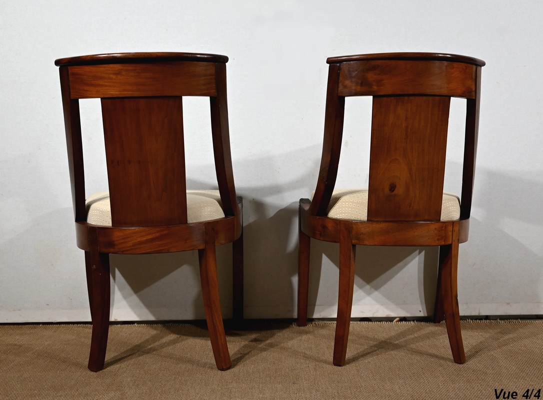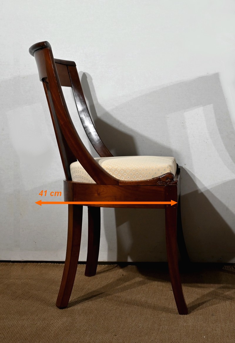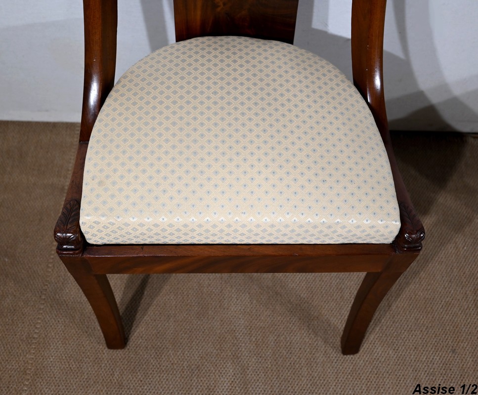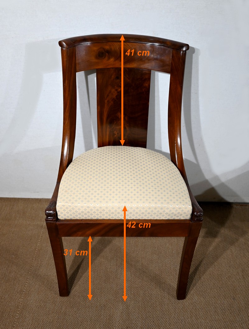 Paire de chaises gondole en acajou massif, à dossier ajouré et incurvé, composé d’un élément central rejoignant une traverse concave. Les montants latéraux en cintre rejoignent la ceinture, plaquée en façade, et se terminent par une sculpture de feuille d’acanthe enroulée.