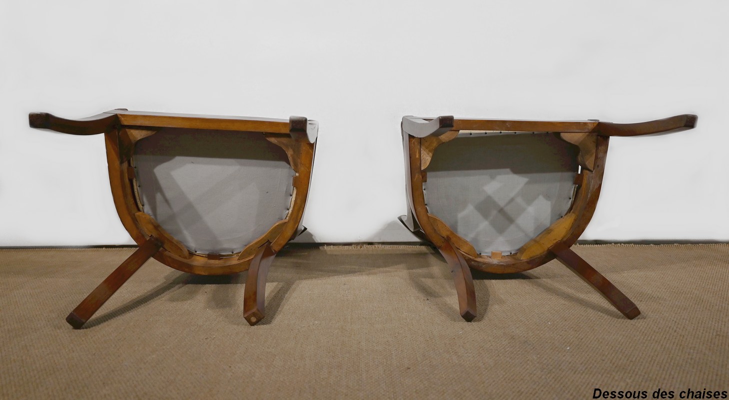 Les assises fermes à pelote avec sangles et crin, à dessous clouté, en parfait état, sont recouvertes d’un tissu beige à motifs losanges. Elles viennent se loger sur une ceinture complètement équerrée.