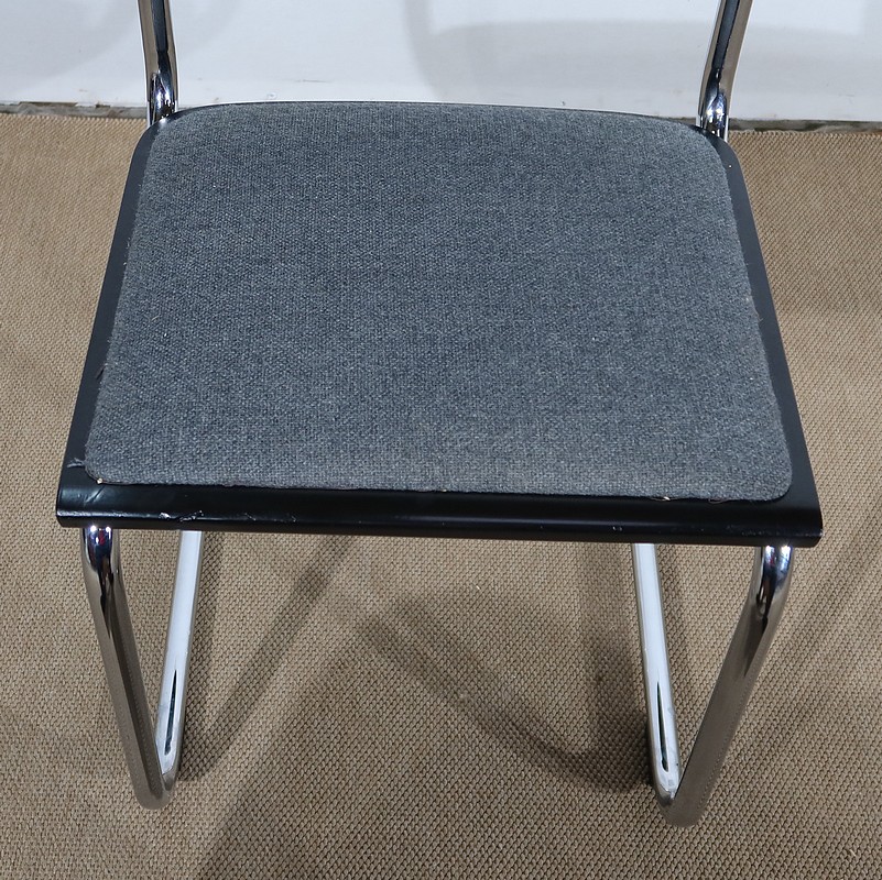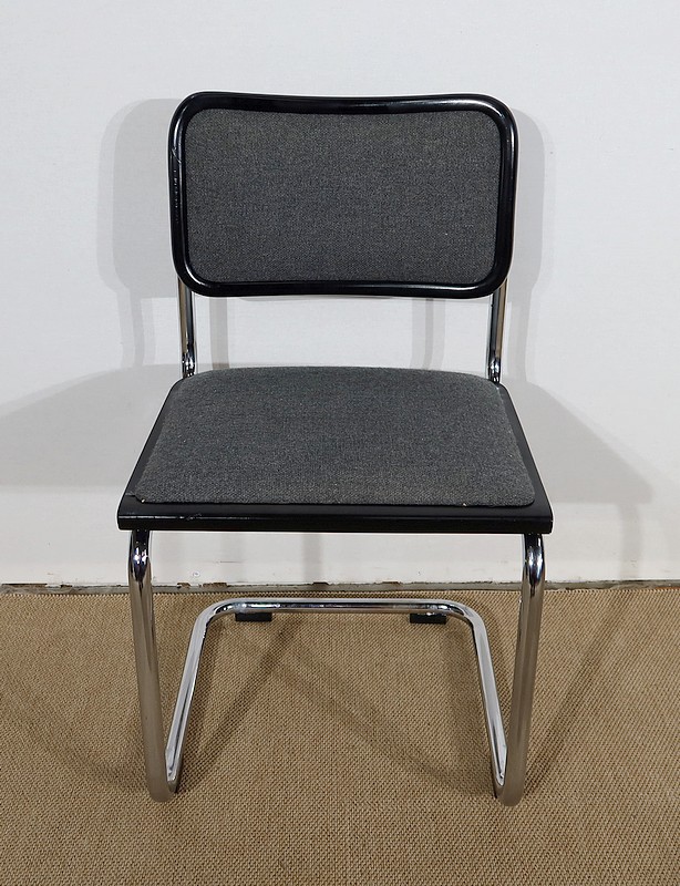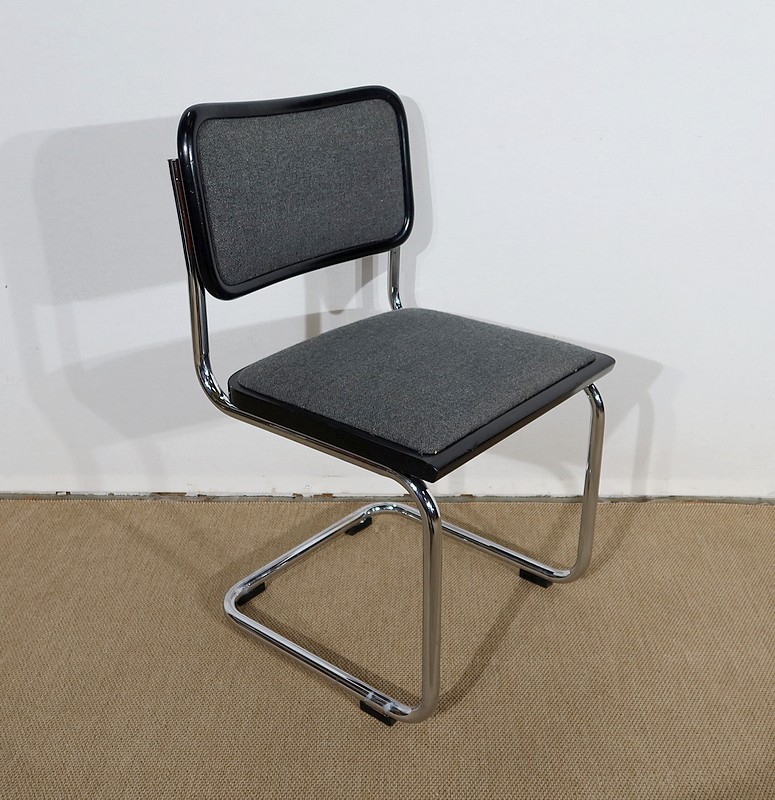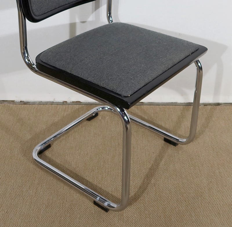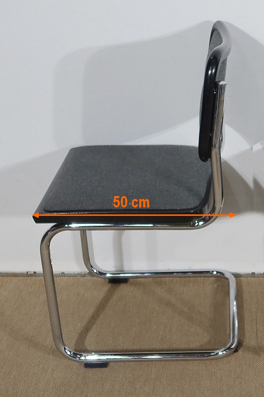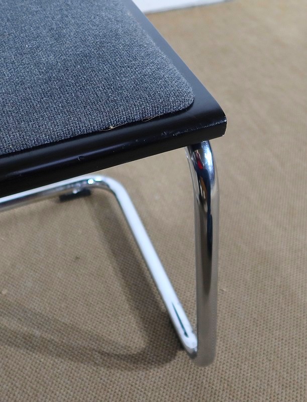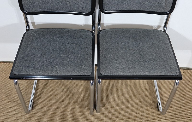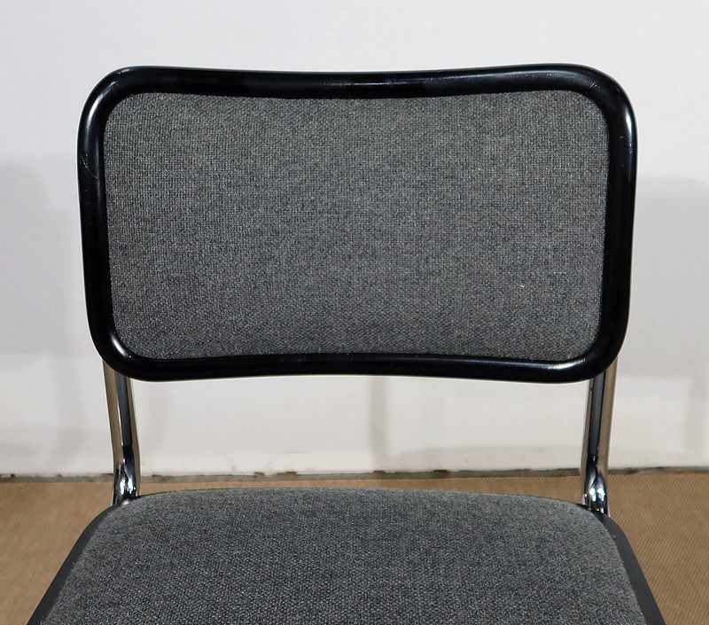 Ses chaises sont composées d’une structure tubulaire en acier chromé avec un piètement à l’esprit aérien. Elles possèdent une assise et un dosseret recouverts d’un tissu épais gris chiné en excellent état, bordés d’un entourage de bois laqué noir de forme arrondie.