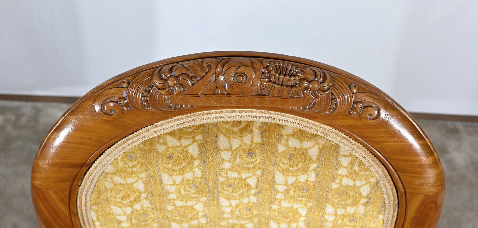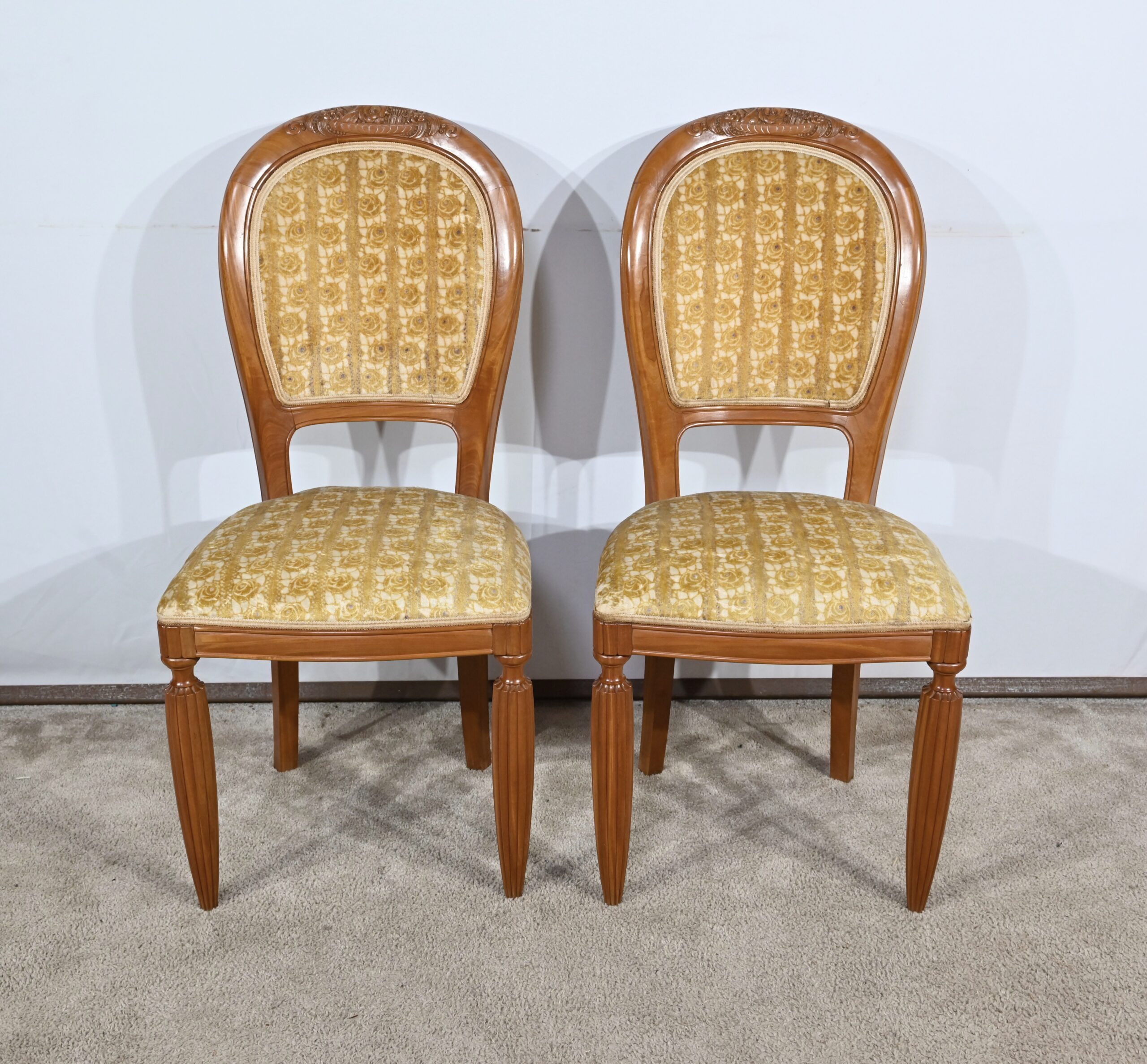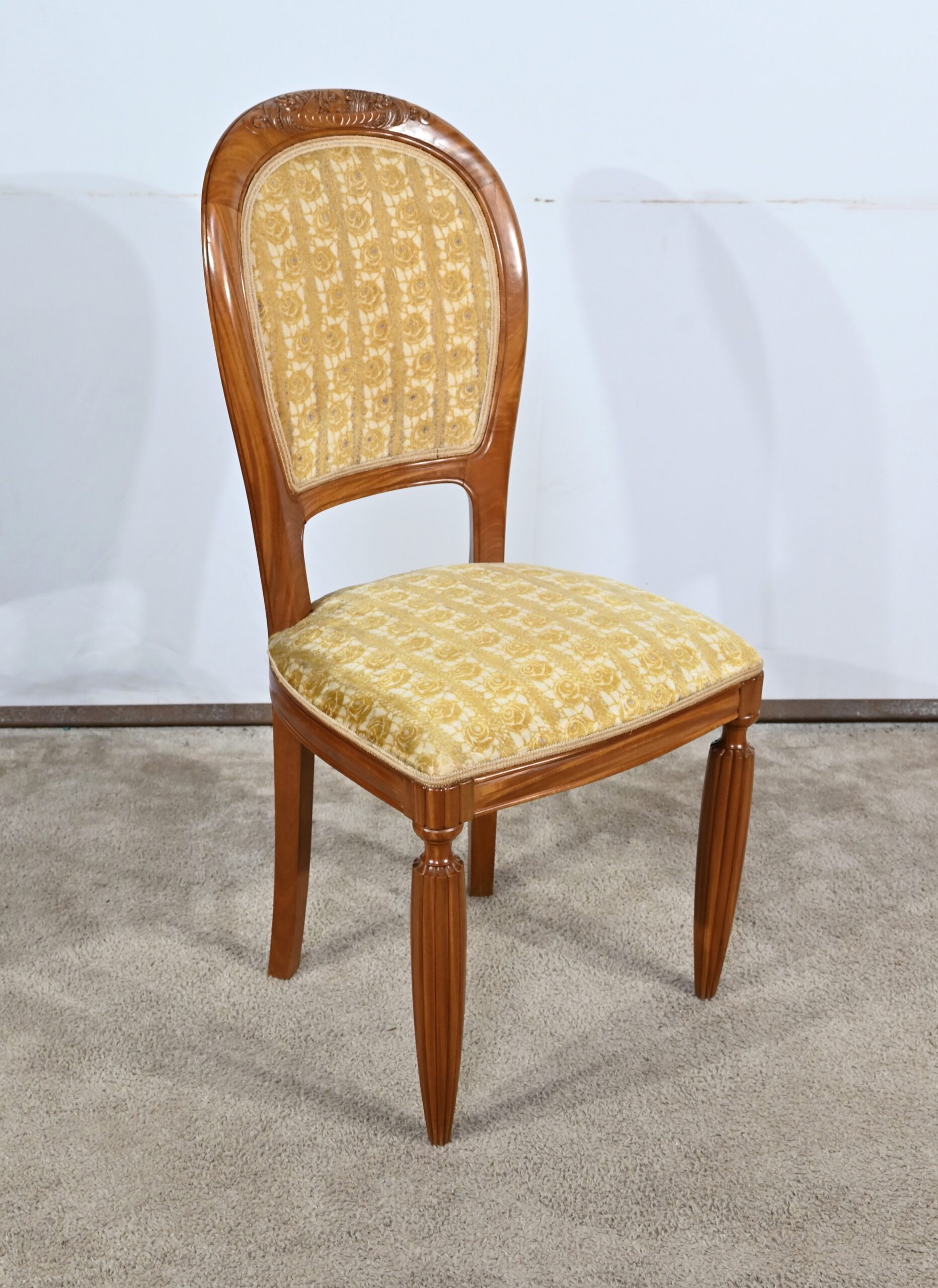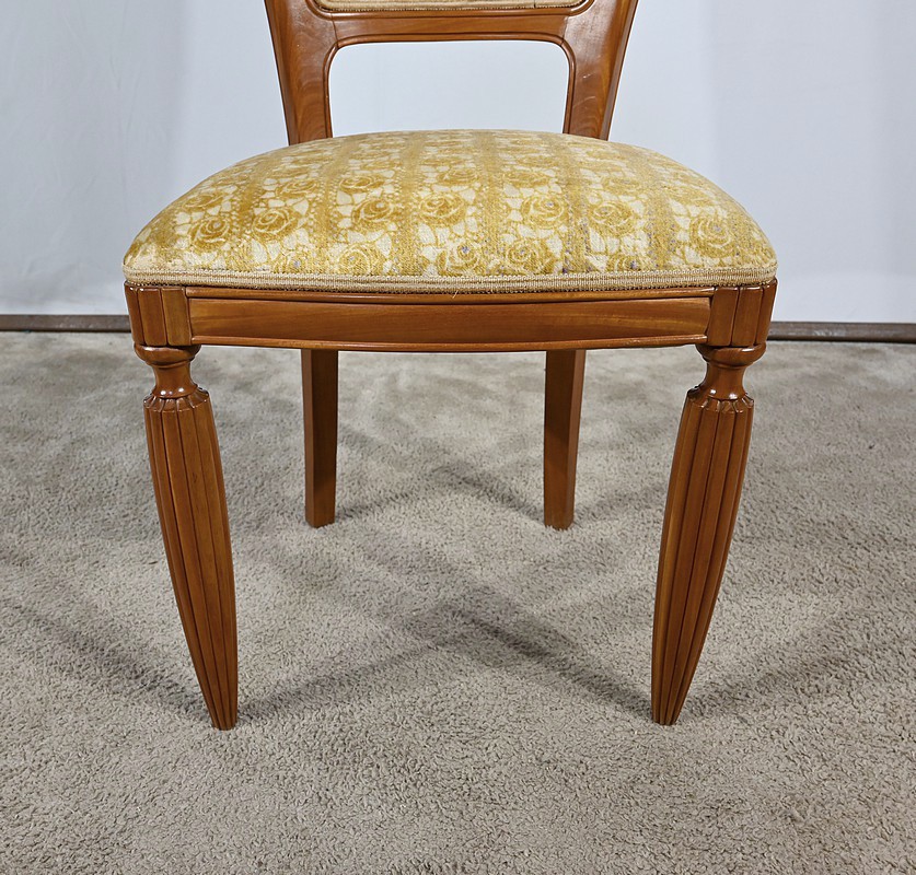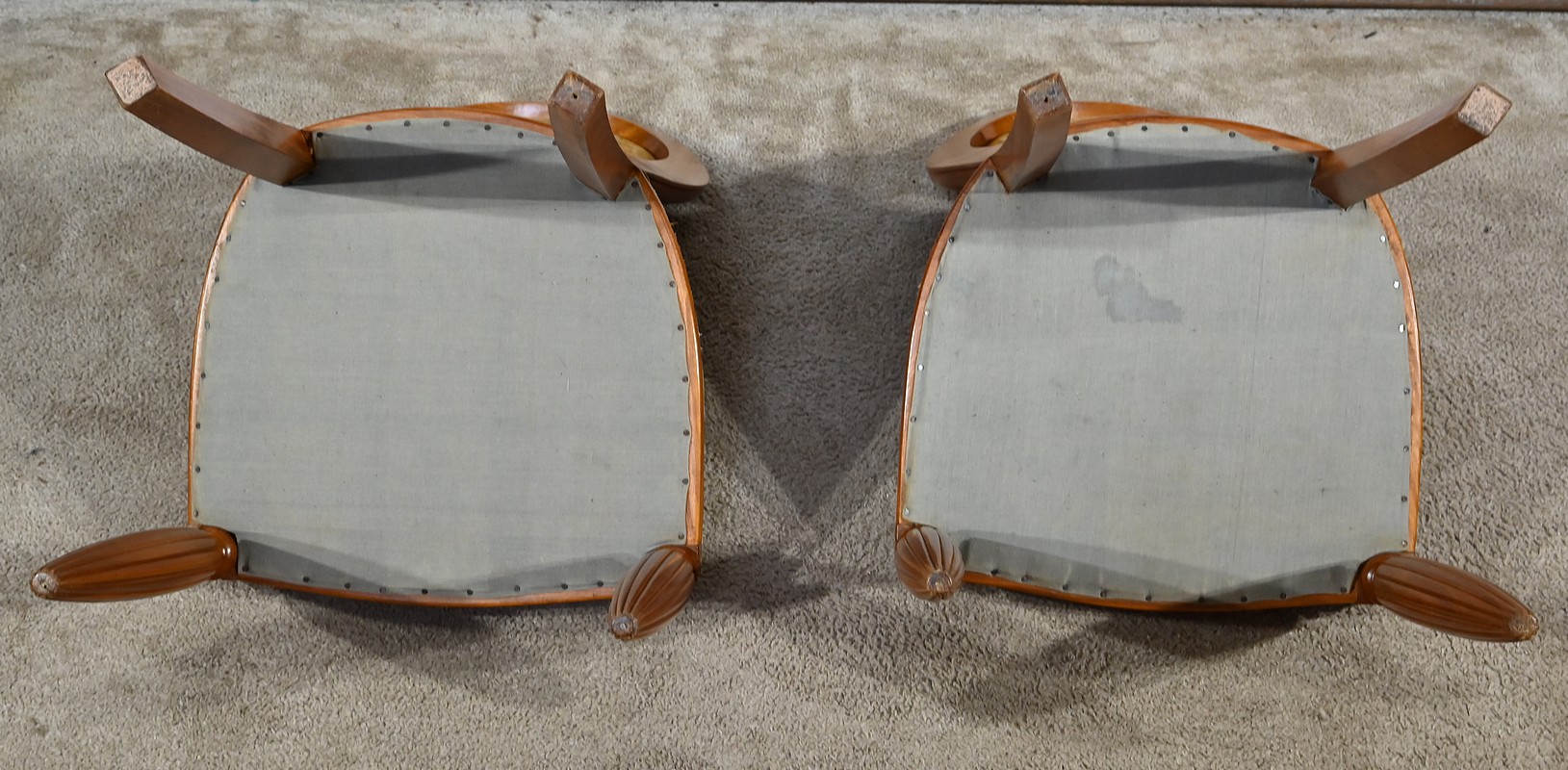 Paire de chaises en acajou blond d’époque Art Déco. Chaque chaise bénéficie d’un dossier en anse de panier cintré, sculpté en partie haute d’une garniture de fleurs et de feuillages. Ces chaises reposent sur des pieds avant cannelés en forme d’ogive allongée. Les pieds arrières sont tournés vers l’extérieur pour plus de stabilité. La structure est en parfait état et les assises d’origine sont habillées d’un velours jaune aux motifs floraux.