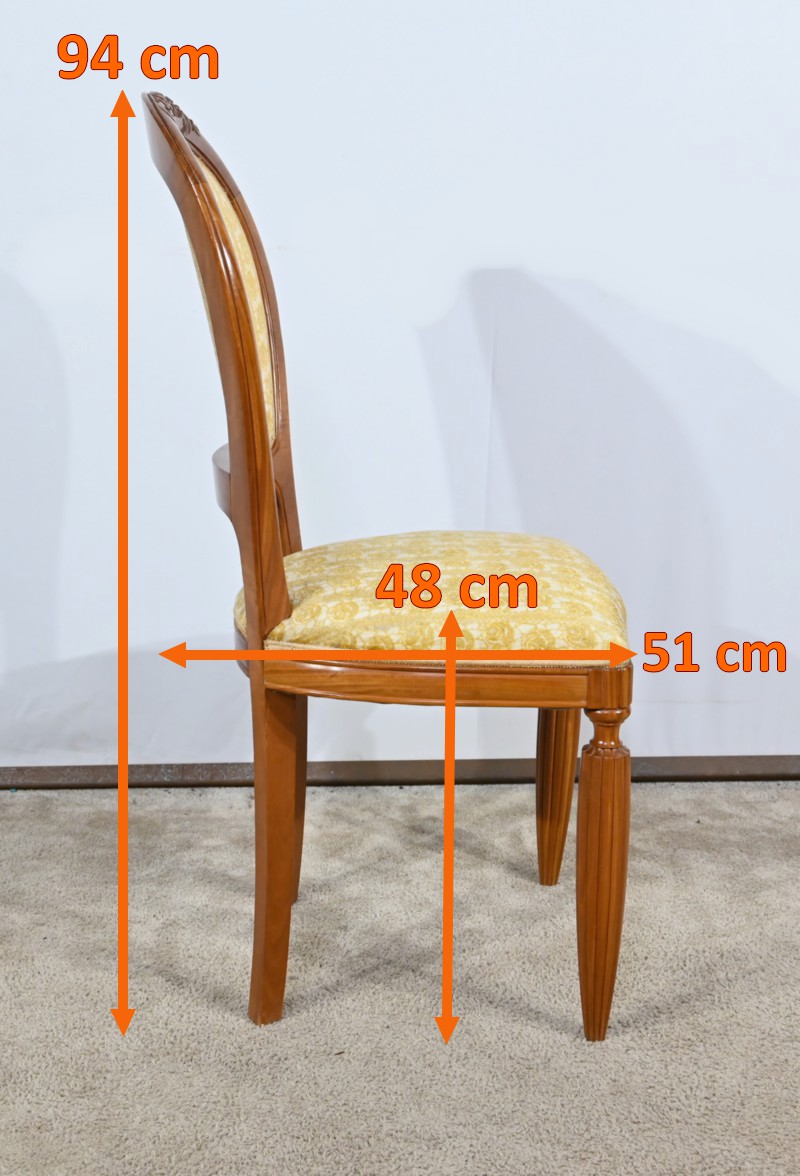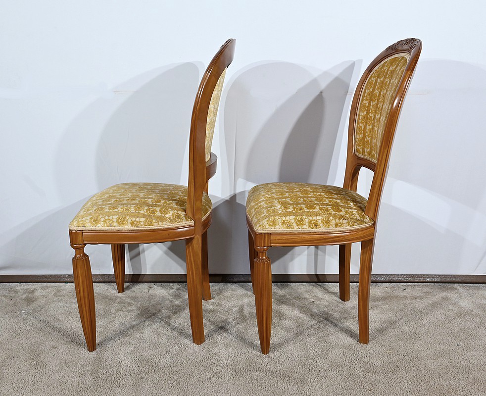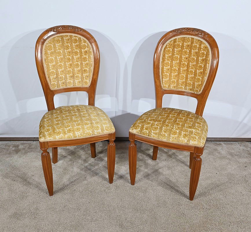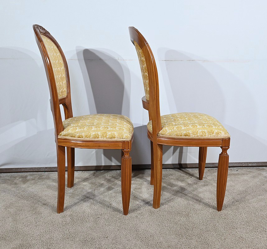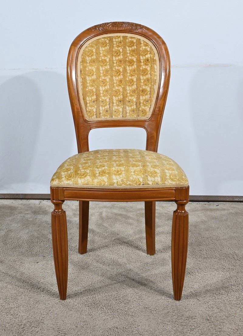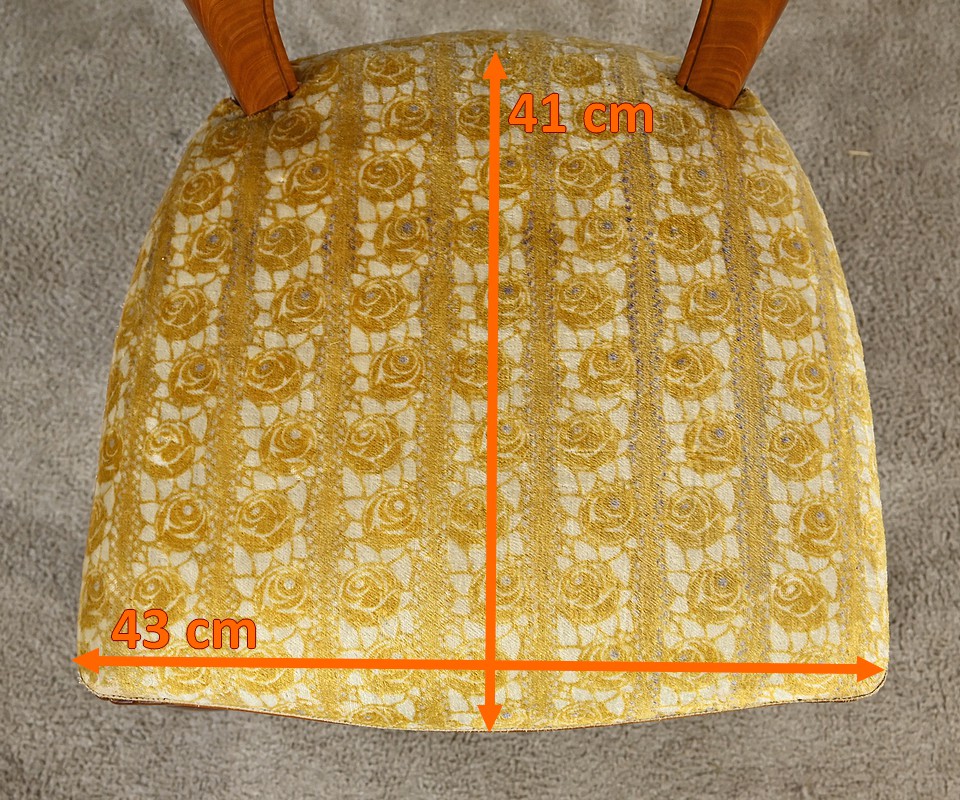 Paire de chaises en acajou blond d’époque Art Déco. Chaque chaise bénéficie d’un dossier en anse de panier cintré, sculpté en partie haute d’une garniture de fleurs et de feuillages. Ces chaises reposent sur des pieds avant cannelés en forme d’ogive allongée. Les pieds arrières sont tournés vers l’extérieur pour plus de stabilité. La structure est en parfait état et les assises d’origine sont habillées d’un velours jaune aux motifs floraux.