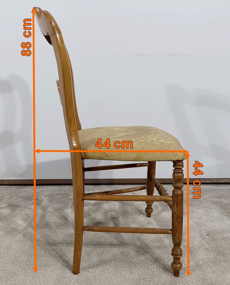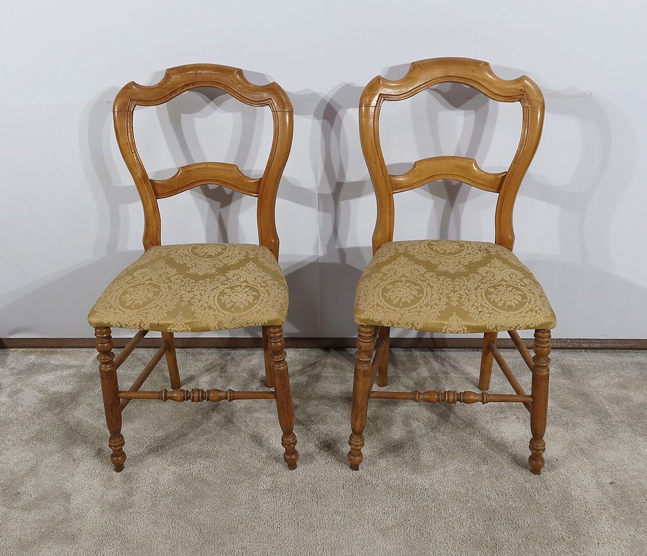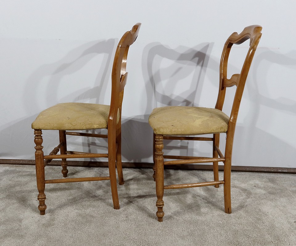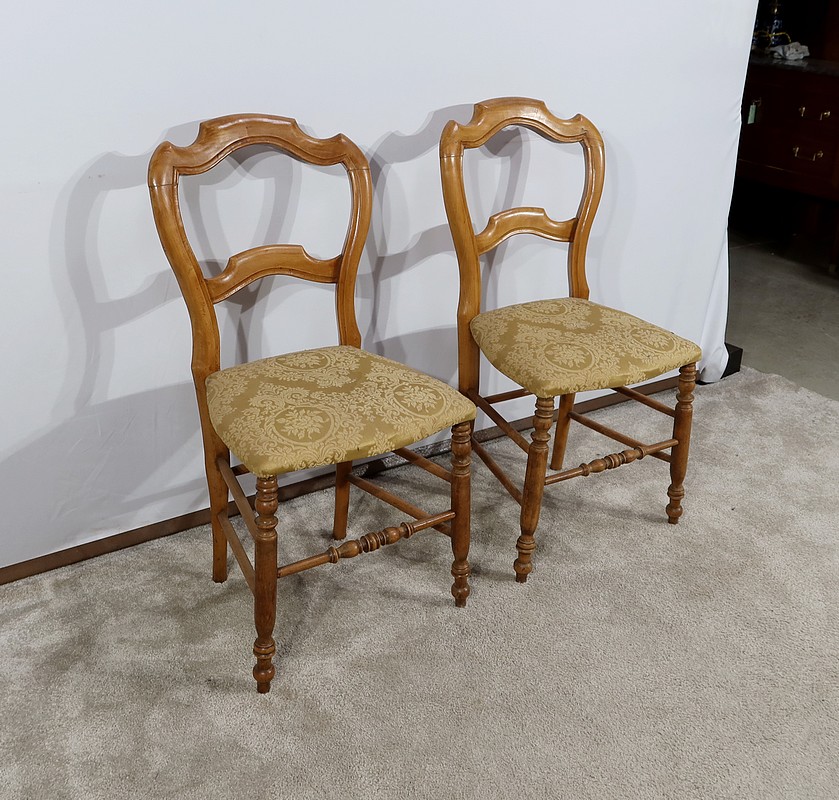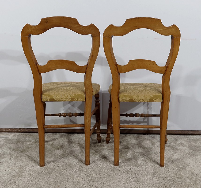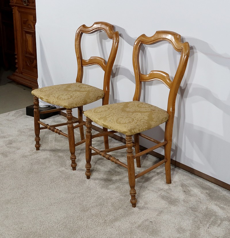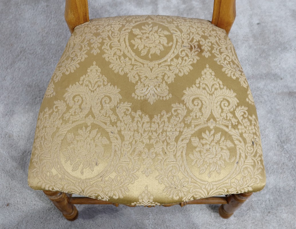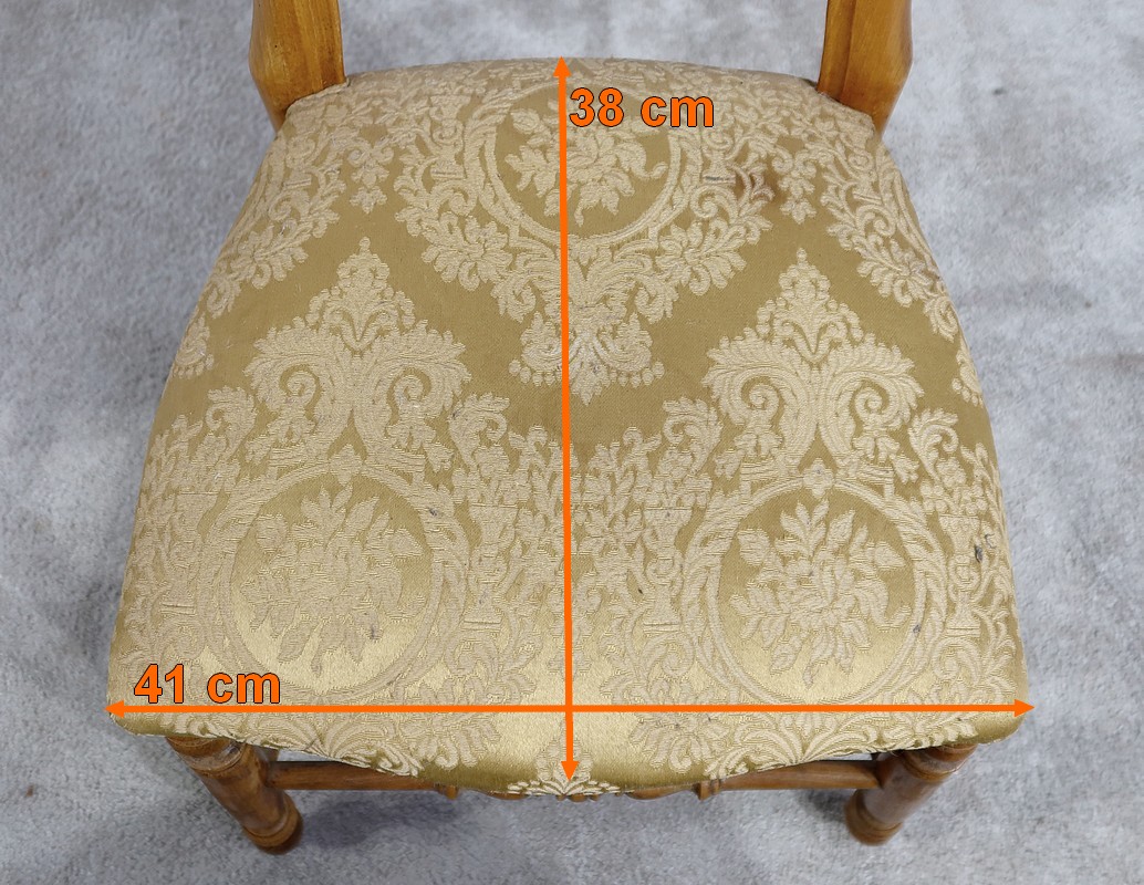 Paire de chaises Louis-Philippe en hêtre massif reposant sur des pieds avant tournés, reliés par un barreau également tourné. Les pieds « sabre » à l’arrière sont reliés aux autres par des entretoises assurant stabilité et solidité. L’assise est habillée d’une soierie usitée, de couleur or, qu’il conviendra de changer selon votre souhait. Le dossier découpé et galbé est mouluré.