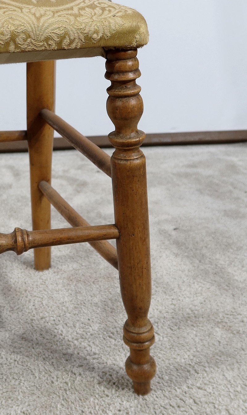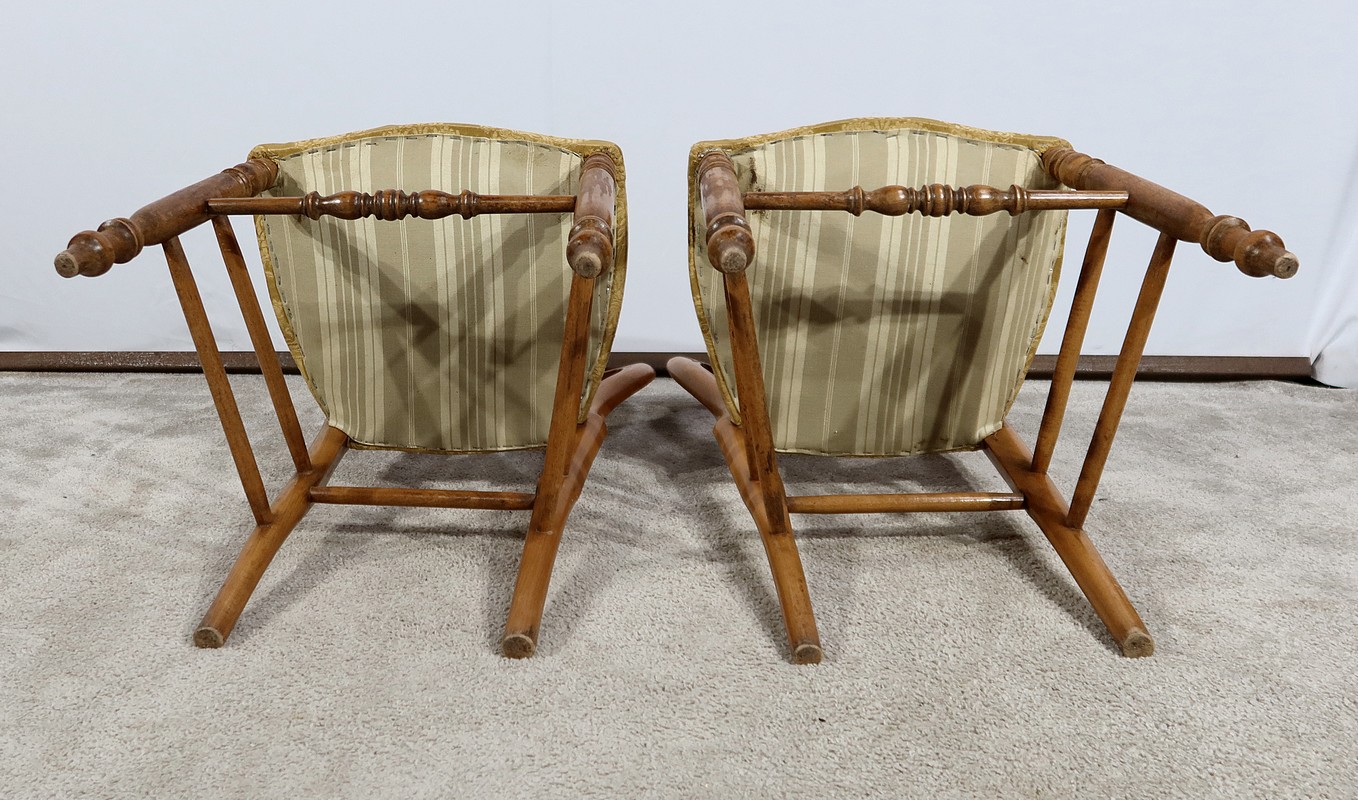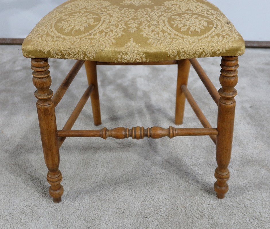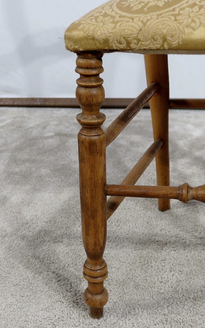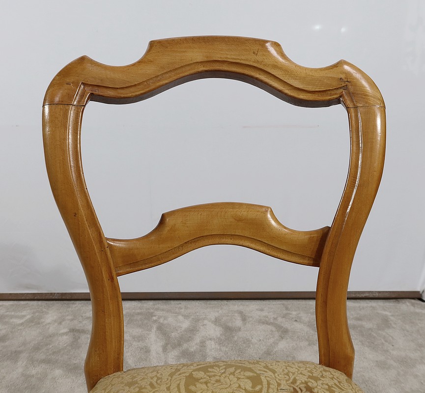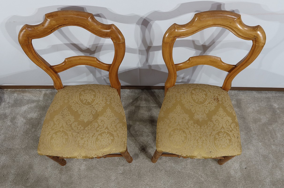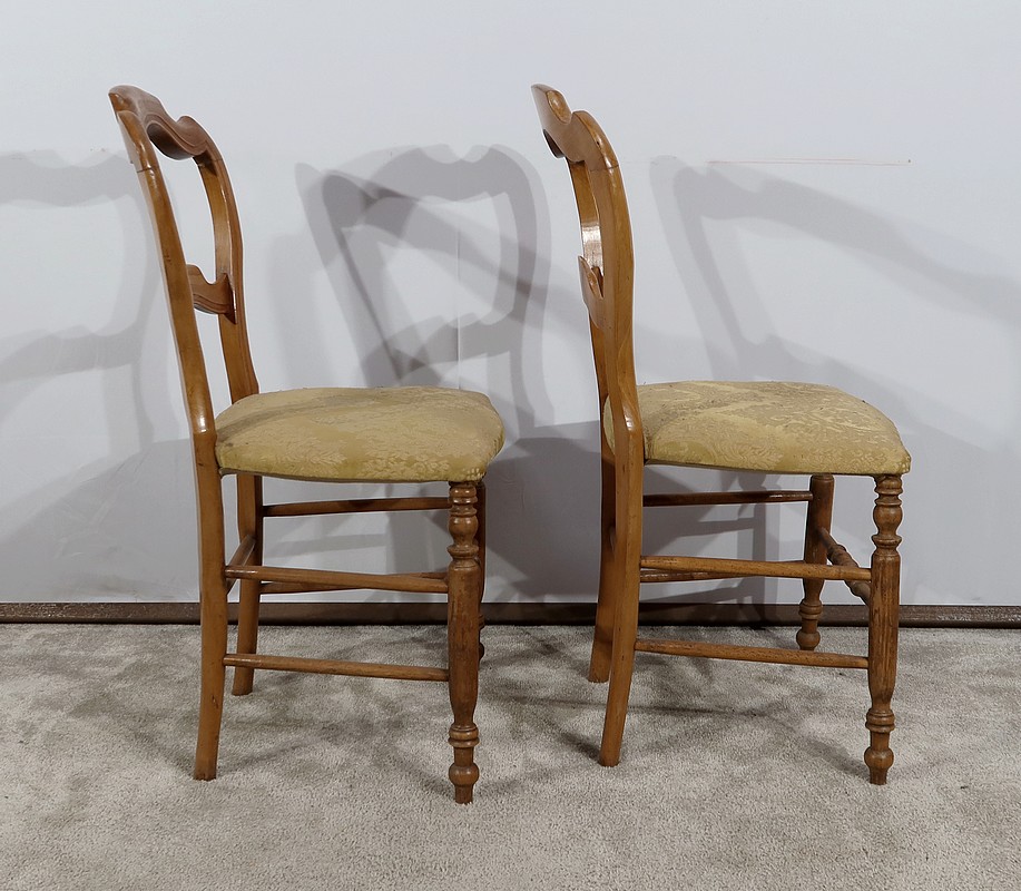 Paire de chaises Louis-Philippe en hêtre massif reposant sur des pieds avant tournés, reliés par un barreau également tourné. Les pieds « sabre » à l’arrière sont reliés aux autres par des entretoises assurant stabilité et solidité. L’assise est habillée d’une soierie usitée, de couleur or, qu’il conviendra de changer selon votre souhait. Le dossier découpé et galbé est mouluré.