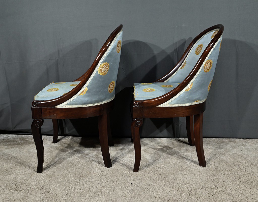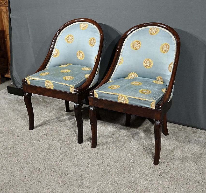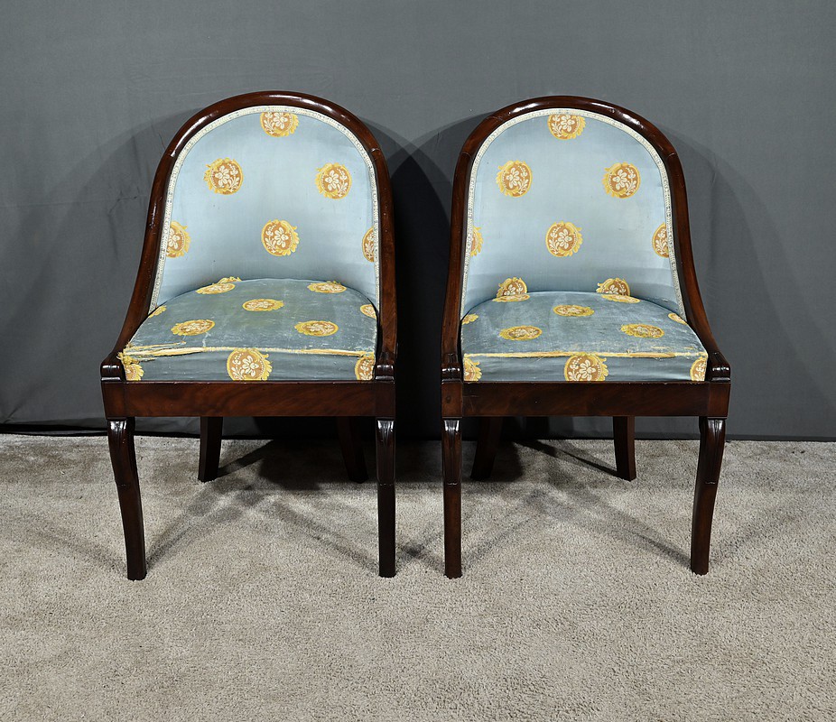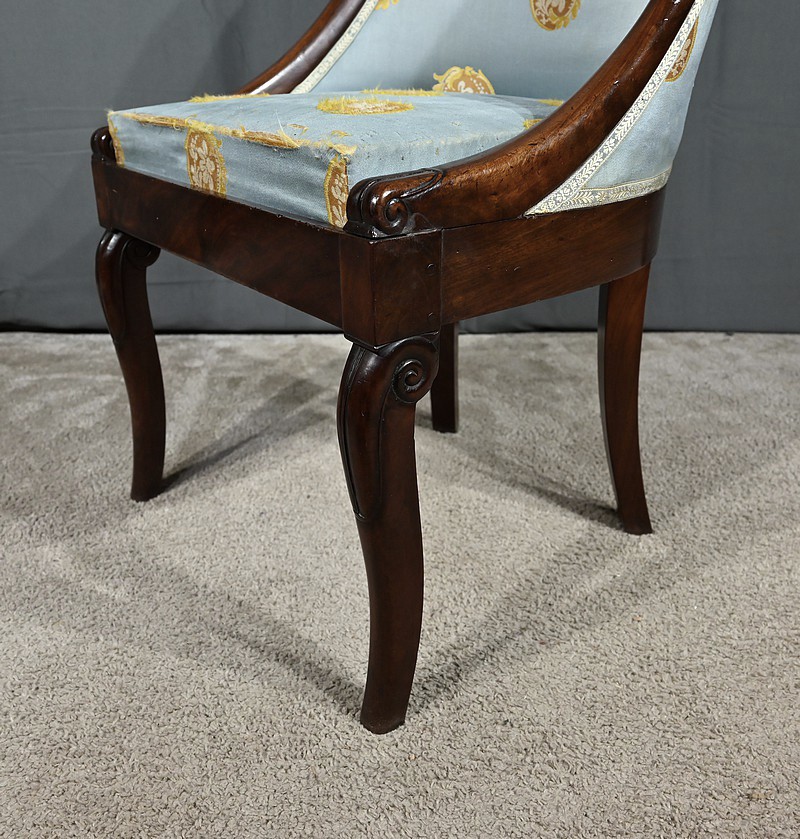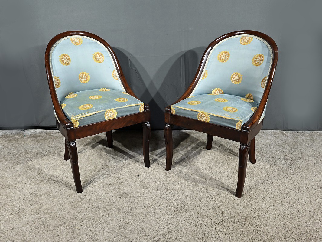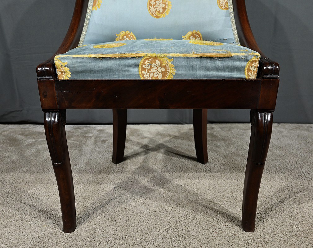 Bel ensemble de chaises en acajou massif dotées d’un dossier gondole enveloppant muni d’un long bandeau en acajou cintré et d’une garniture de soierie d’origine, bleue irisée.