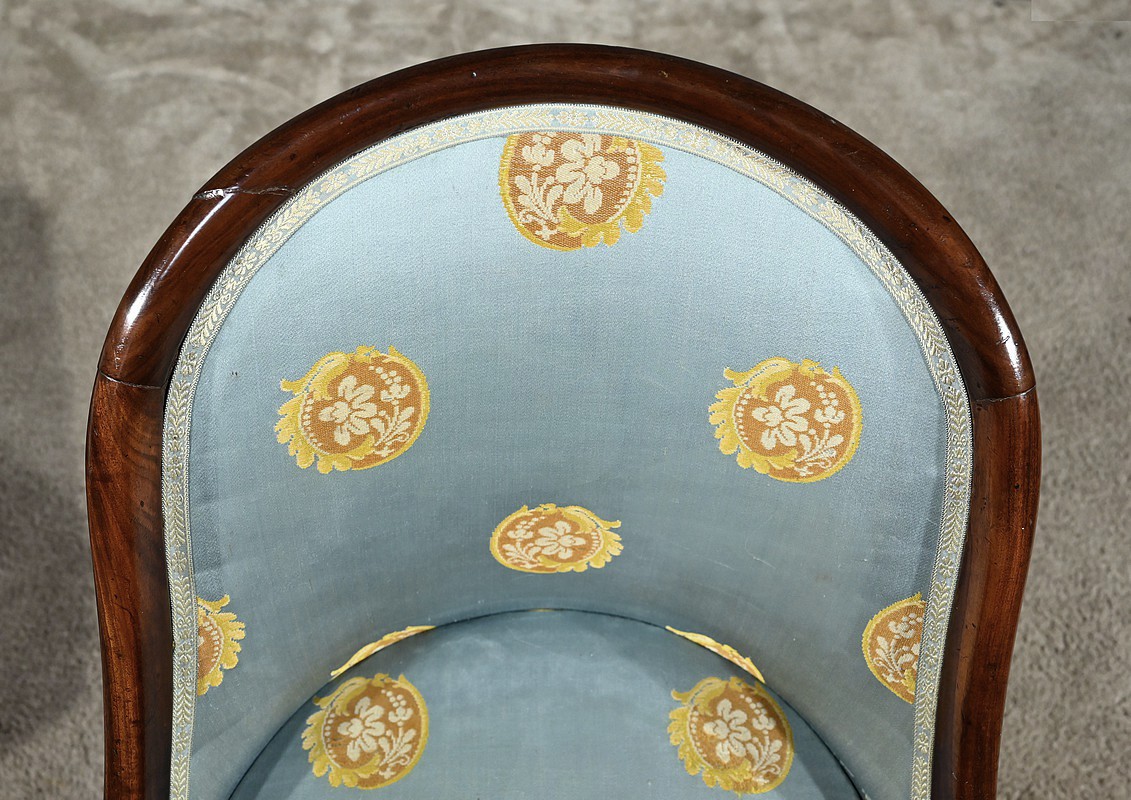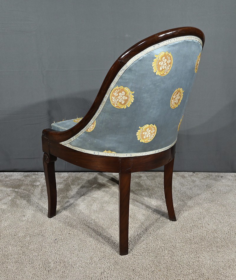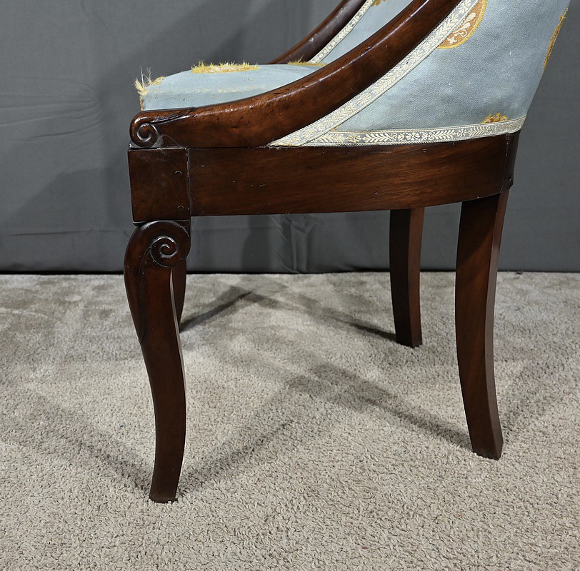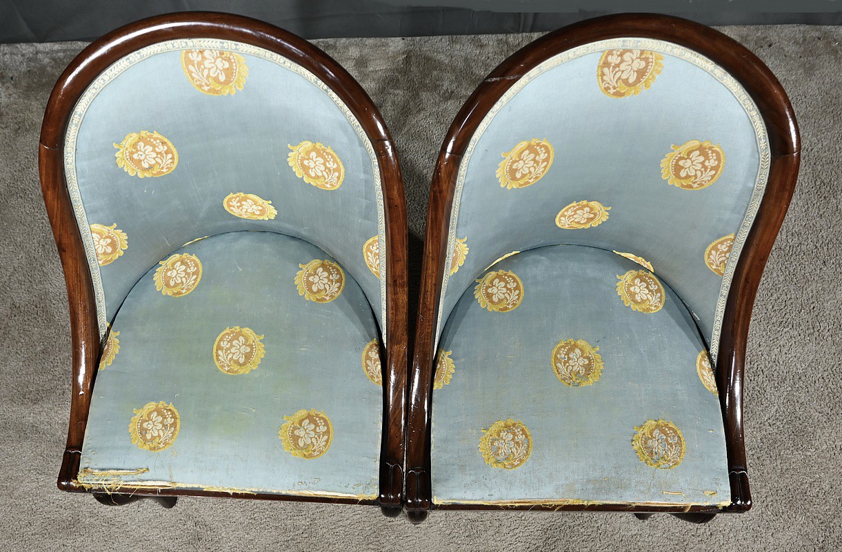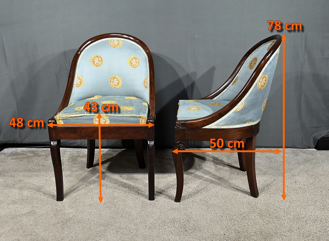 Bel ensemble de chaises en acajou massif dotées d’un dossier gondole enveloppant muni d’un long bandeau en acajou cintré et d’une garniture de soierie d’origine, bleue irisée.