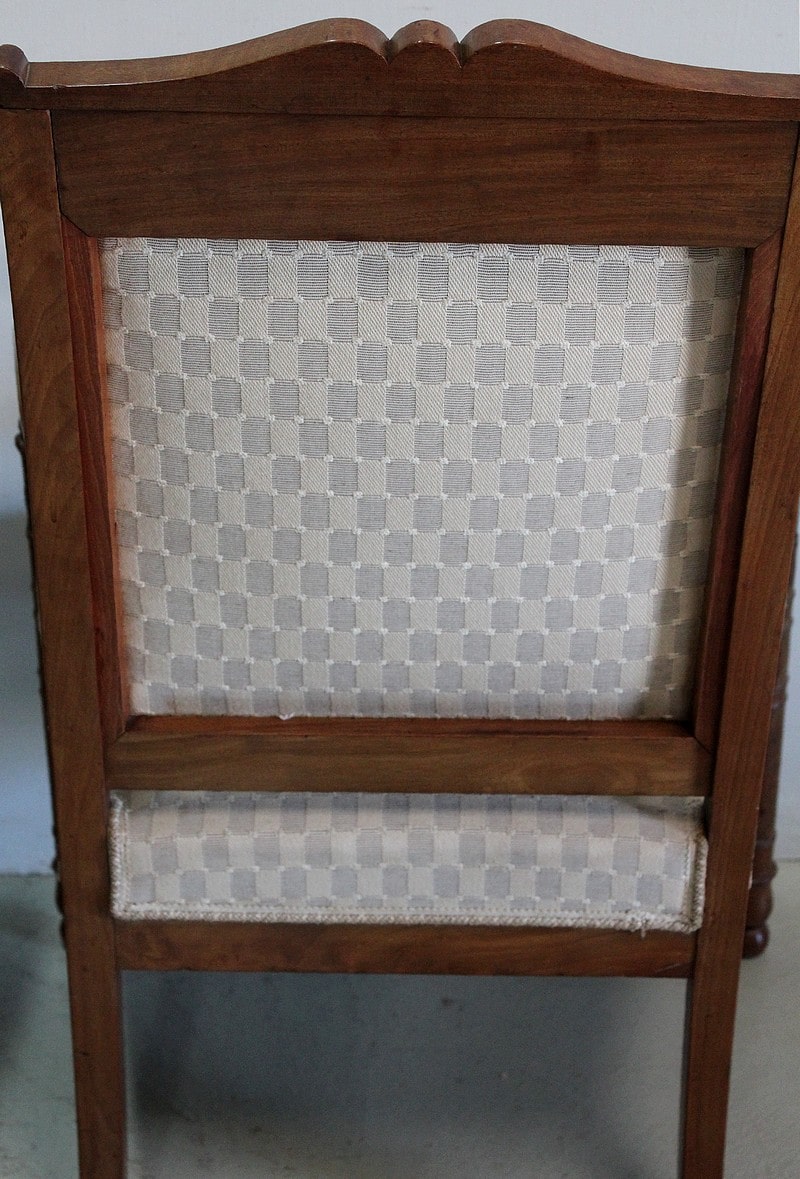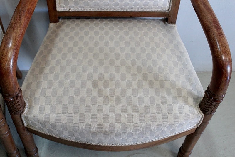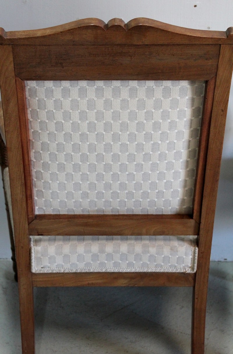 Le dossier et l’assise sont recouverts d’un tissu postérieur en damier de couleur crème et les assises en bon état, sont marquées de légères tâches auréolées.