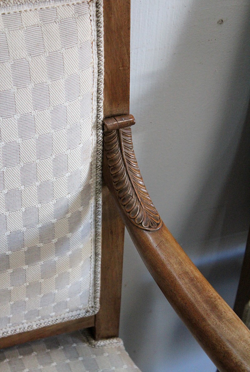 La structure est sculptée en haut du dossier d’un motif symétrique en palmettes et arbore également des palmettes en partie haute des accotoirs ainsi que sur les dès de raccordements.