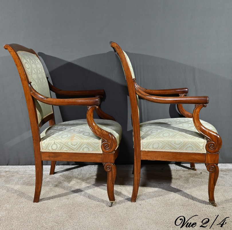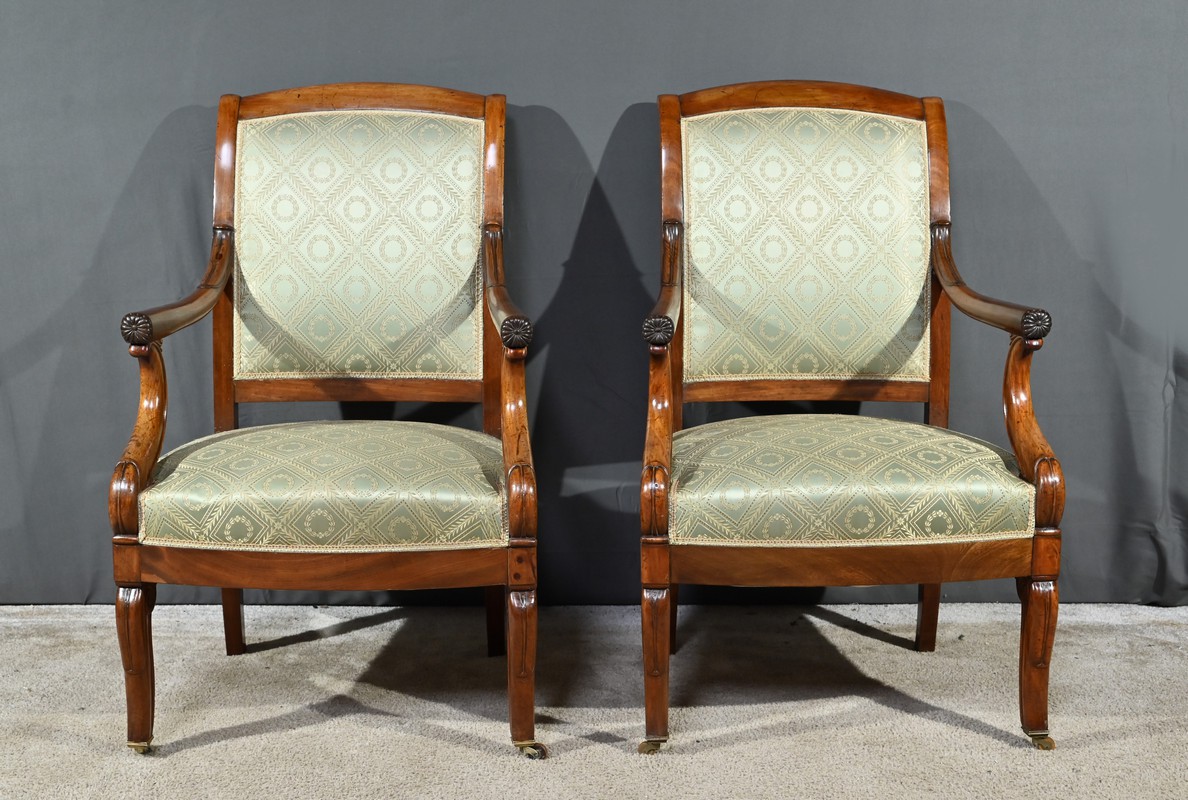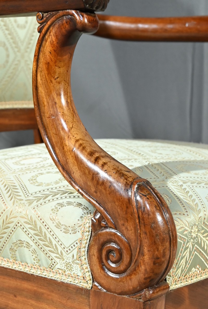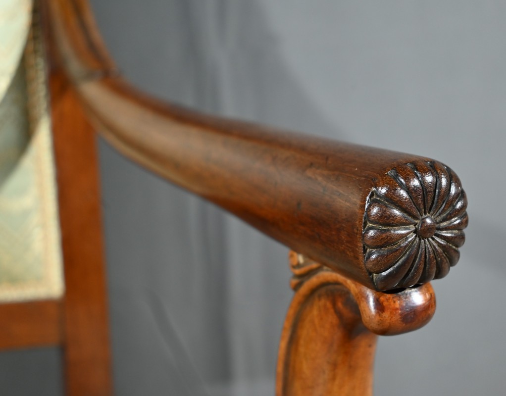 Ces fauteuils d’époque en acajou, se distinguent par des lignes douces et complexes propres au style restauration.