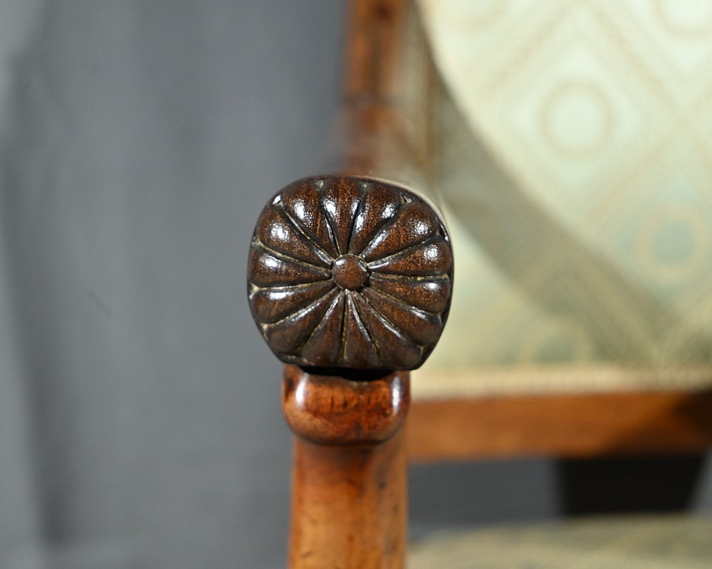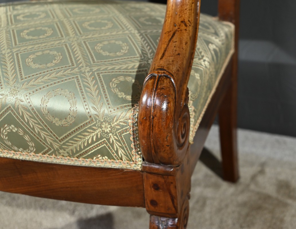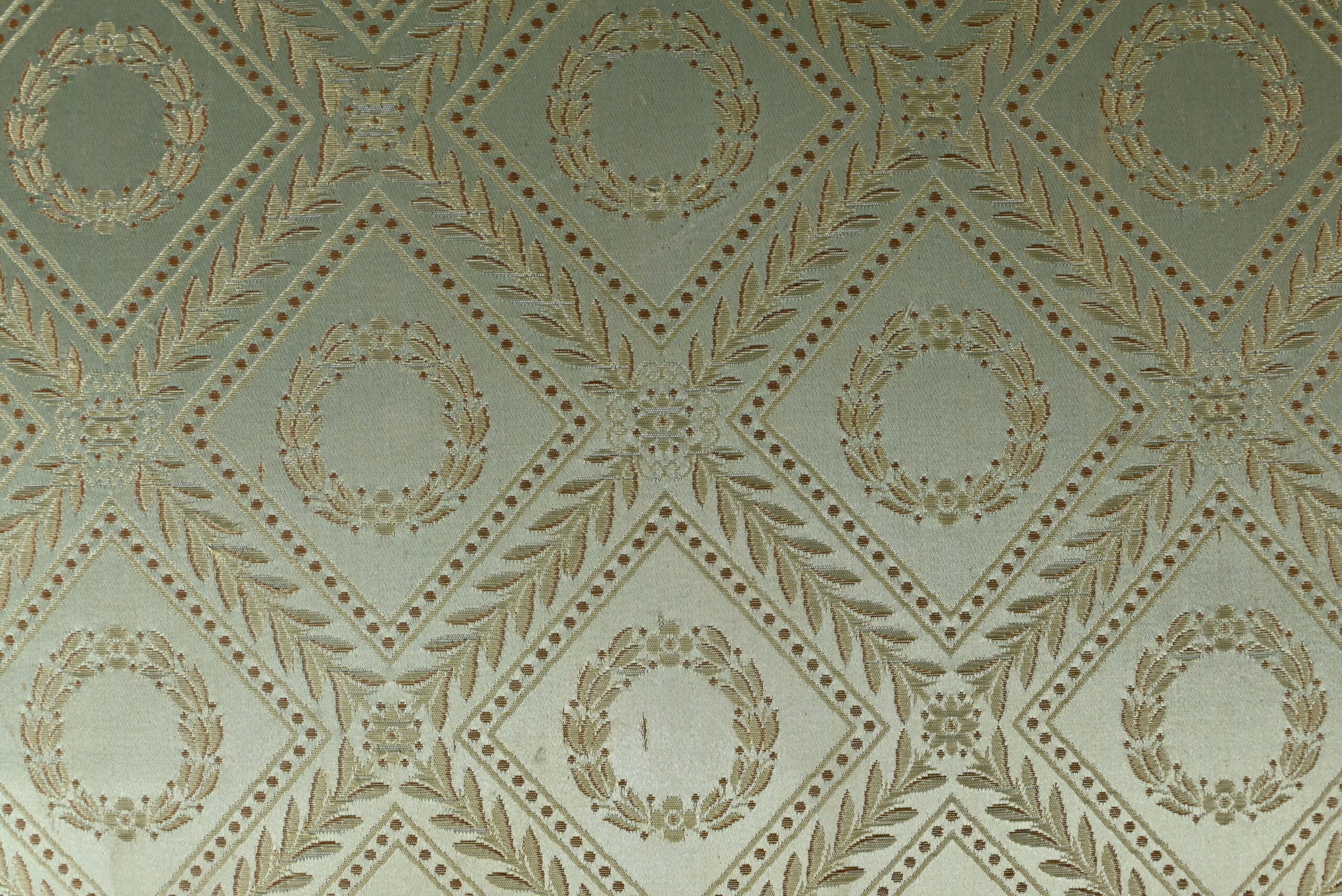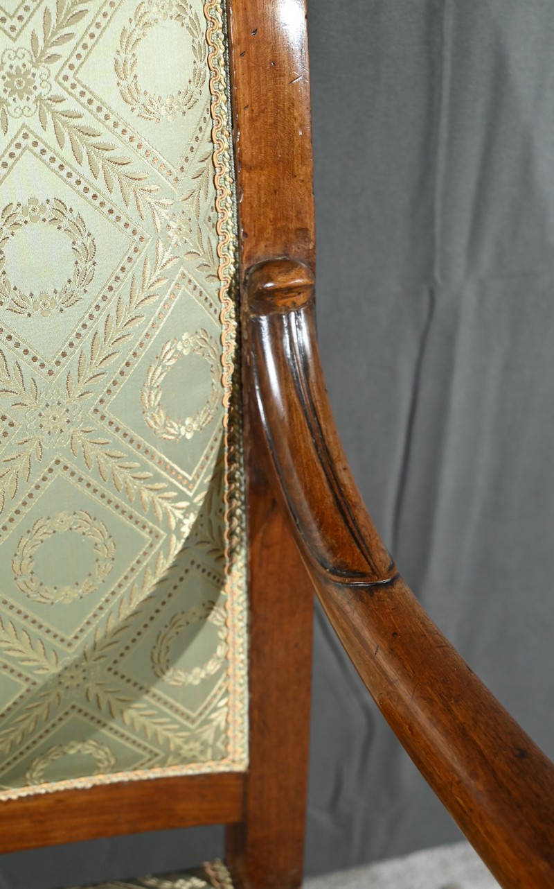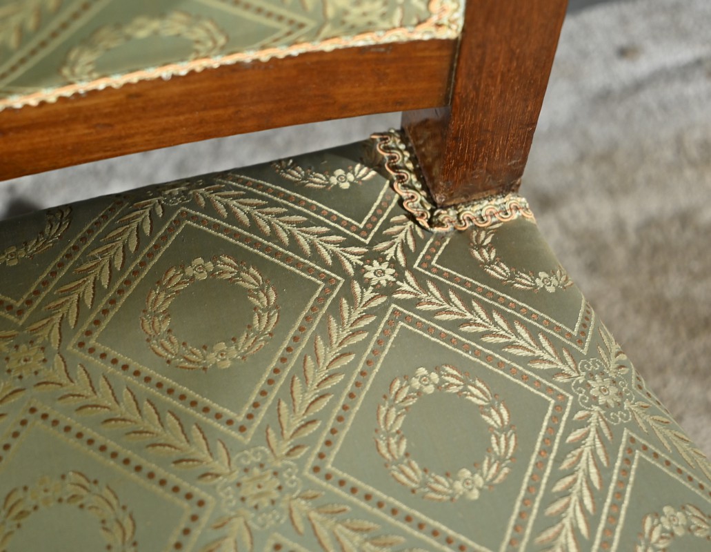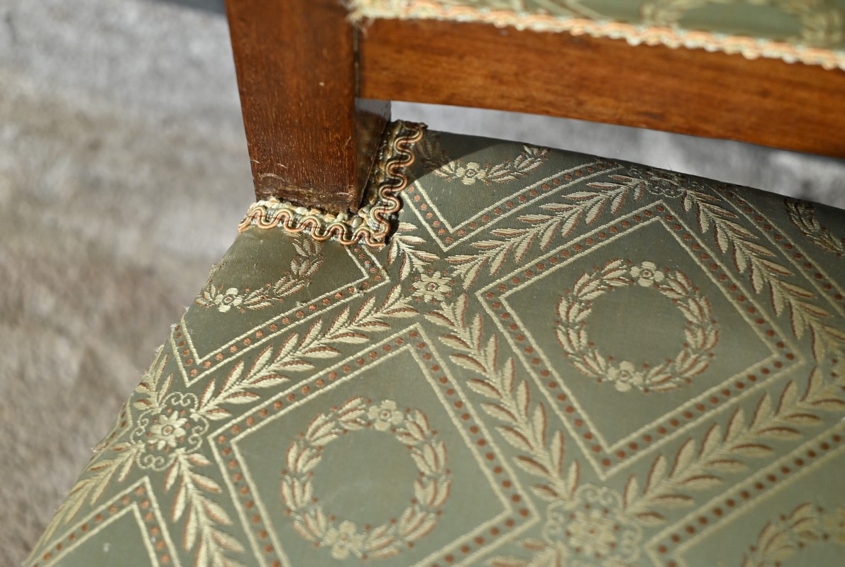 L’assise et le dossier sont habillés d’un tissu vert tendre à motifs de couronnes de laurier, en excellent état, souligné par un galon beige.