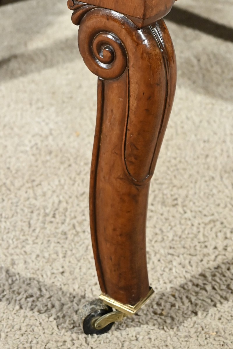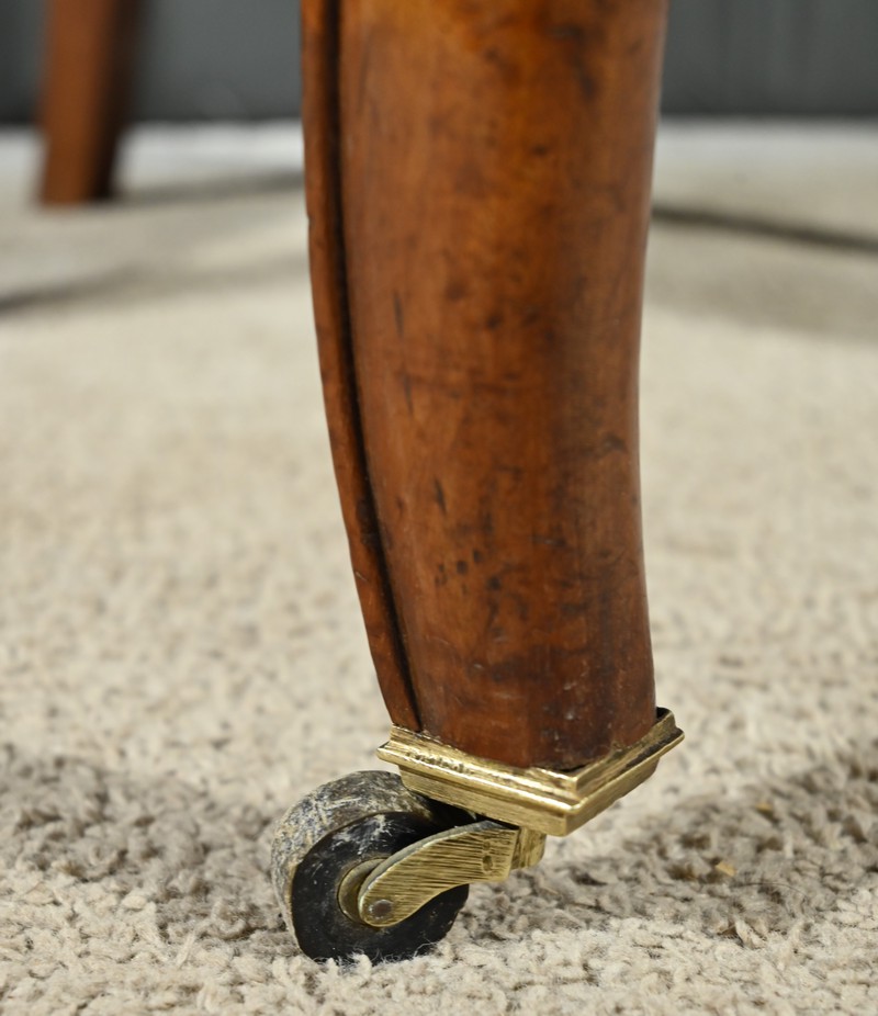 Ils reposent à l’avant sur des pieds à jarret mouluré en volutes avec roulettes et sabre à l’arrière.