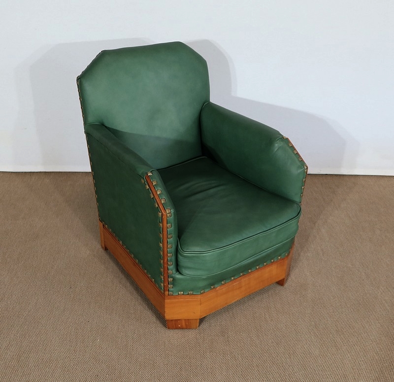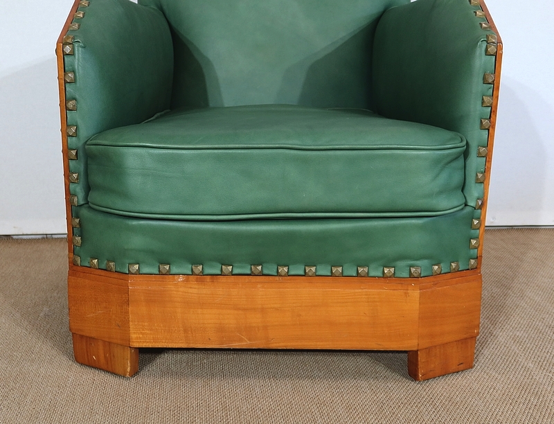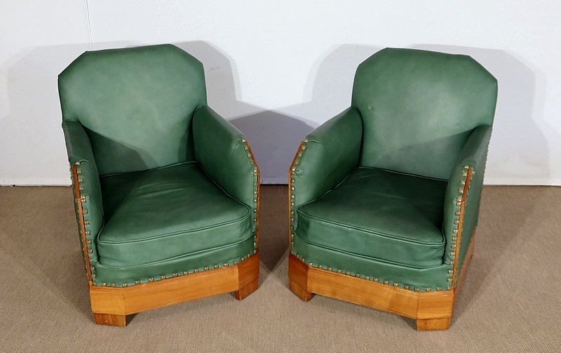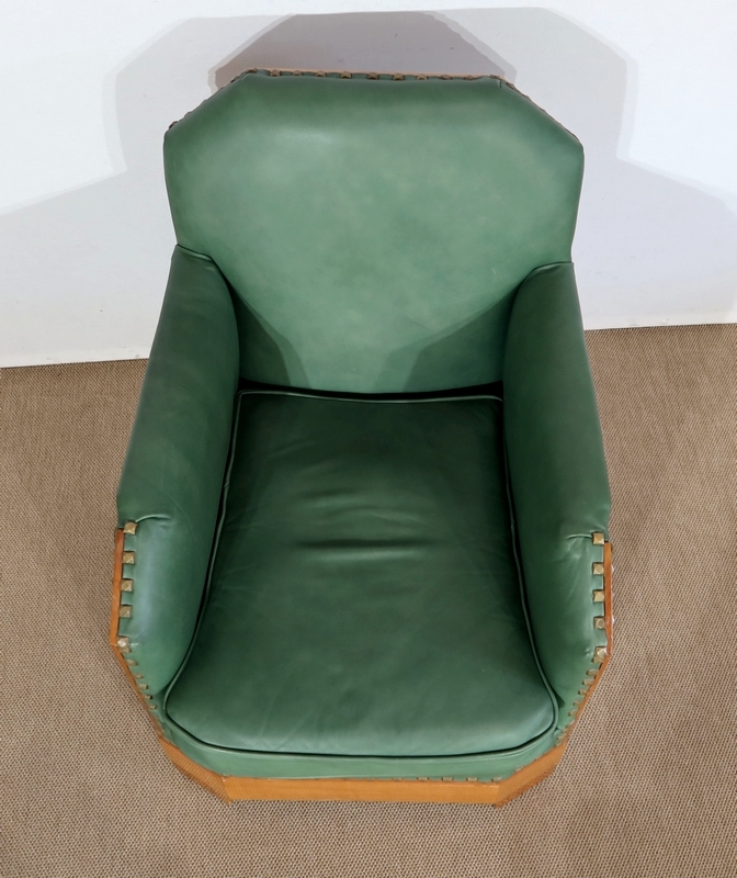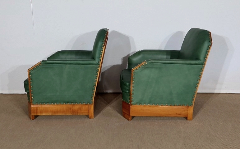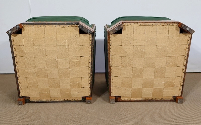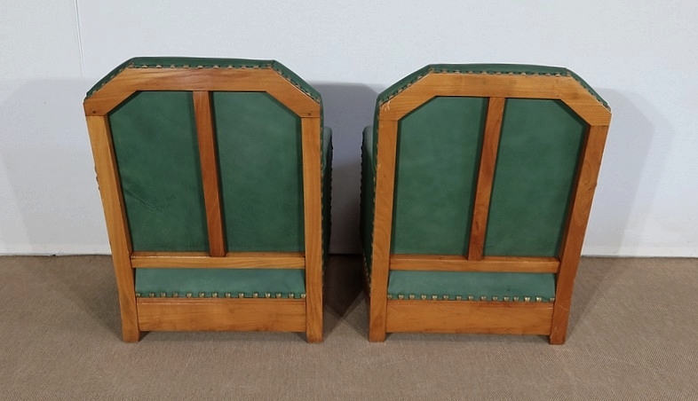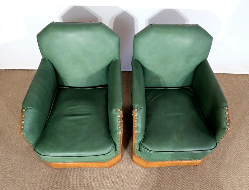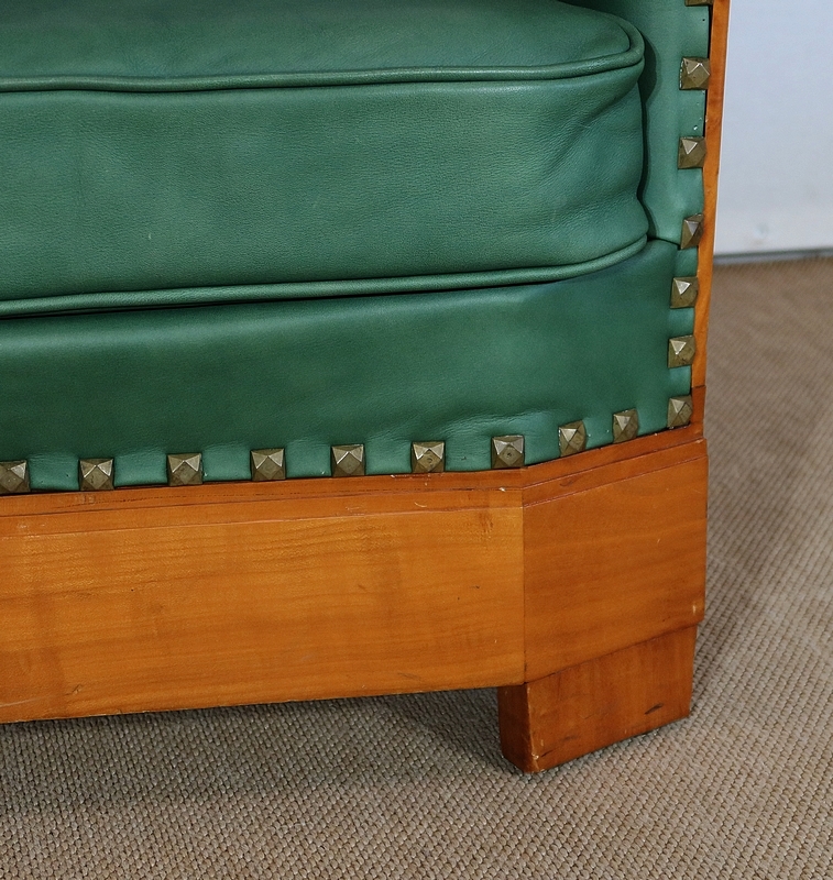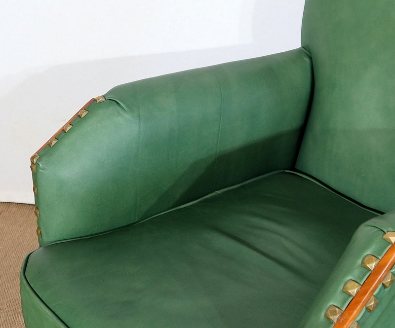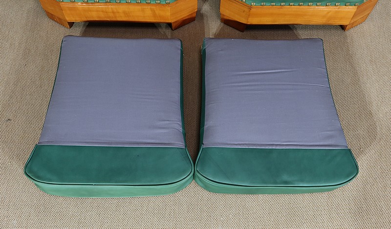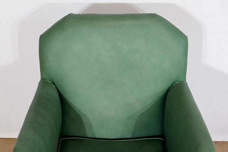 Chaque fauteuil bénéficie d’une ossature en merisier massif garnie d’un Similicuir de couleur « vert anglais ».