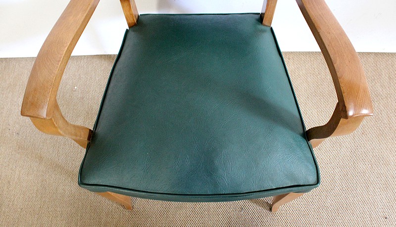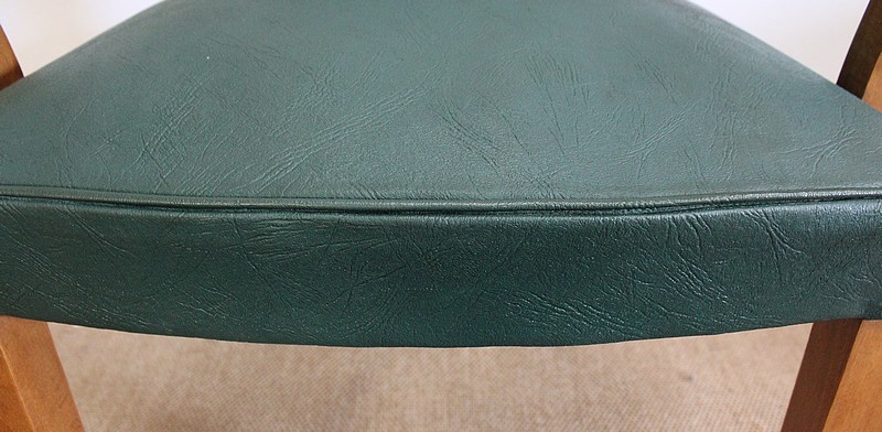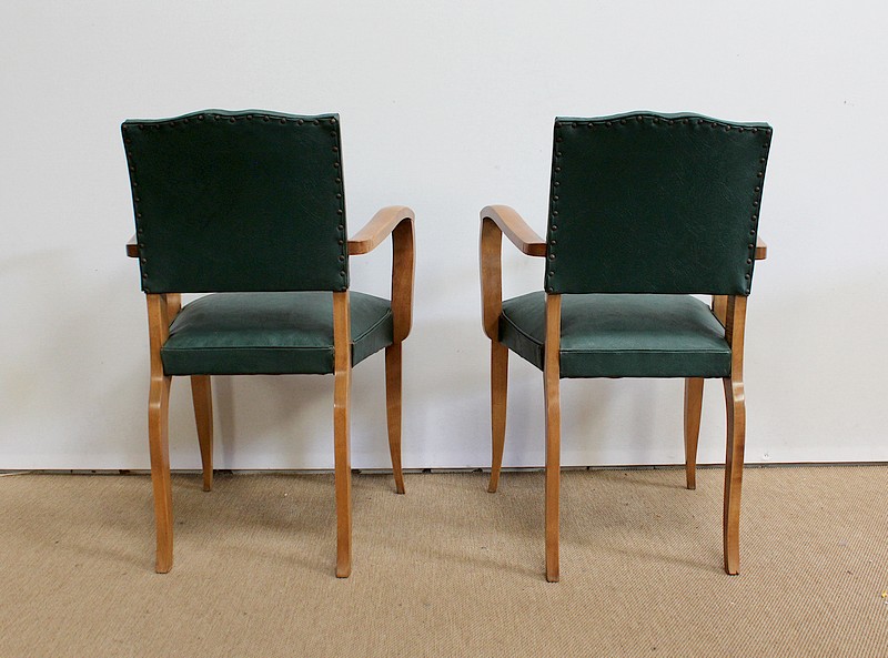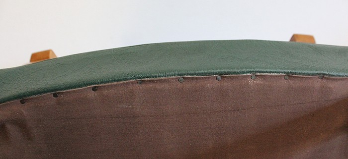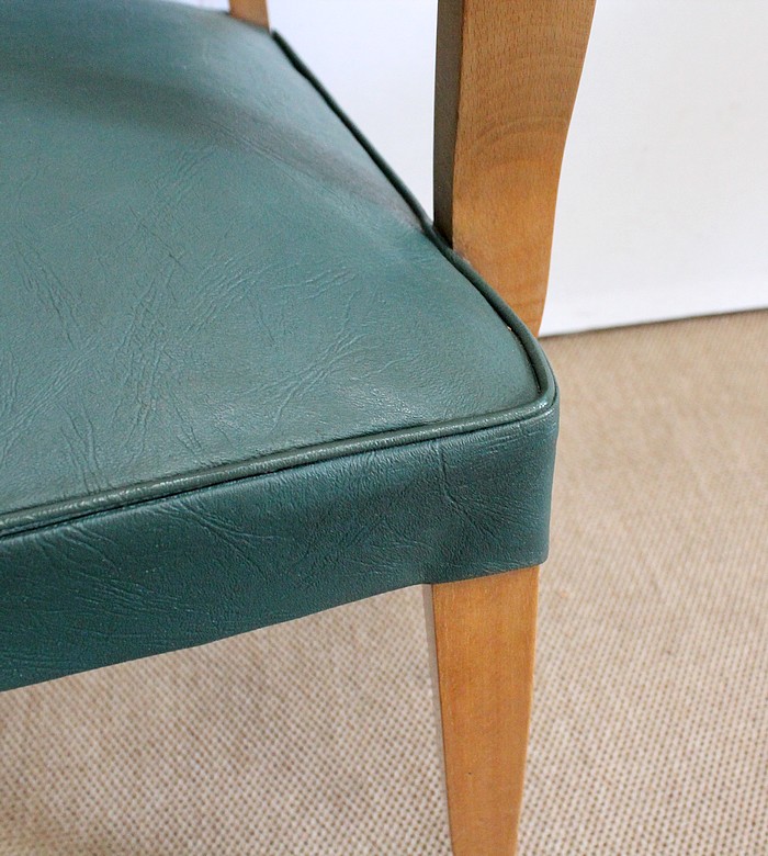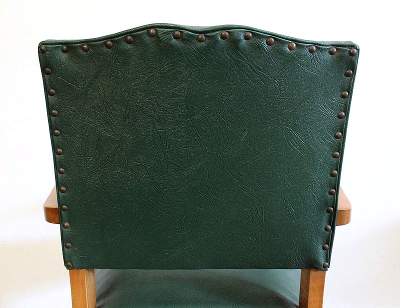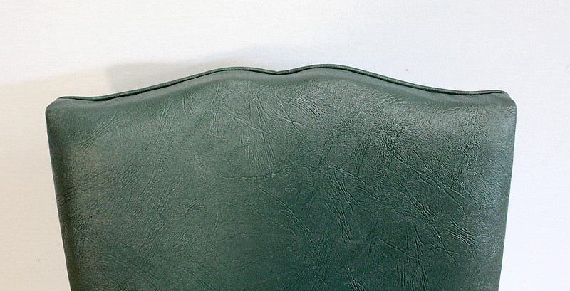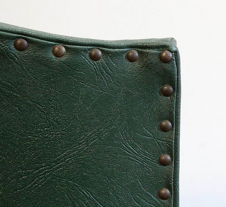 Garnies de Skaï Vert Mélèze entouré de Coutures Gansées et Cloutées au dos, ces Chaises présentent une Assise Ferme et un Dossier Restaurés dans notre Atelier.