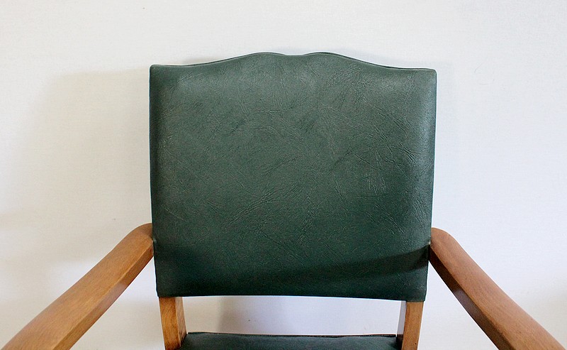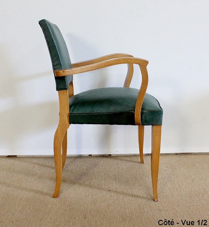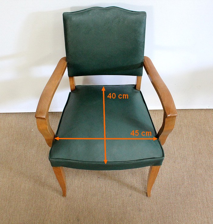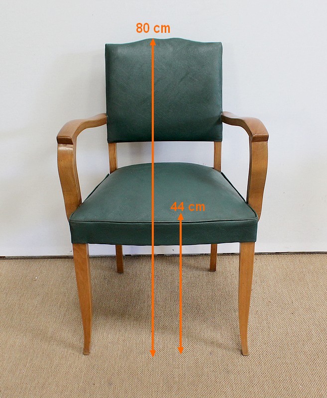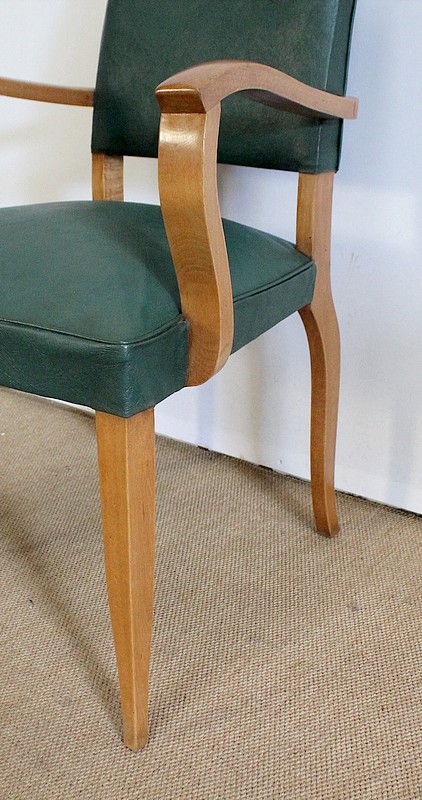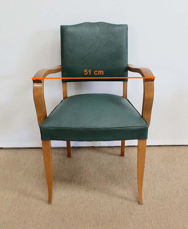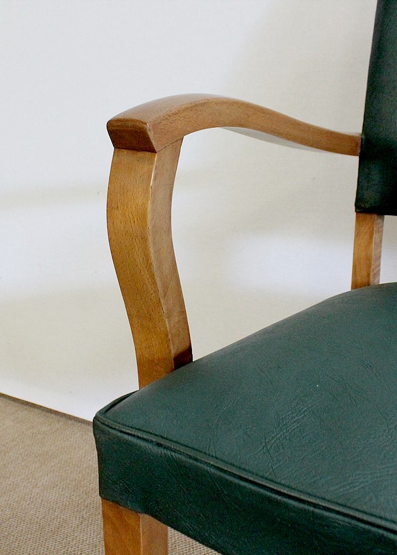 Garnies de Skaï Vert Mélèze entouré de Coutures Gansées et Cloutées au dos, ces Chaises présentent une Assise Ferme et un Dossier Restaurés dans notre Atelier.