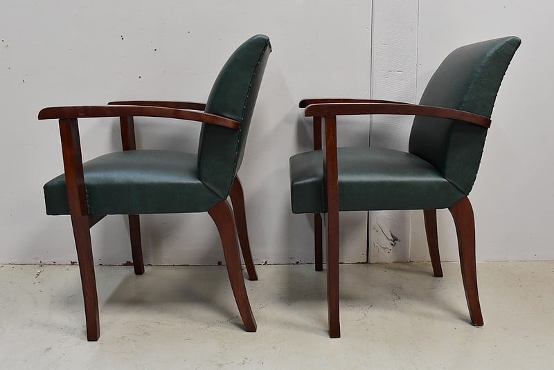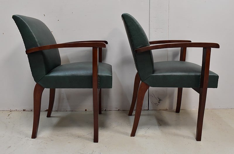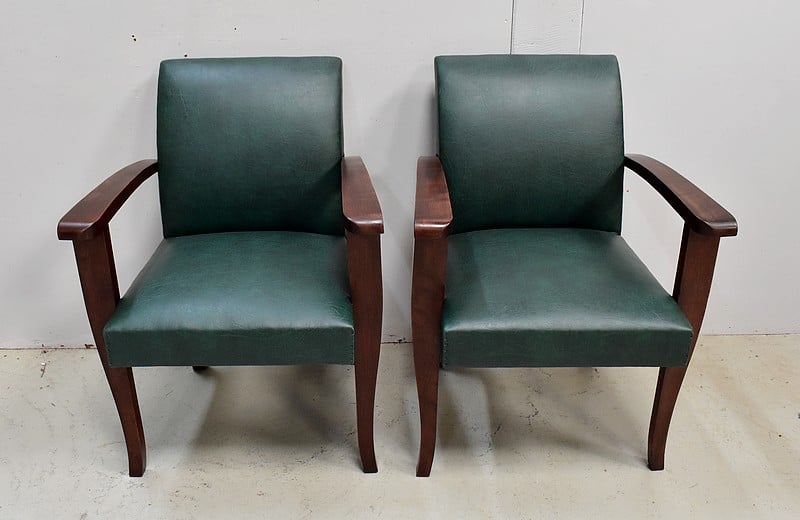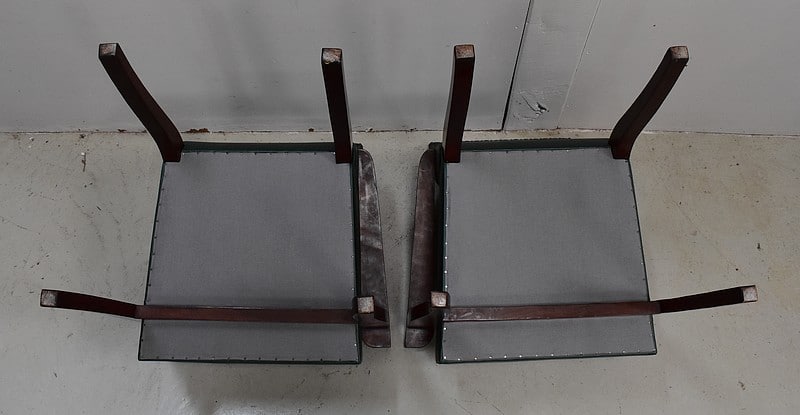 Ces Fauteuils d’hier, parfaitement adaptés aux Intérieurs d’aujourd’hui, ont bénéficié d’une restauration de Qualité. Ils constituent une Élégante Paire de Sièges qui pourra aussi bien être installée dans un Bureau que dans un Salon, ou encore aux extrémités d’une Table.