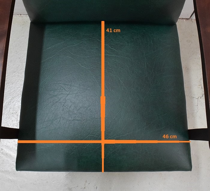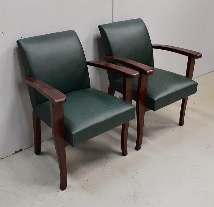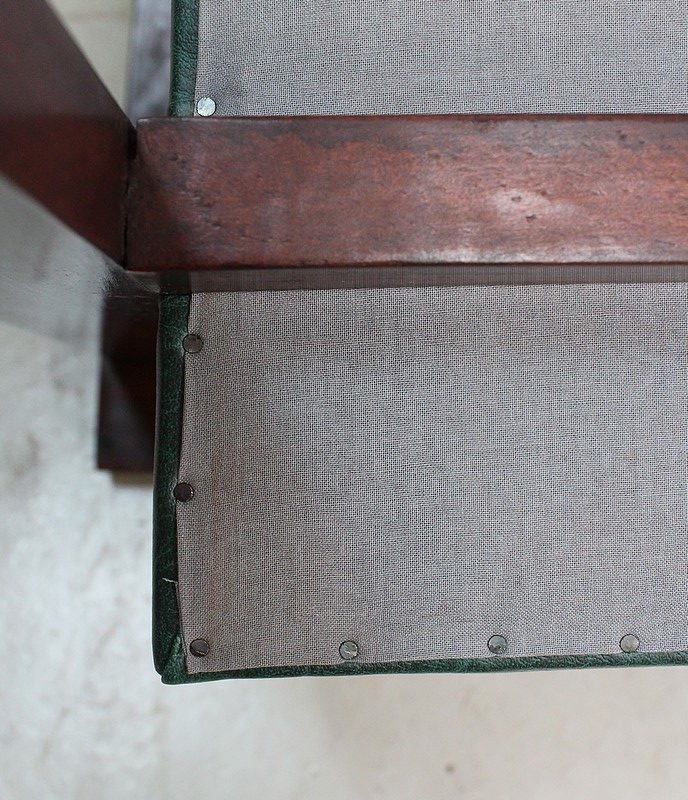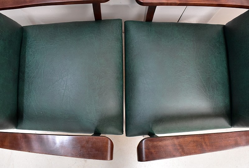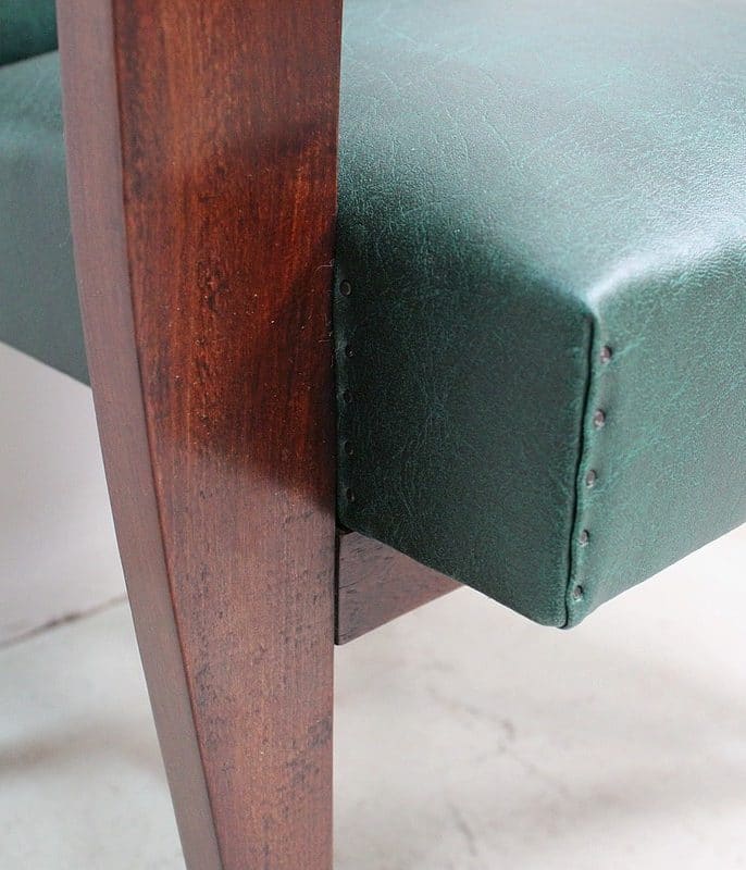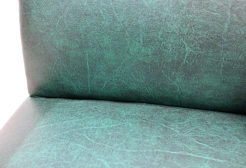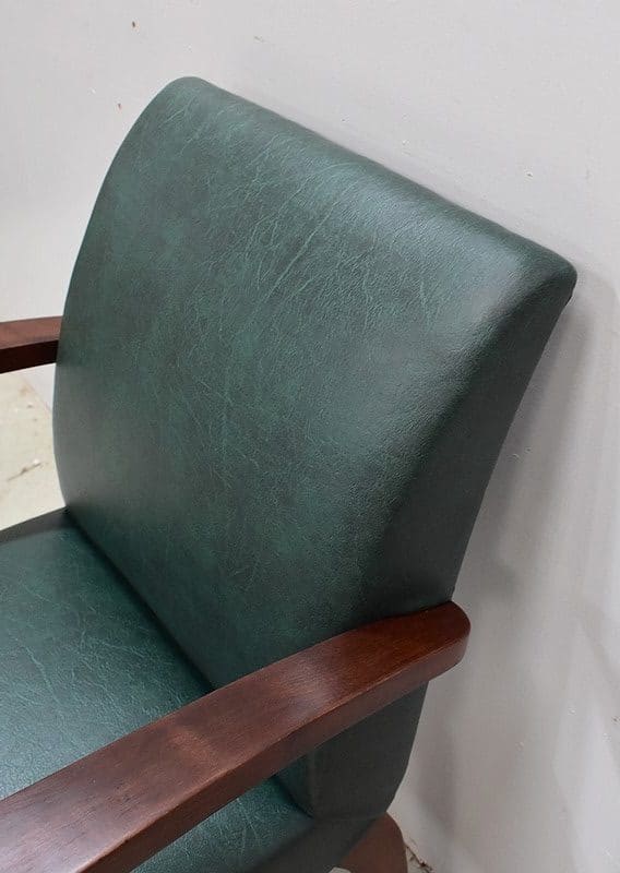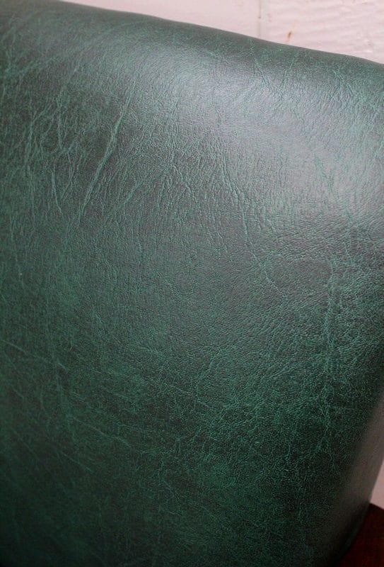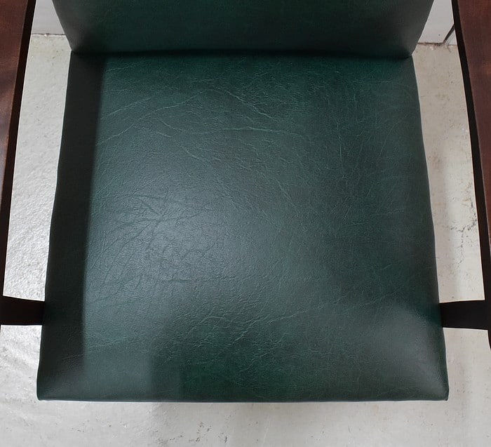 Les dossiers, sensiblement inclinés, ainsi que les assises, sont confortablement garnis. Ils sont recouverts d’un joli Skaï couleur Vert Forêt, très tendance. Ce revêtement, actuel mais artisanal, est à finitions Clous sur l’arrière des dossiers.